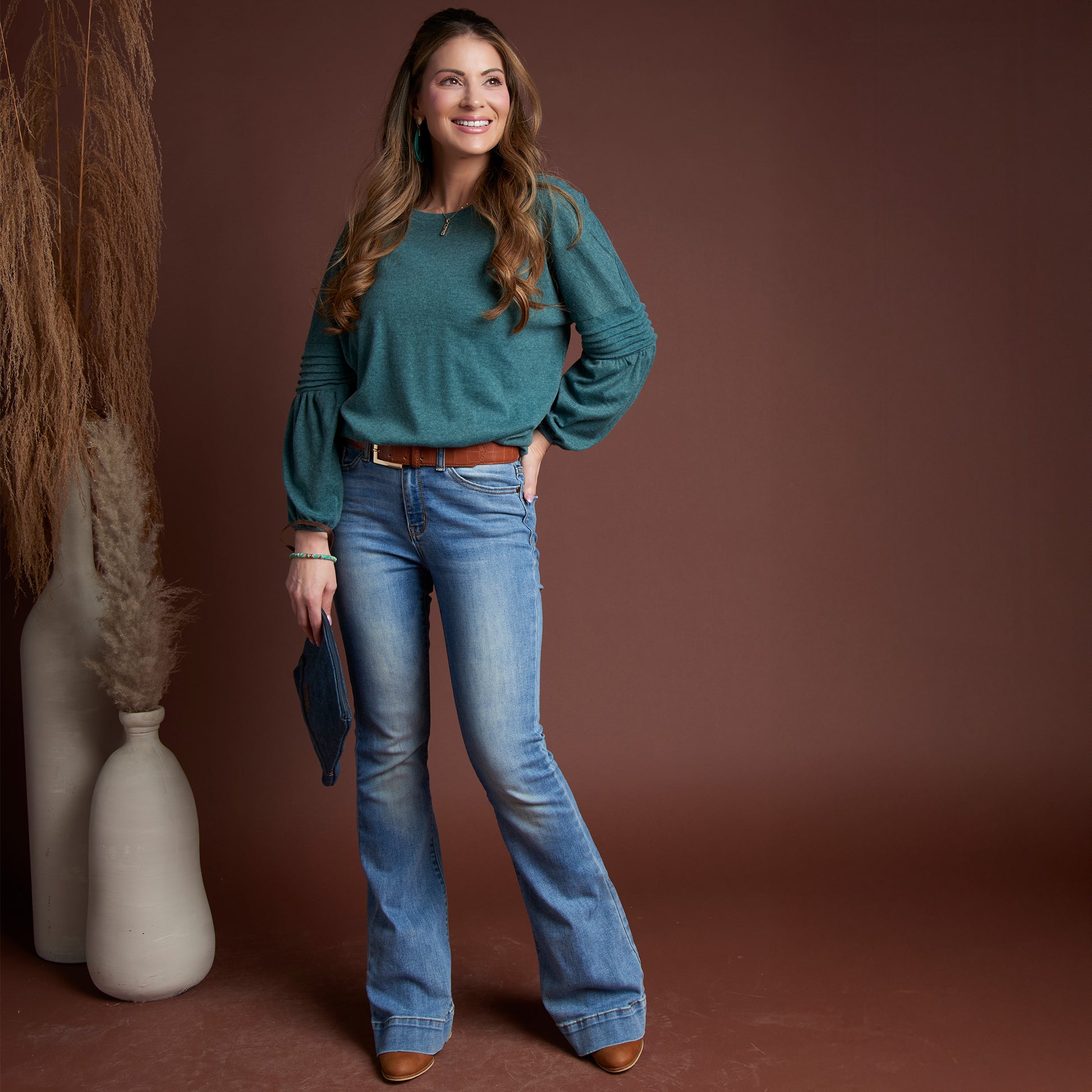 Add a bit of color to your wardrobe with the Carson Pleated Bishop Sleeve Top. Featuring a gorgeous heather jasper teal tone with fun pleated bishop sleeves and light jersey knit, this top makes for the perfect fall layer.
