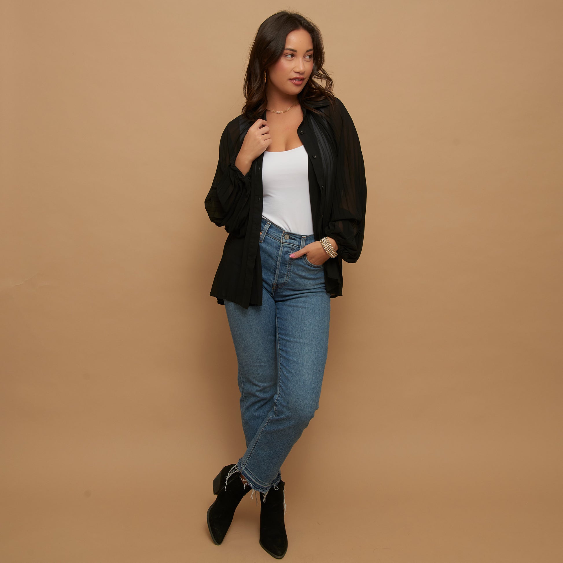 Perfect for when the days start to get colder! The Essie Pleated Button Up Blouse features a lightweight accordion pleated fabric in a chic jet black, with button detailing, flowy shape, and elegant collar. Pair with your favorite trousers for an elevated look.