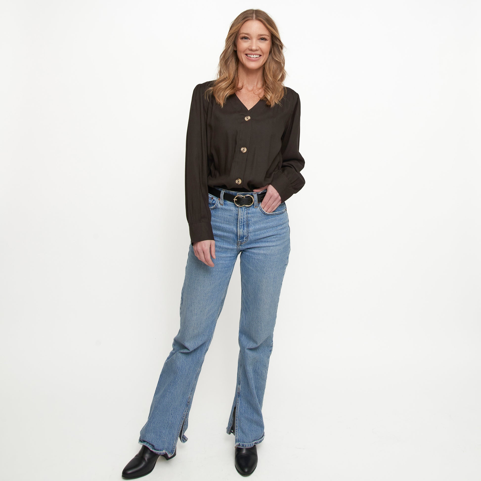 Who said work attire has to be boring? The Izara Front Button V-Neck Blouse features a chic jet black hue with cute button detailing leading to a lovely v-neck collar. Paired with your favorite trousers or skirt, this blouse is certain to add a bit of interest to your wardrobe.
