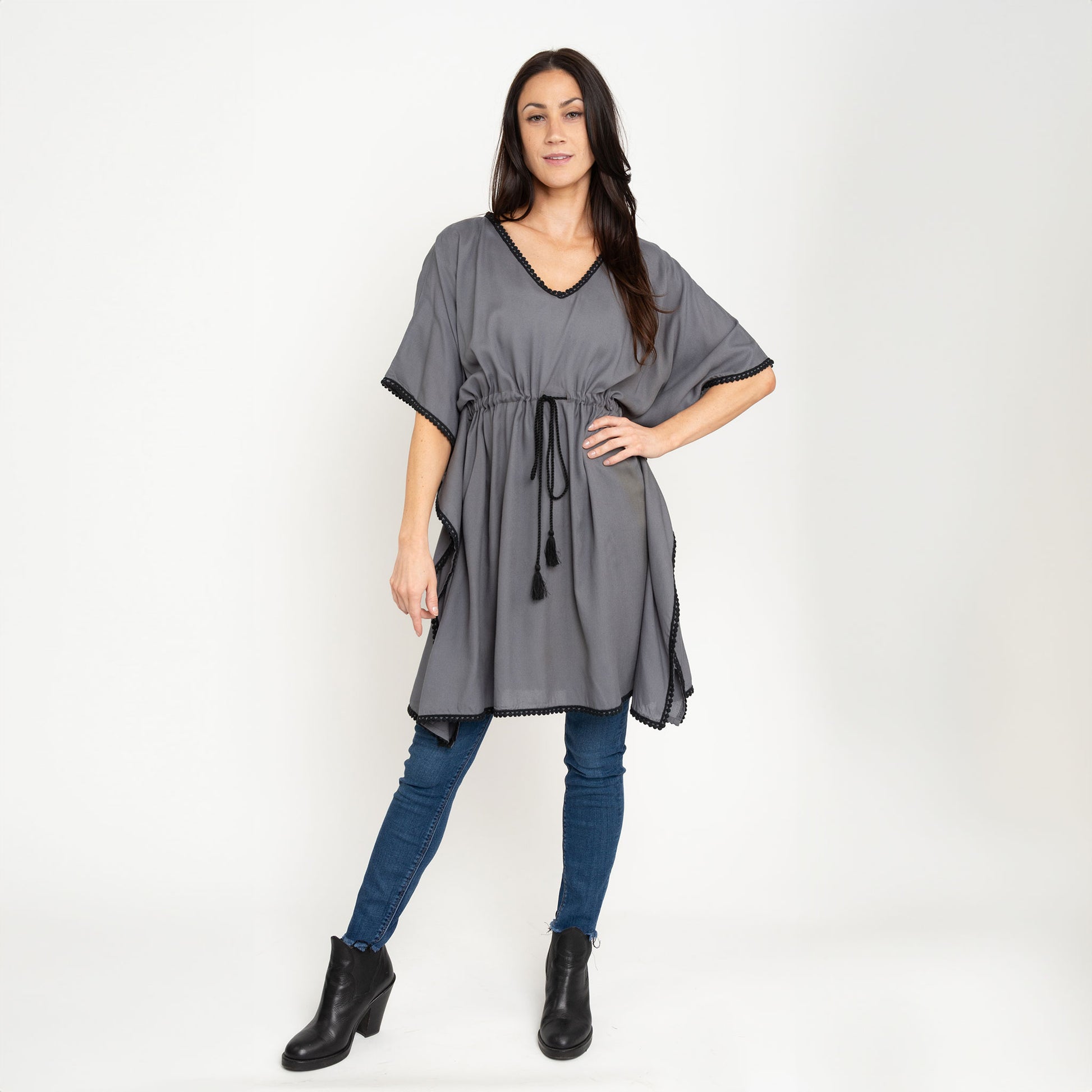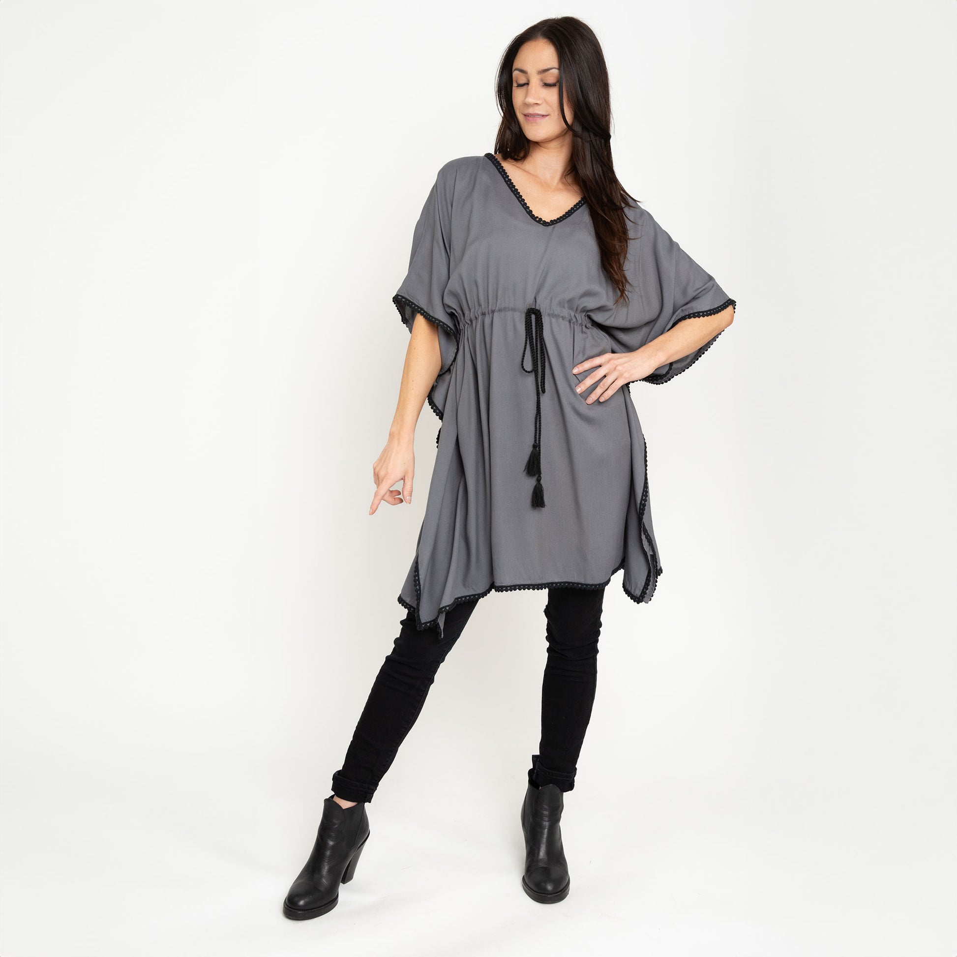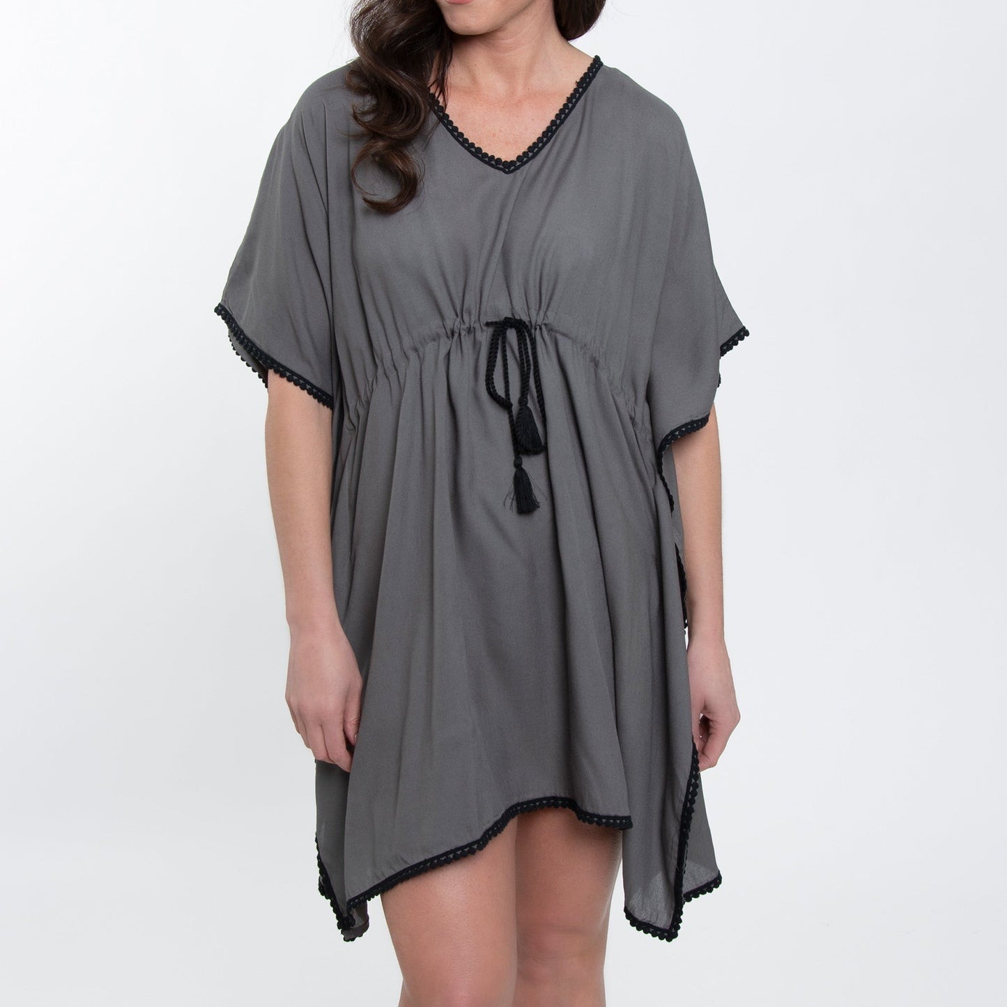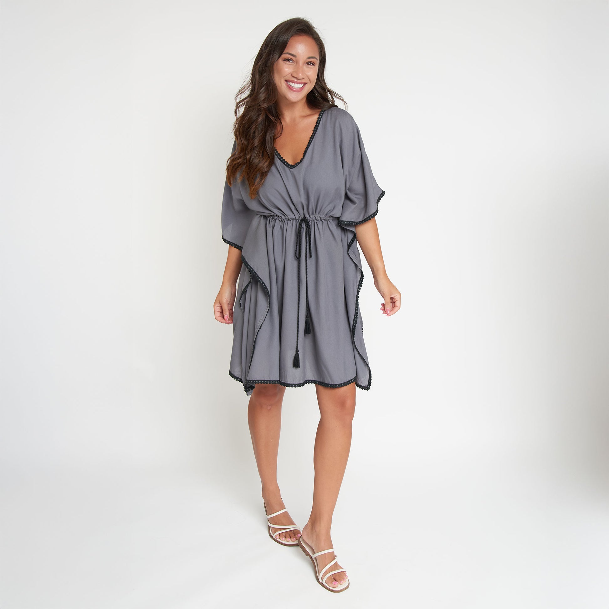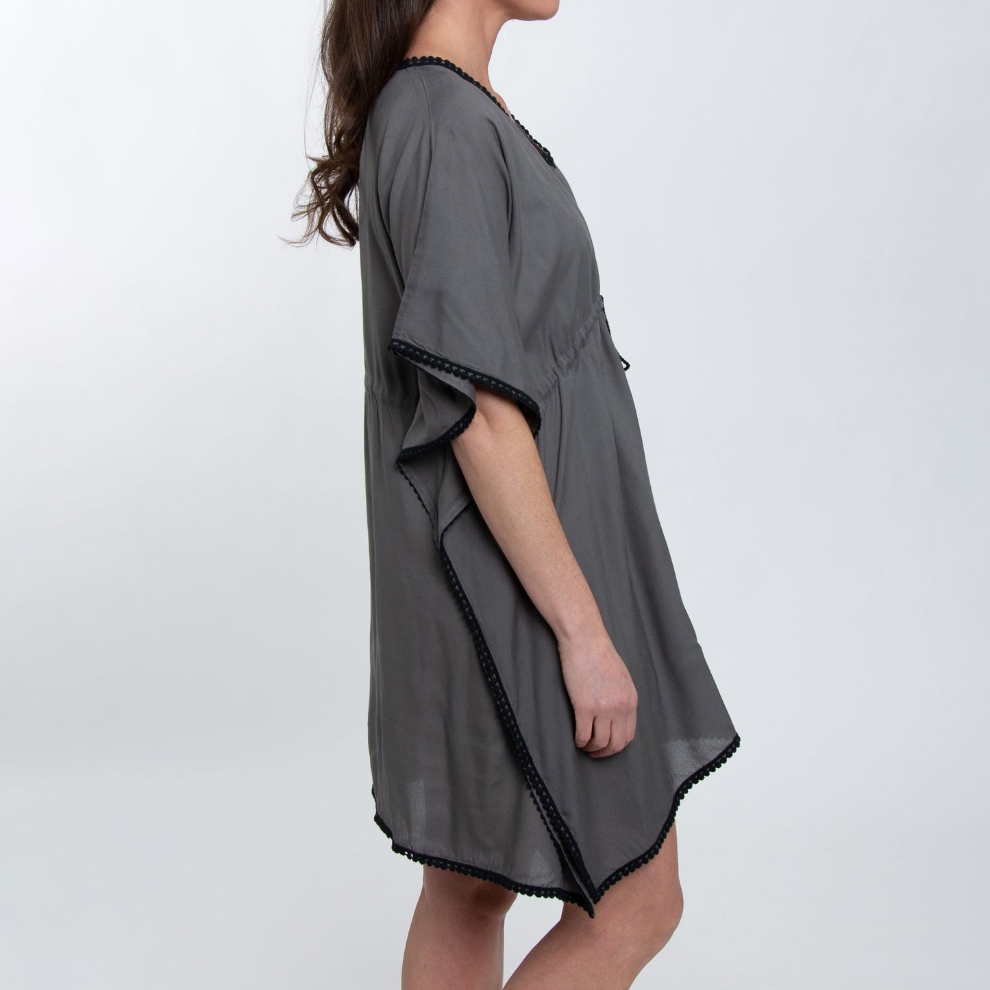 The perfect summer accessory! The Nesli Drawstring Cover Up features a lightweight fabric with flattering drawstring waist and cute pom-pom detailing. Slip it on over your favorite swim suit and you're ready for the beach!