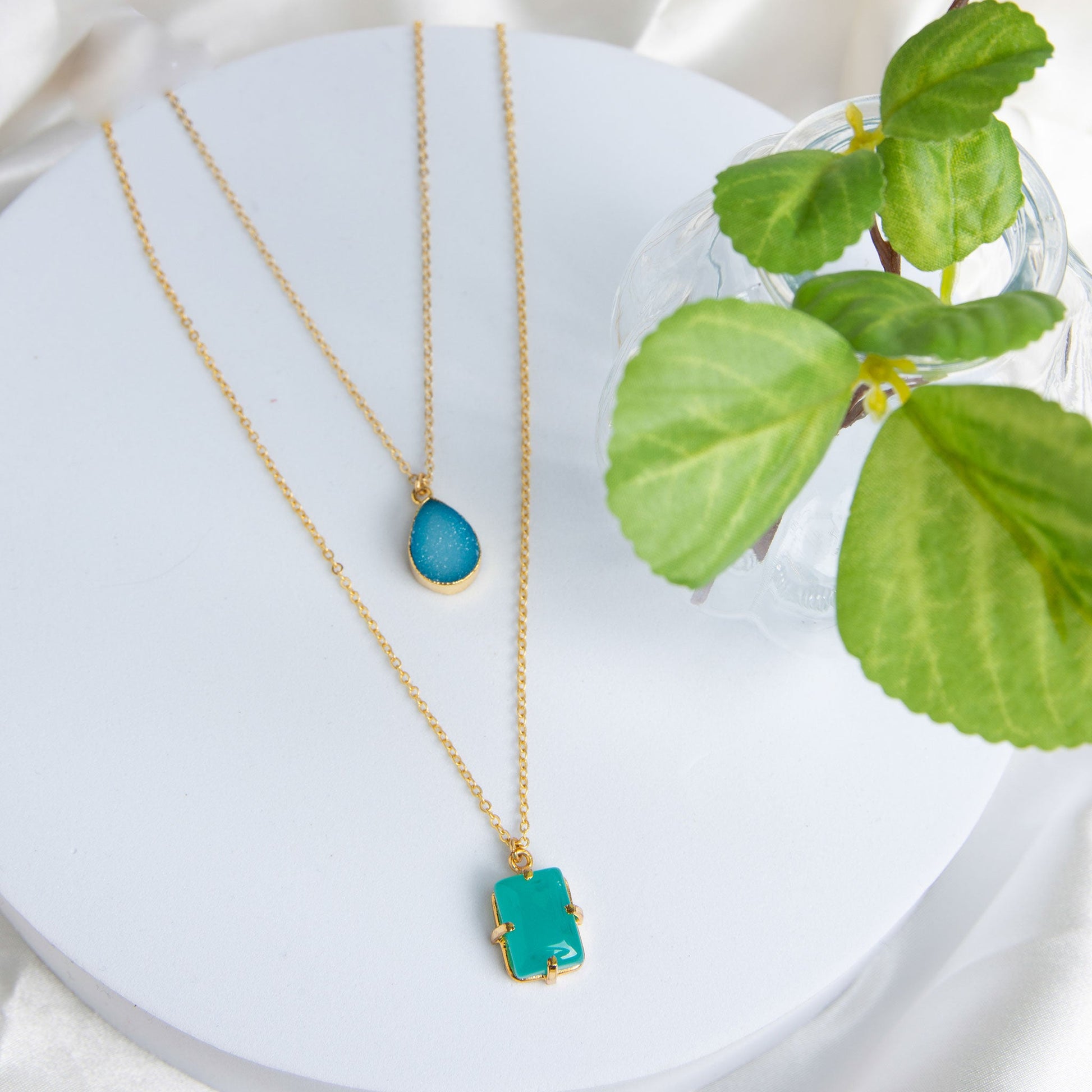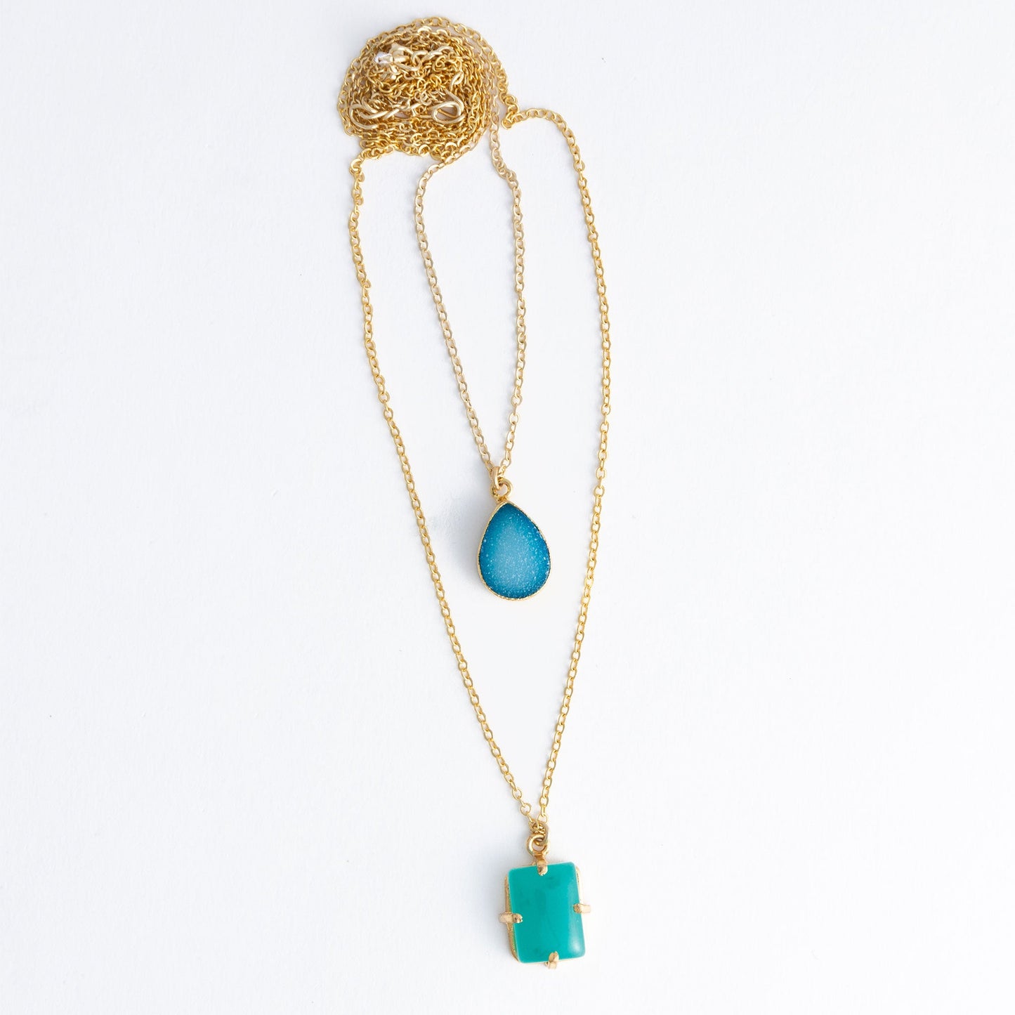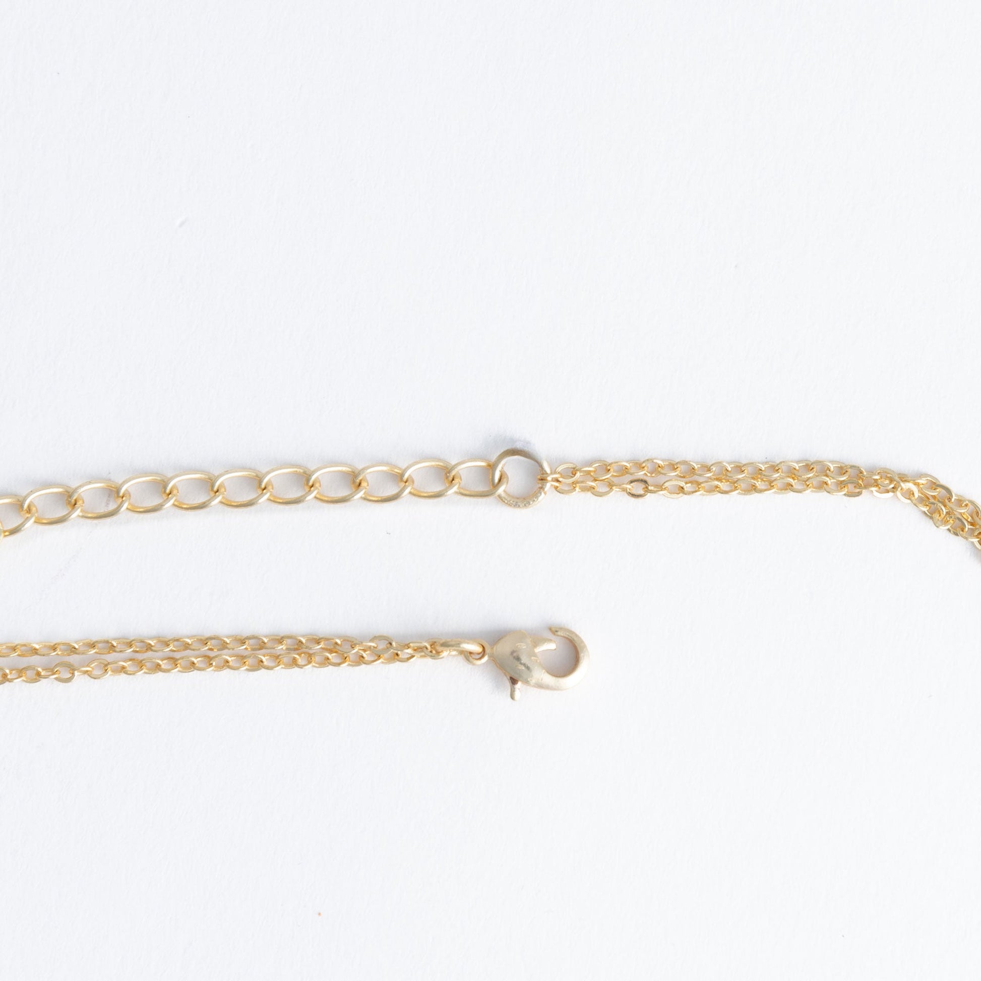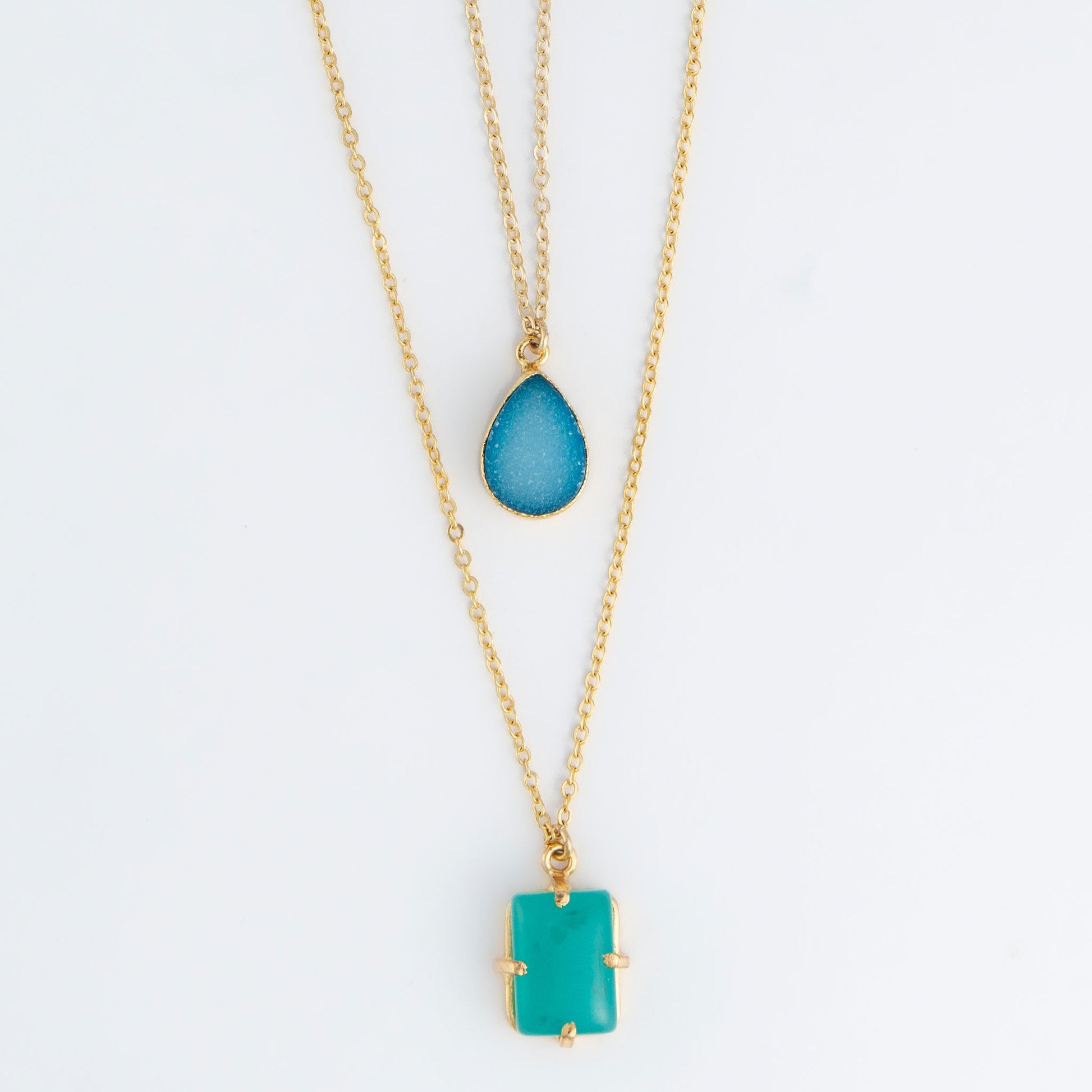 Love to layer! The Ezra 18k Gold Layered Stone Pendant features two rows of delicate 18k gold plated chains and two genuine Green Chaledony stone pendants. Wear alone or easily layer with additional pieces, this necklace adds a fun touch to any jewelry collection.