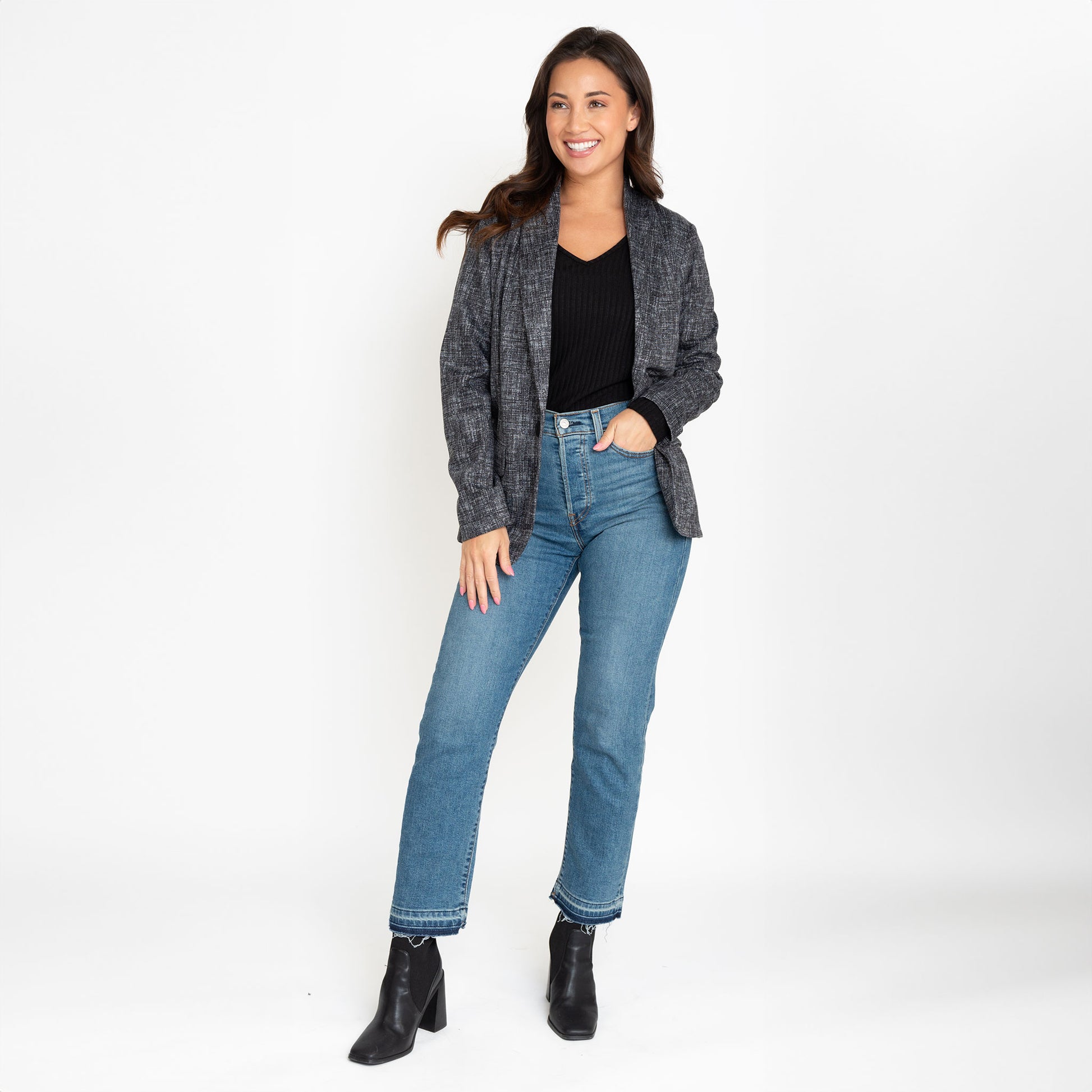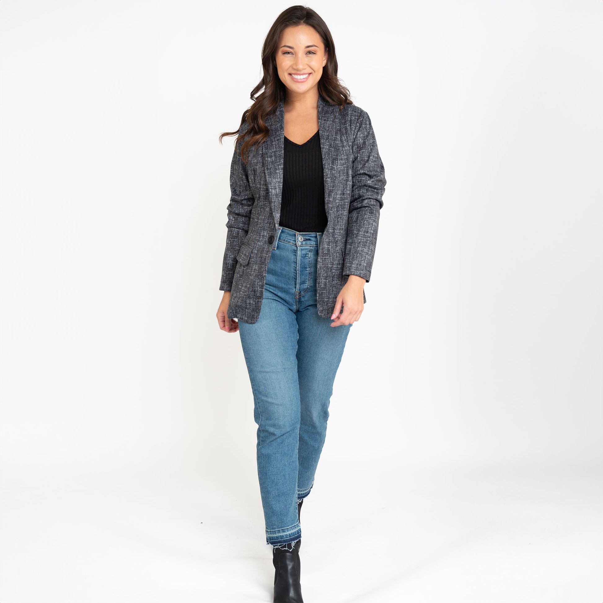 Dress any outfit up with the Gemma Stretch Blazer. Featuring a gorgeous heathered black with front buttons, back vent, and pockets, this stretchy blazer is both comfortable and chic.