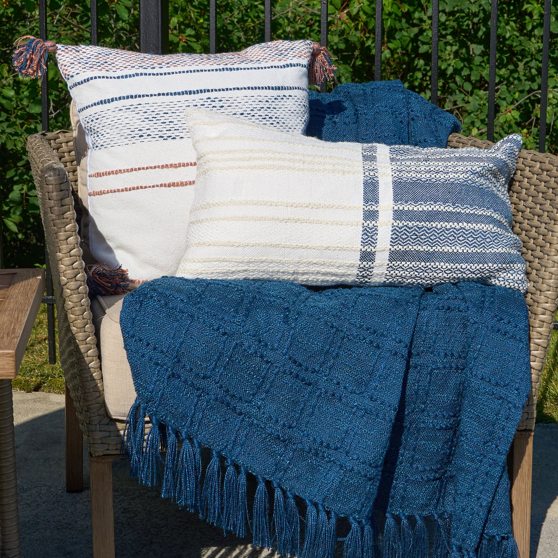 Add a bit of interest to your outdoor living space with the Genevieve Handwoven Indoor/Outdoor 12x22 Lumbar Pillow. Featuring a crisp blue and white, this handwoven lumbar pillow is made from recycled plastic bottles and is UV protected, ensuring a longer outdoor life. Its zipper opening makes it a breeze to clean. If you've been looking for the perfect outdoor throw pillow, this is it.
