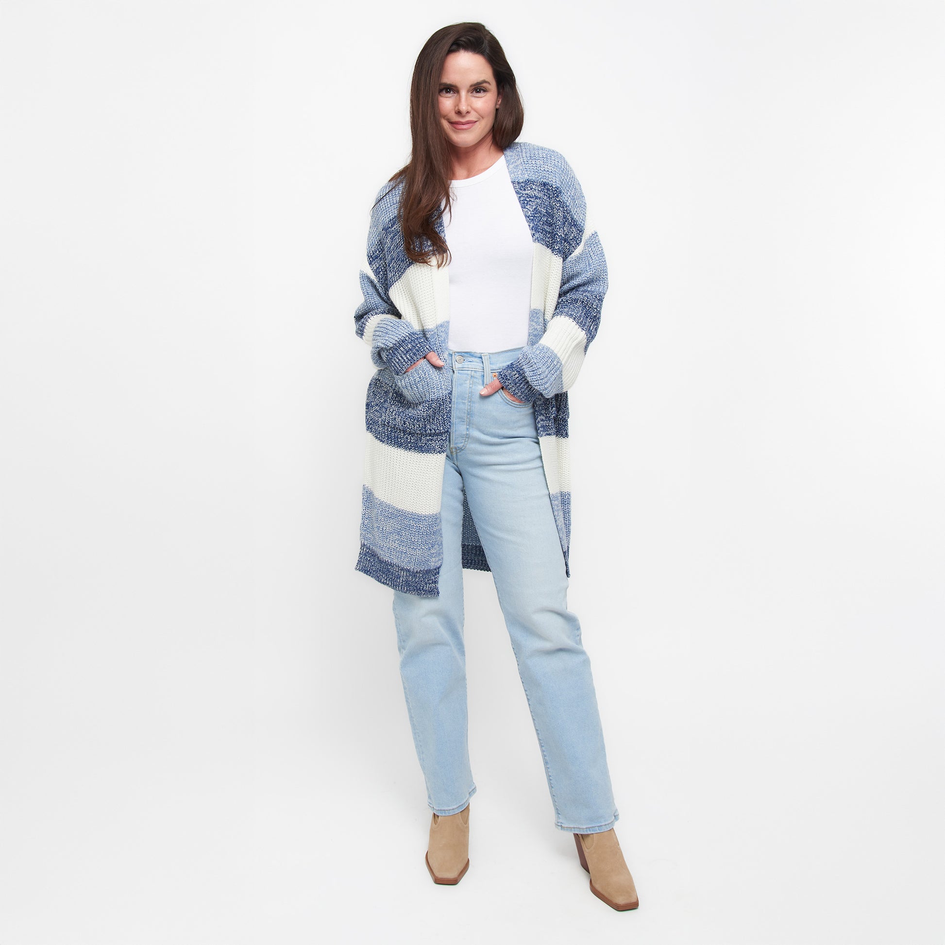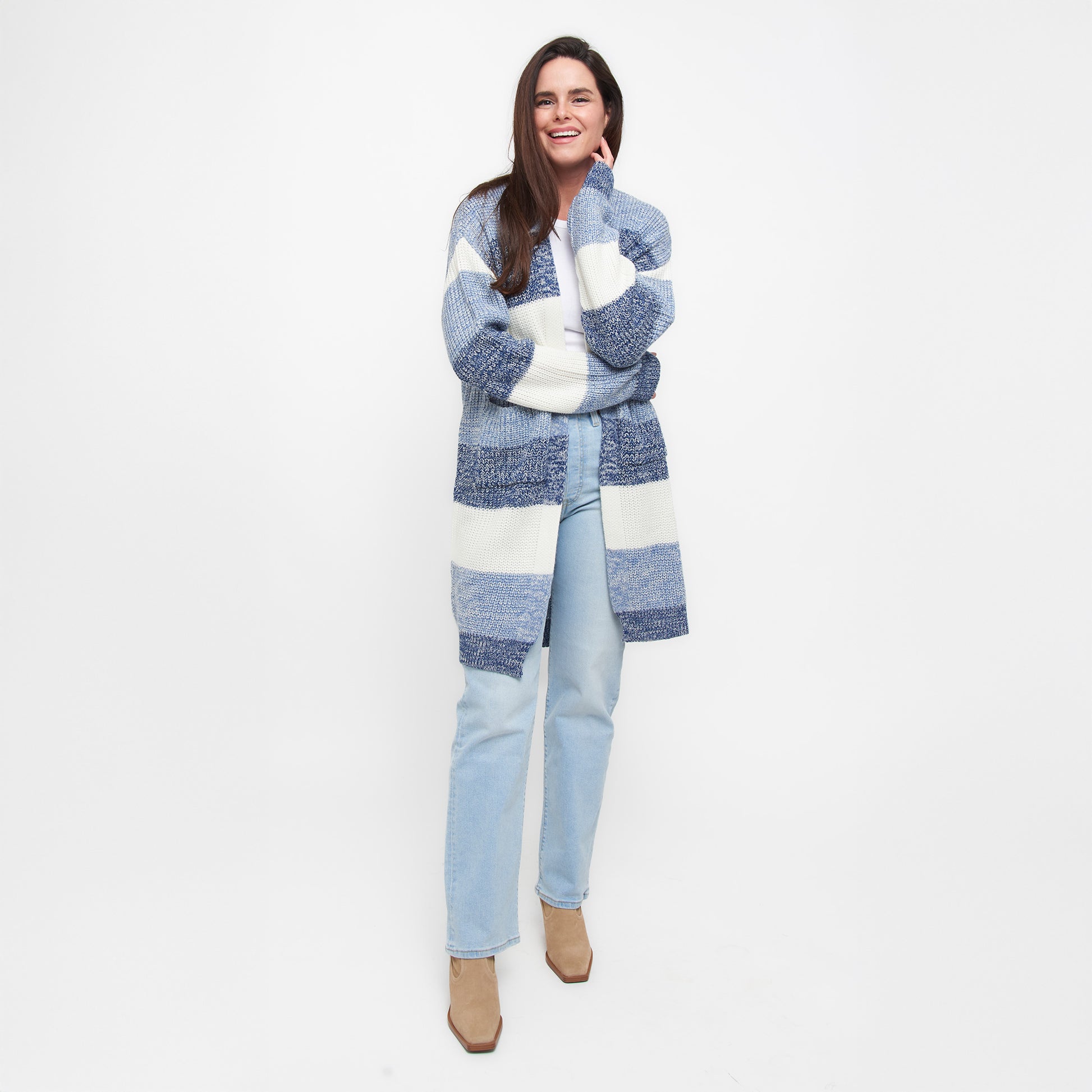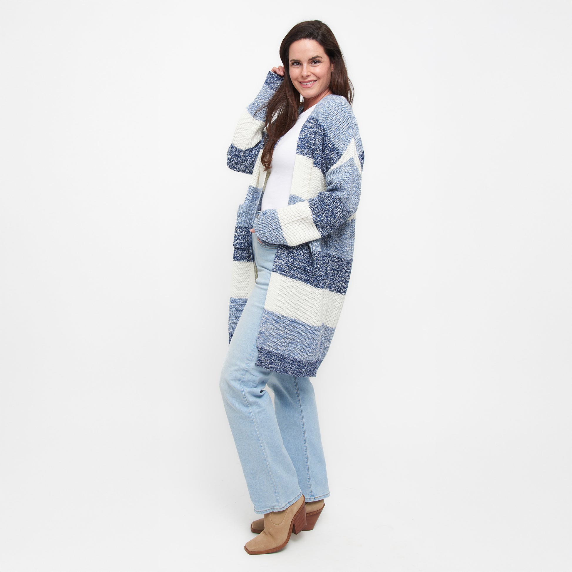 Stay cozy and stylish with the Greyson Color Block Cardigan. Featuring a super soft and cozy heathered knit with an on trend color block stripe and patch pockets, this cardigan is an absolute cool weather staple.