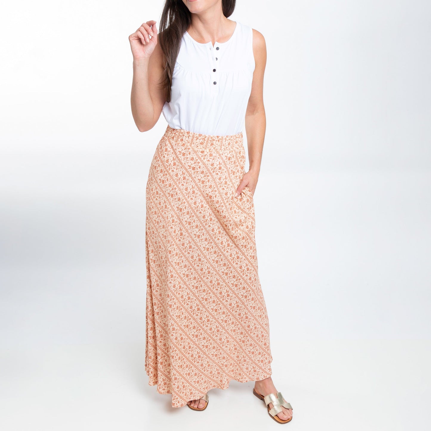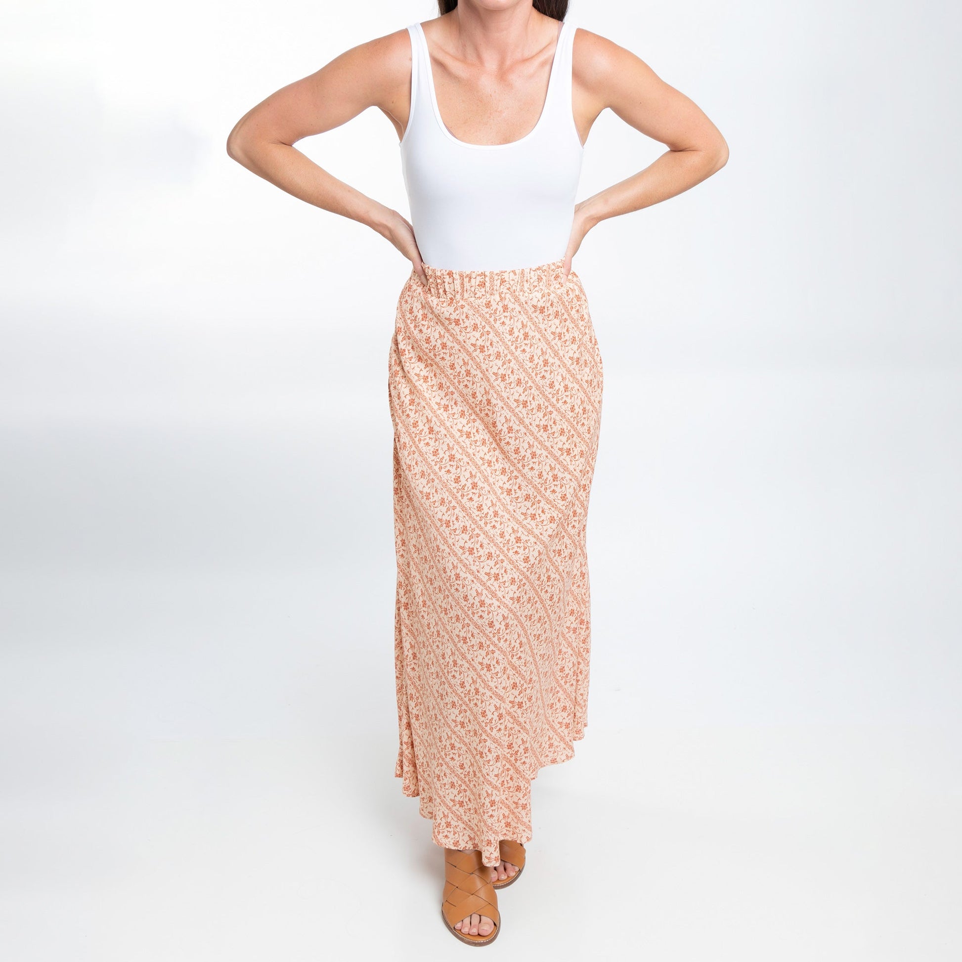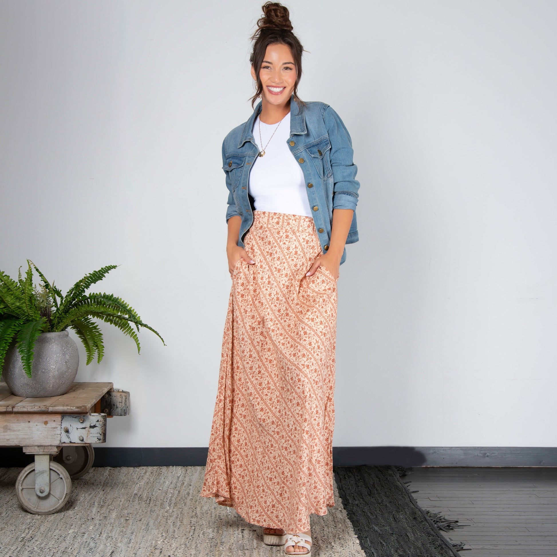 A summer essential, the Halle Maxi Skirt features a gorgeous amber floral pattern, comfortable elastic waistband, and pockets. This lightweight and easy to wear skirt will easily become your new favorite.