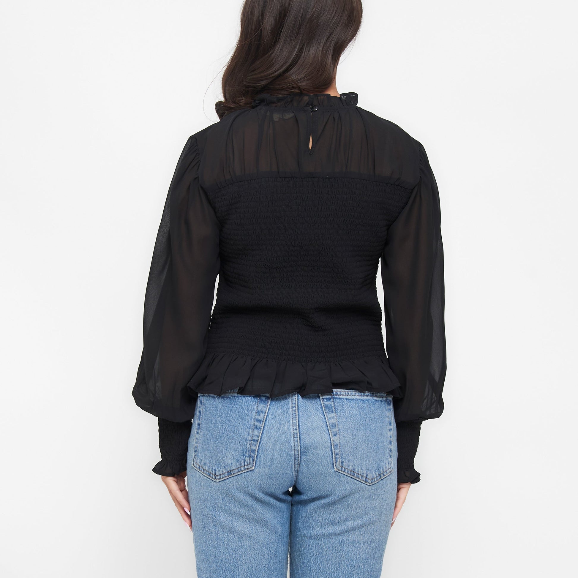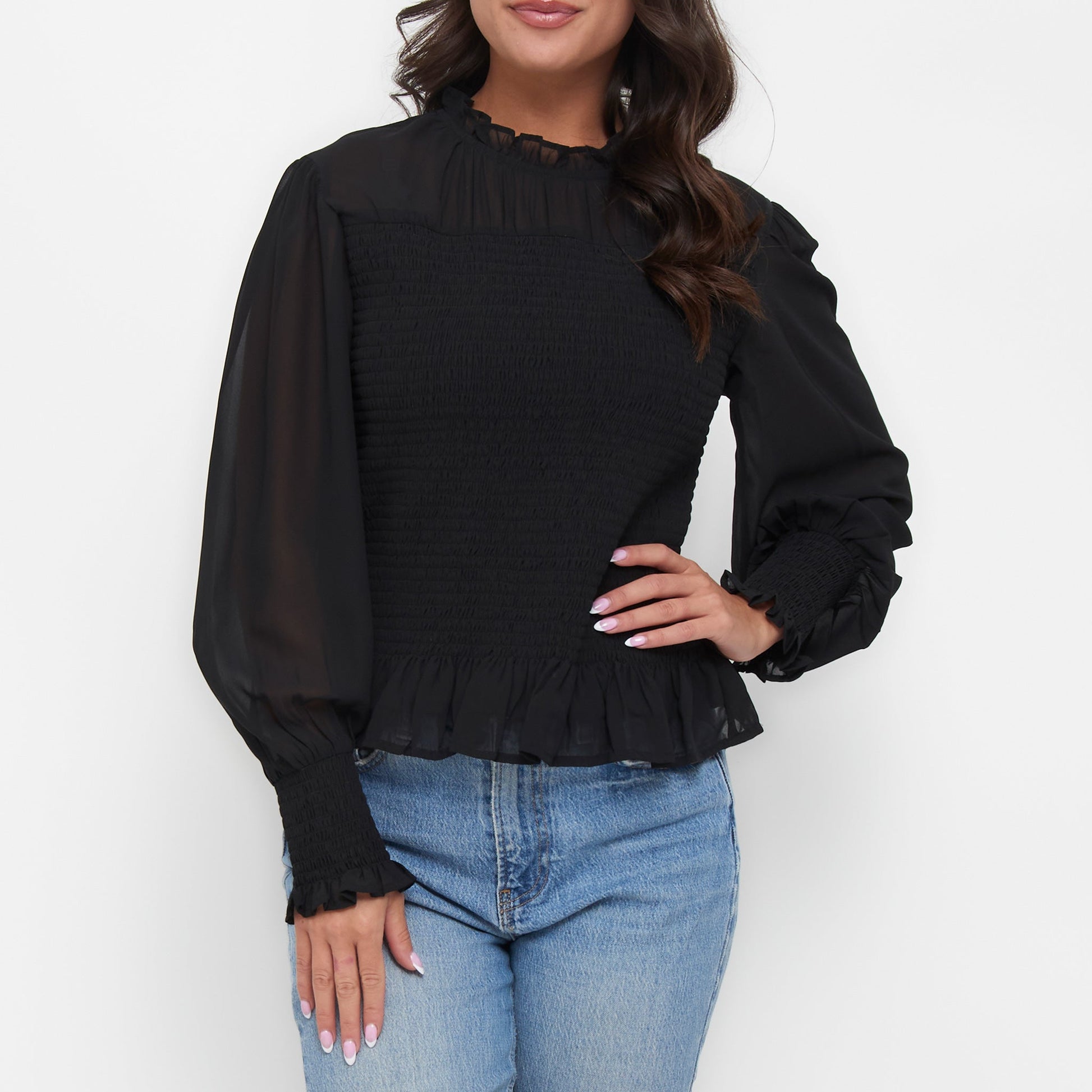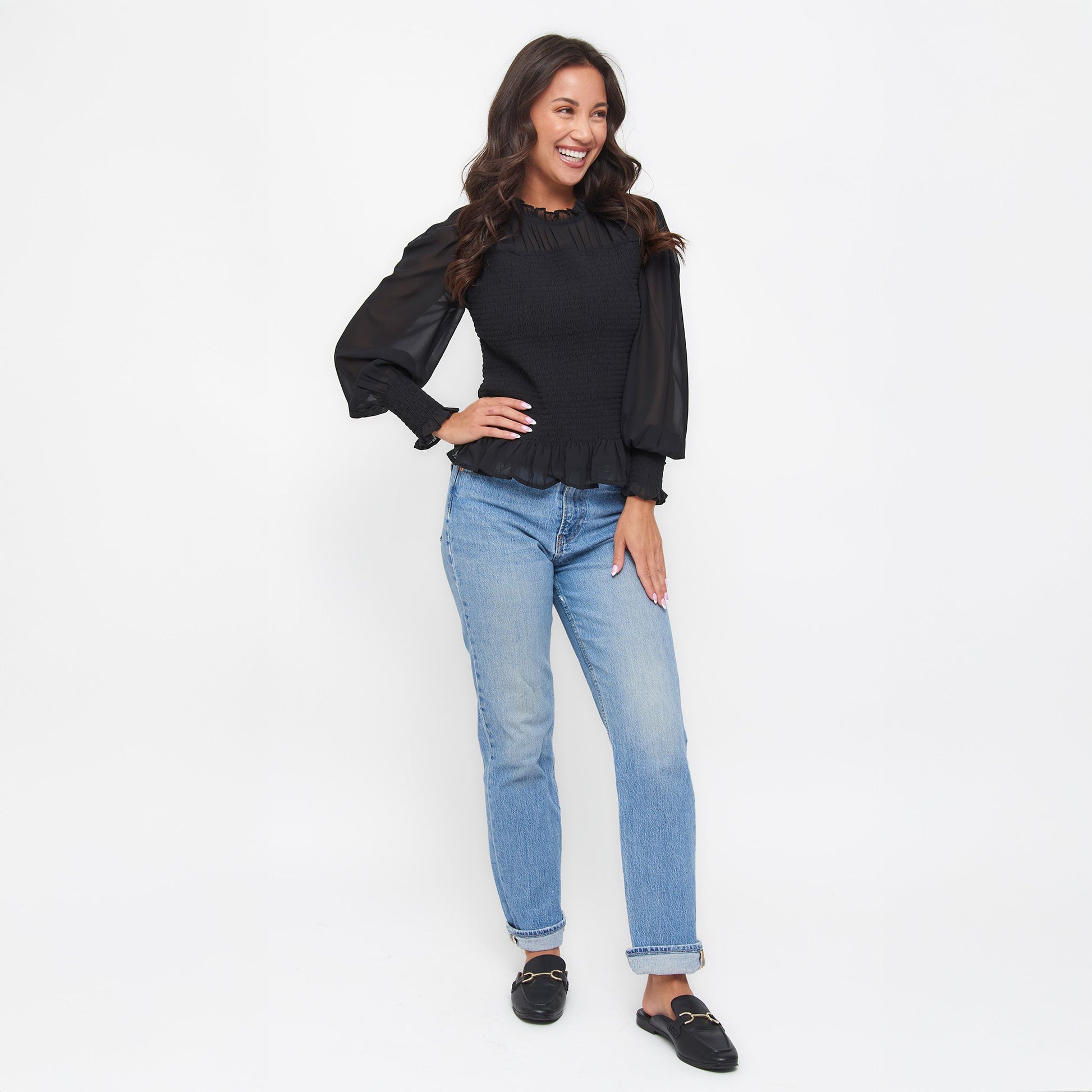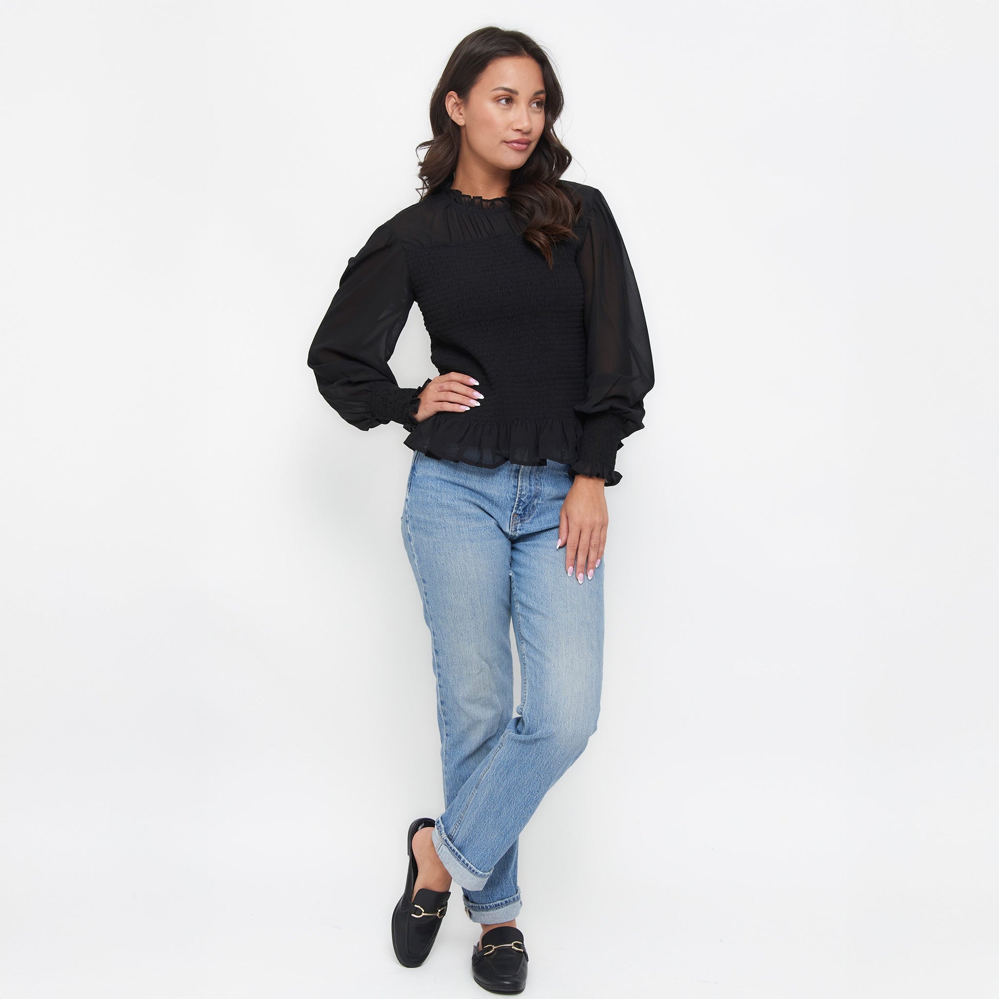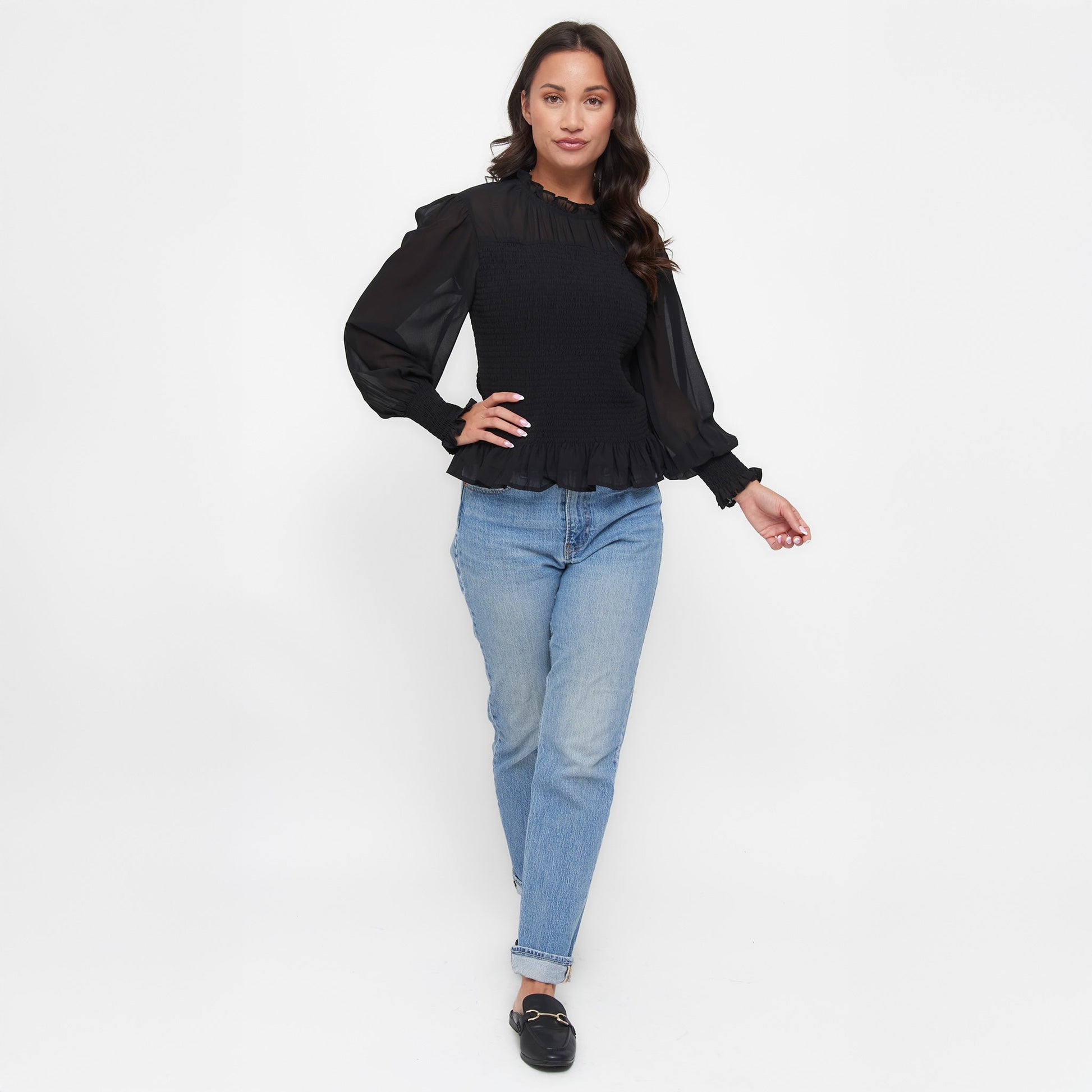 Update your wardrobe with the chic Hazel Smocked Long Sleeve Blouse. Featuring a smocked design, sheer long sleeves, and cute frilly neckline and subtle peplum hem design, this blouse looks adorable on its own or paired with a blazer and is sure to add interest to any look.