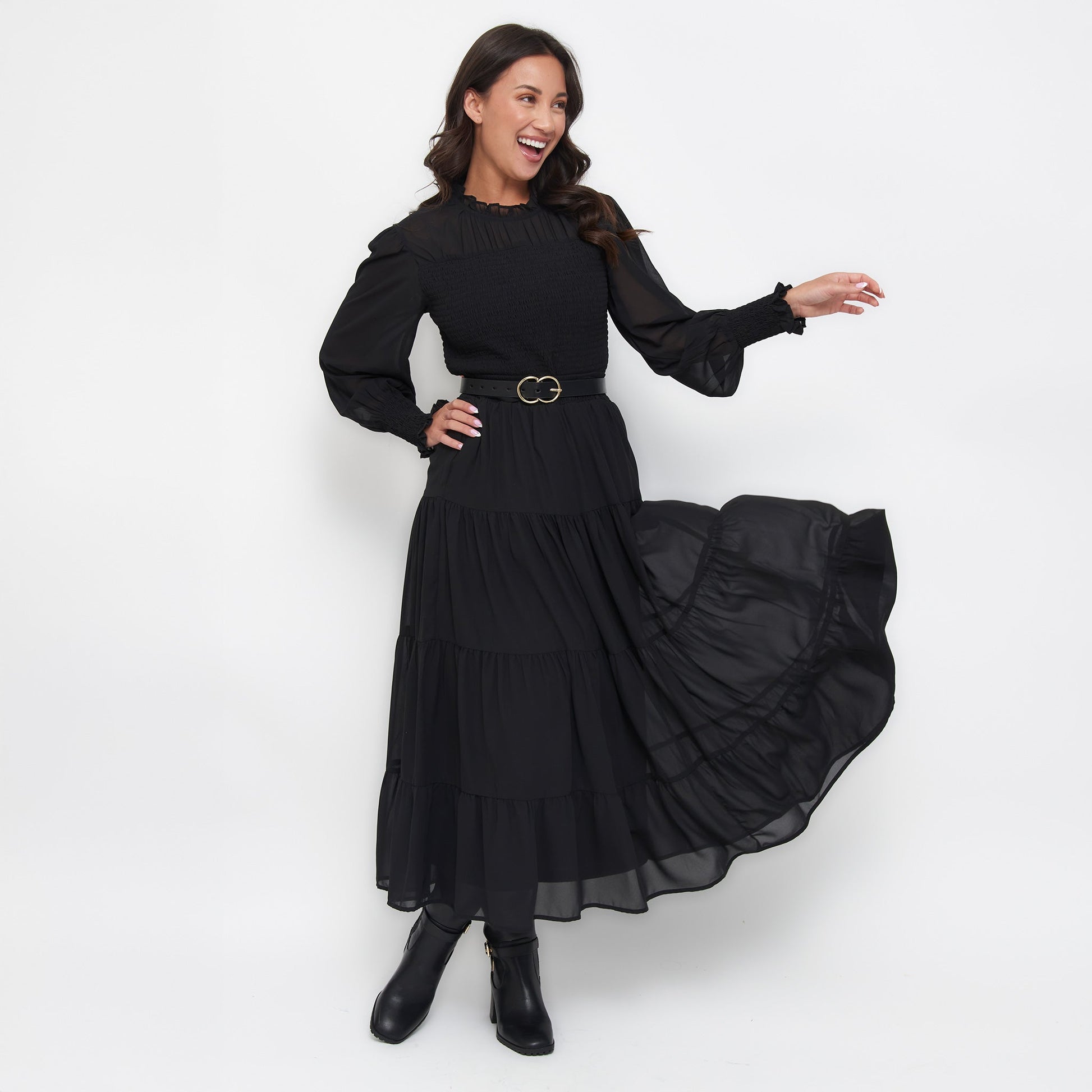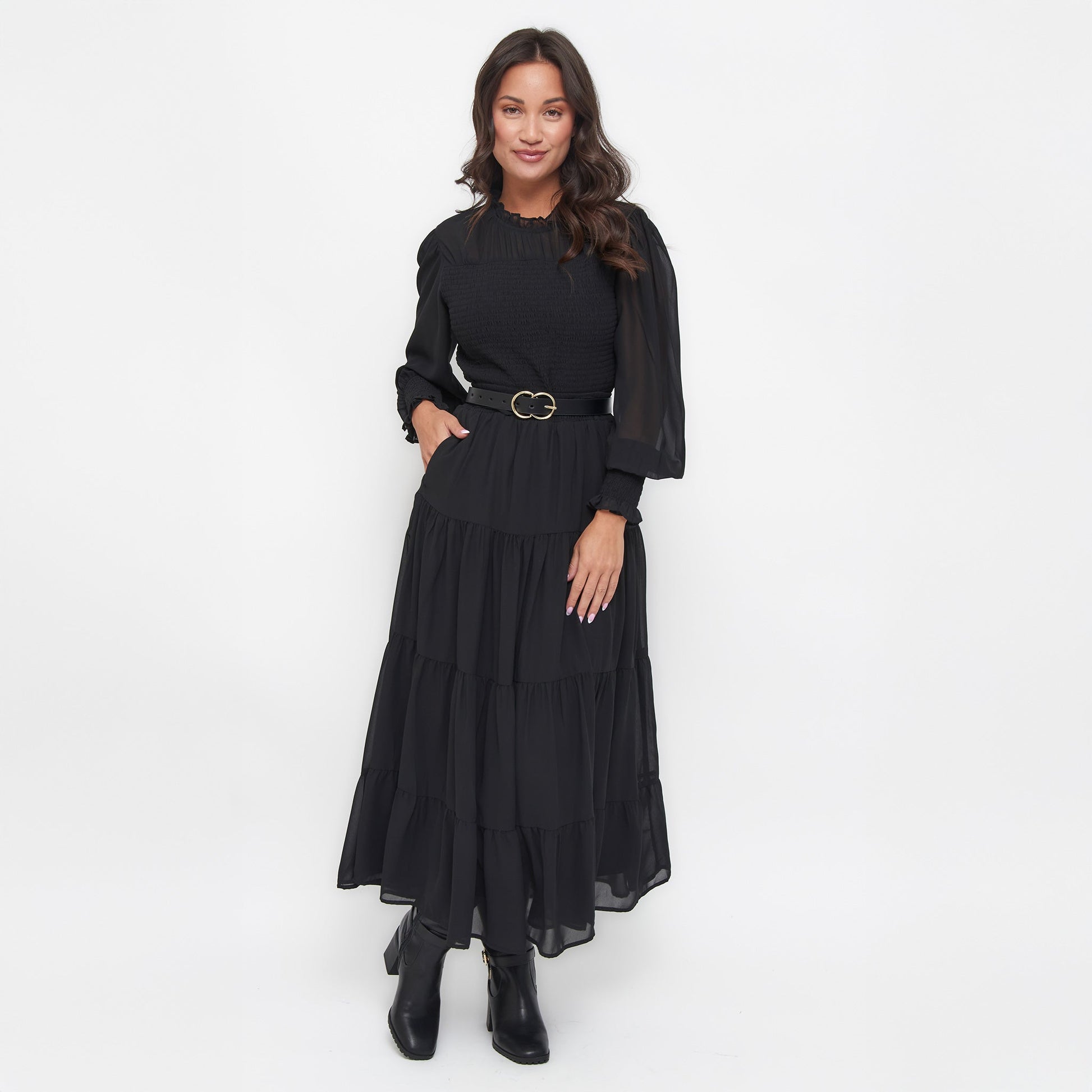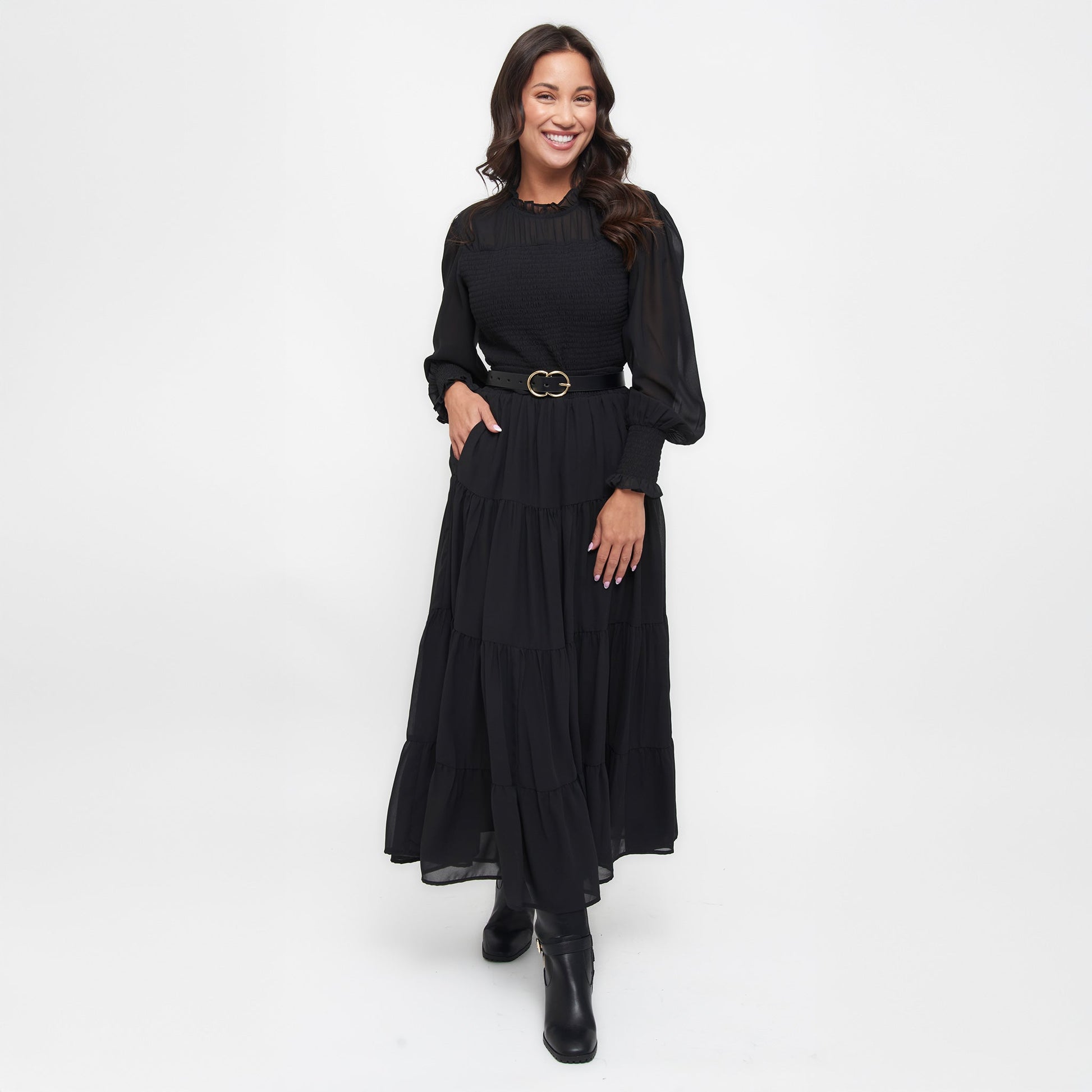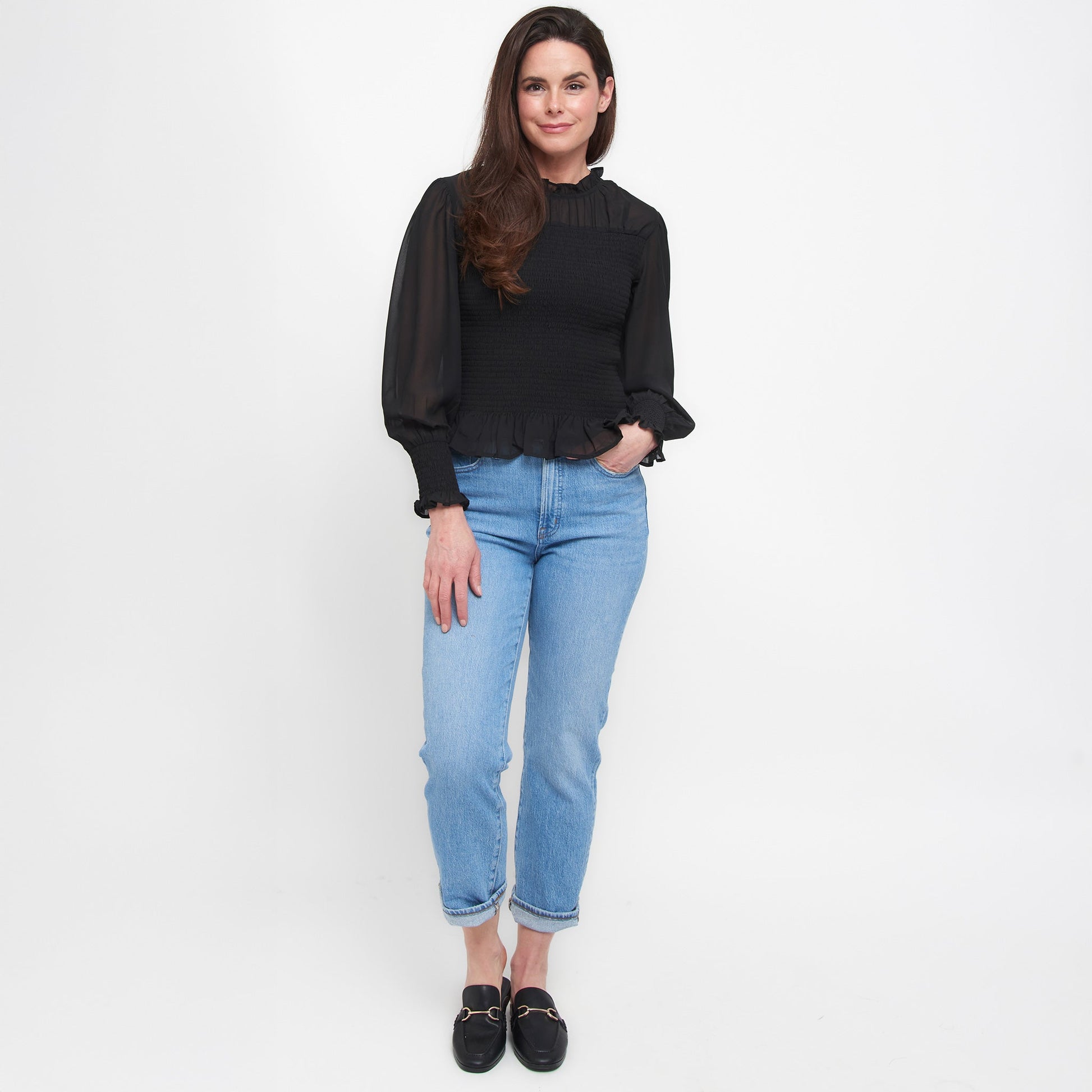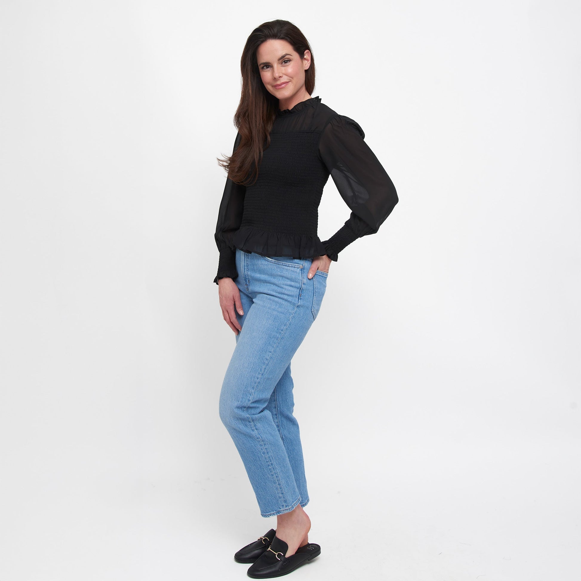 Update your wardrobe with the chic Hazel Smocked Long Sleeve Blouse. Featuring a smocked design, sheer long sleeves, and cute frilly neckline and subtle peplum hem design, this blouse looks adorable on its own or paired with a blazer and is sure to add interest to any look.