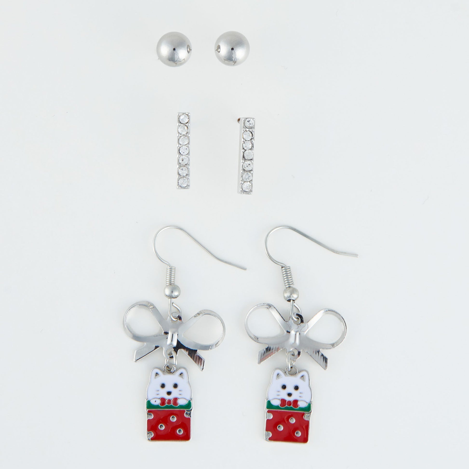 Stay festive and fun this holiday season with the Holiday Kitty Gift Earring Trio. Featuring three unique pairs of earrings, each shimmering in silver and one with adorable Christmas kitty charms, this set makes for the perfect gift and adds cheery flair to any look.