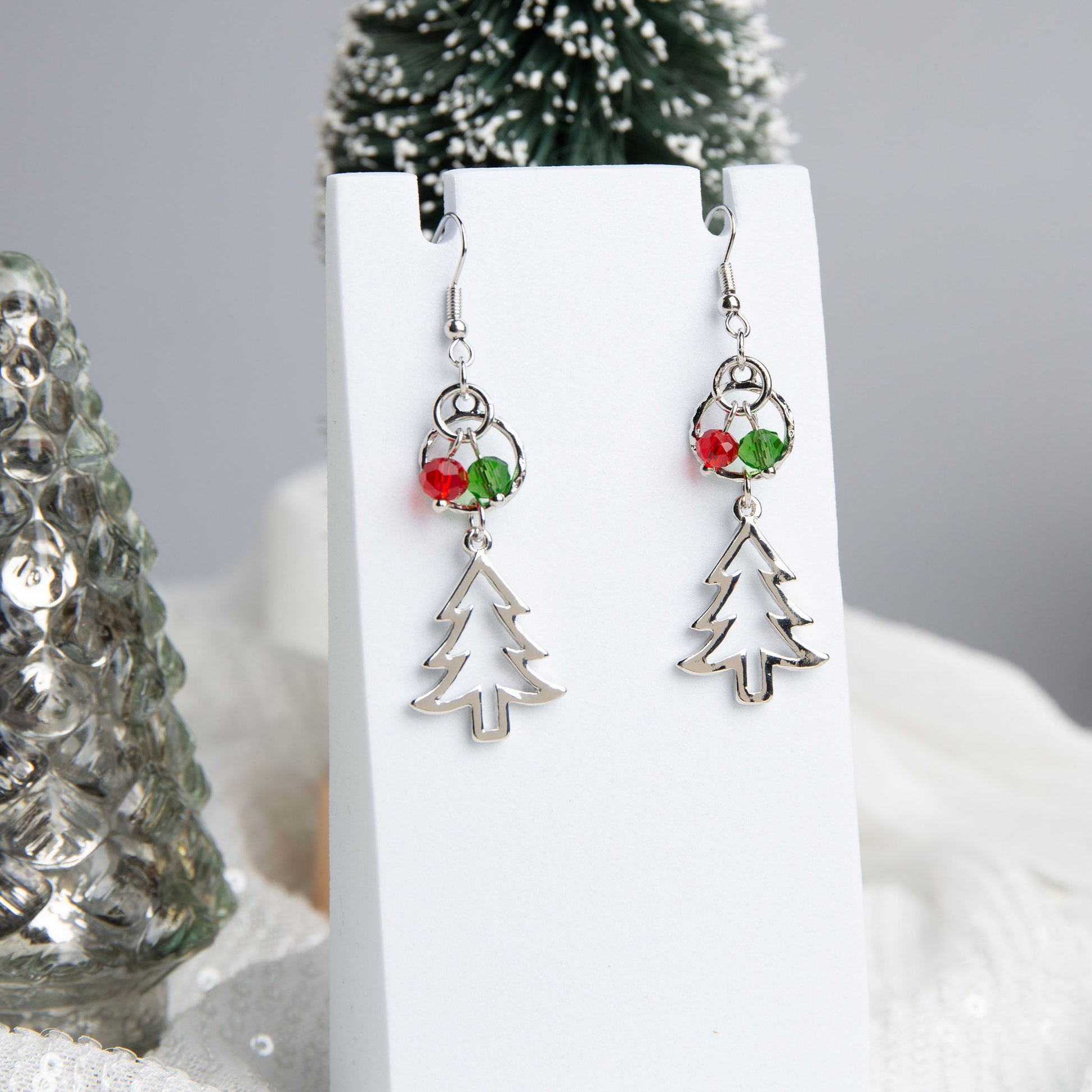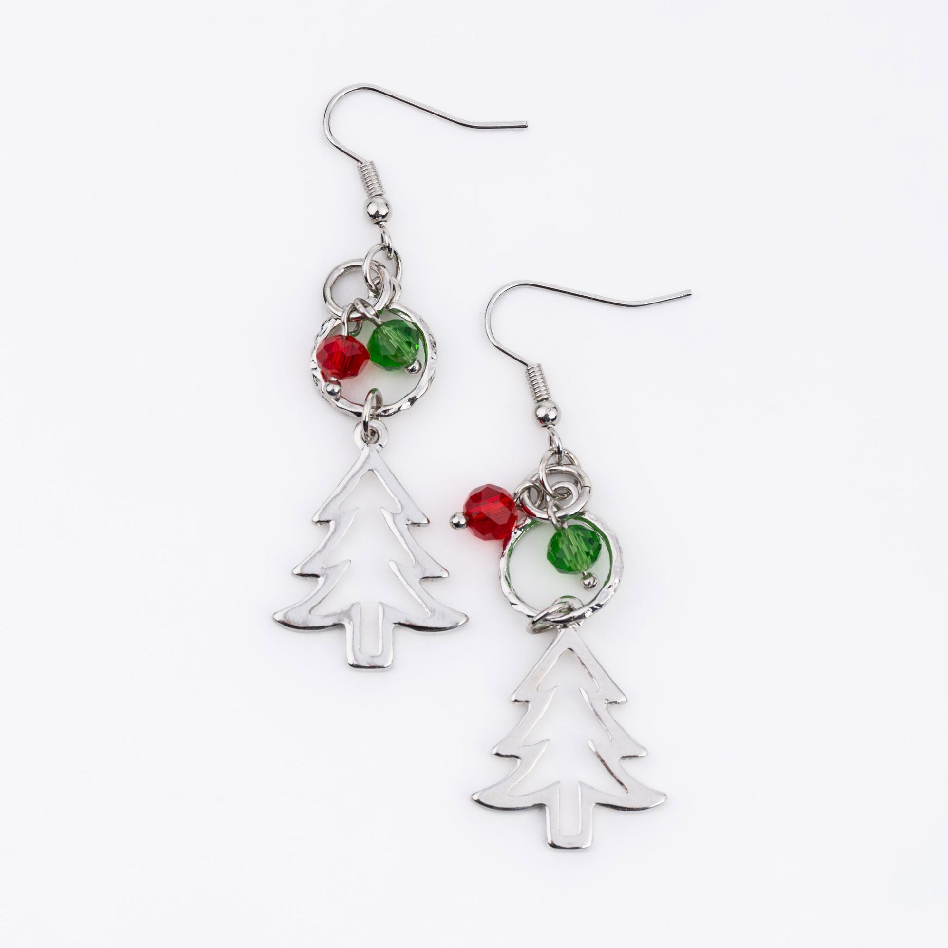 Get in the holiday spirit with the Holiday Pine Tree Beaded Earrings. Featuring stunning metal trees with a beautiful green and red glass bead, these earrings add a festive touch to any look.