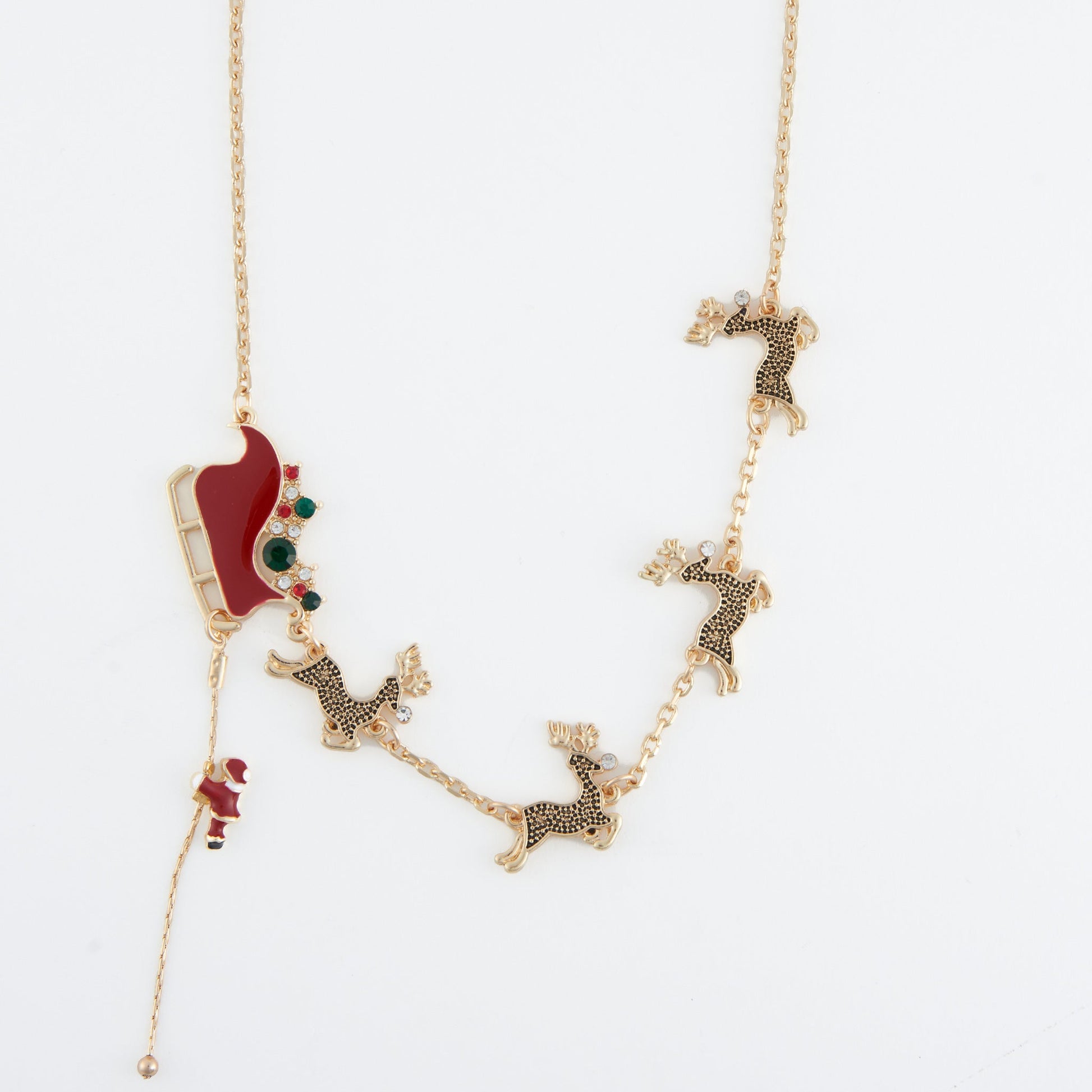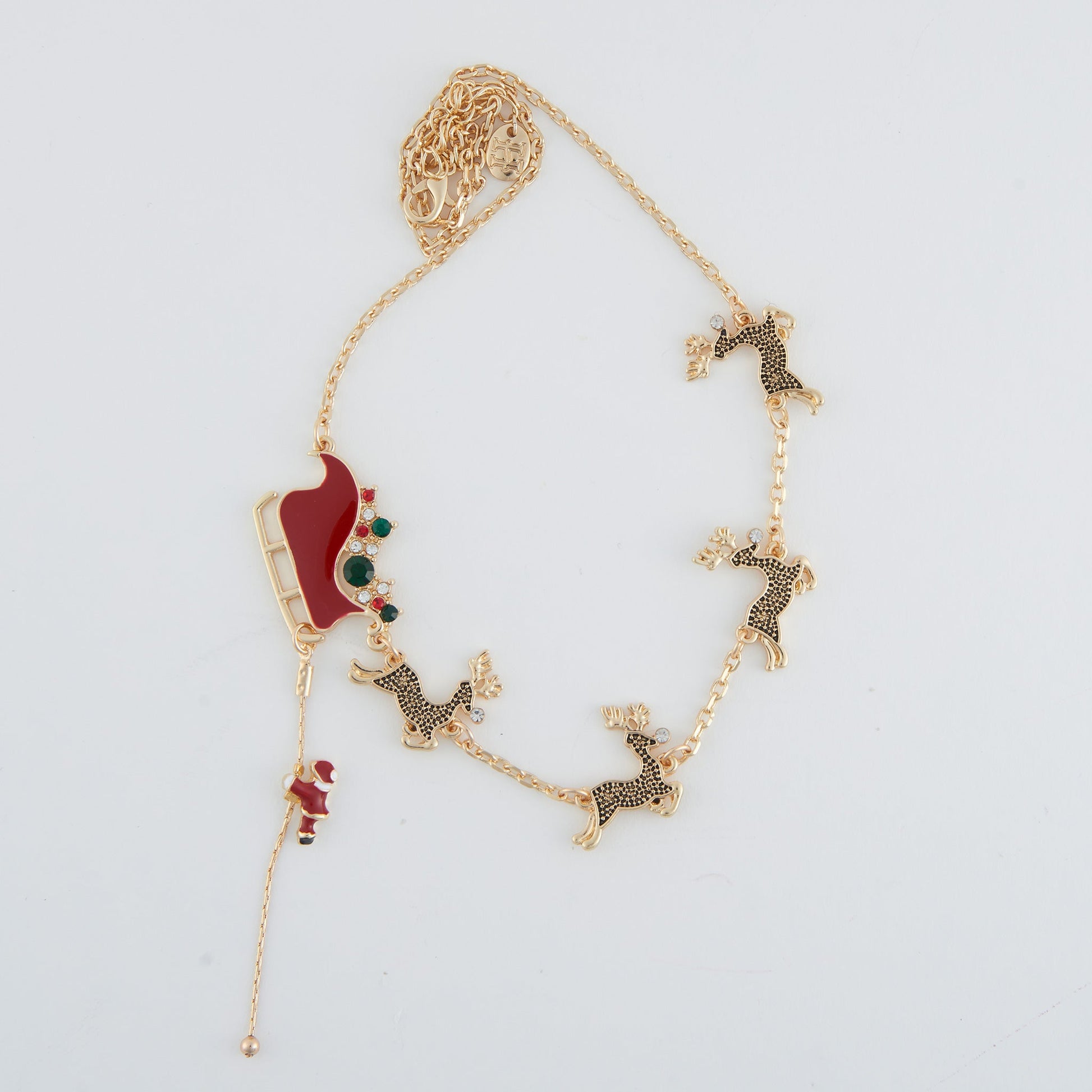 Stay festive and fun this holiday season with the Holiday Reindeer and Sleigh Necklace. Featuring the classic Santa and his Reindeer motif, with a little Santa charm climbing up to the sleigh, this statement necklace adds cheery flair to any look.