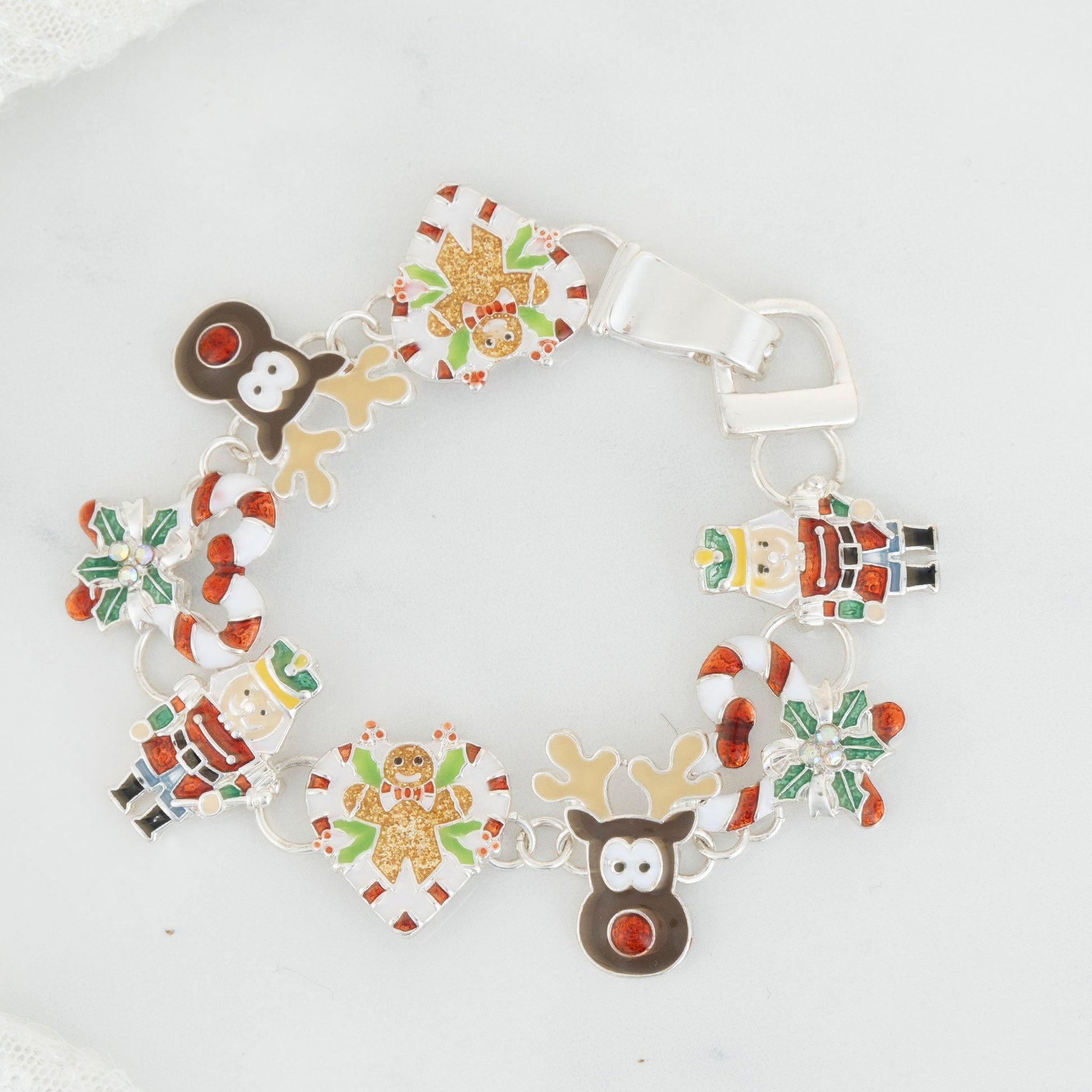 Get in the holiday spirit with the Holiday Reindeer Bracelet. Made up of reindeer, gingerbread men, and nutcracker charms, this bracelet features a magnetic closure and oozes holiday cheer. Adding joy to your look has never been easier.