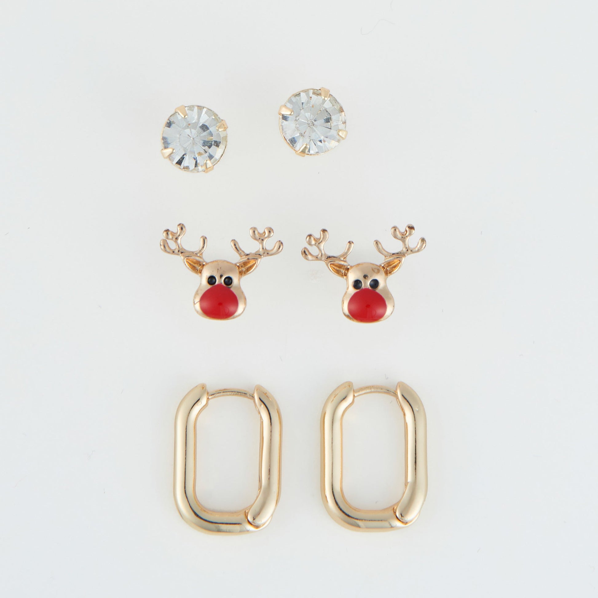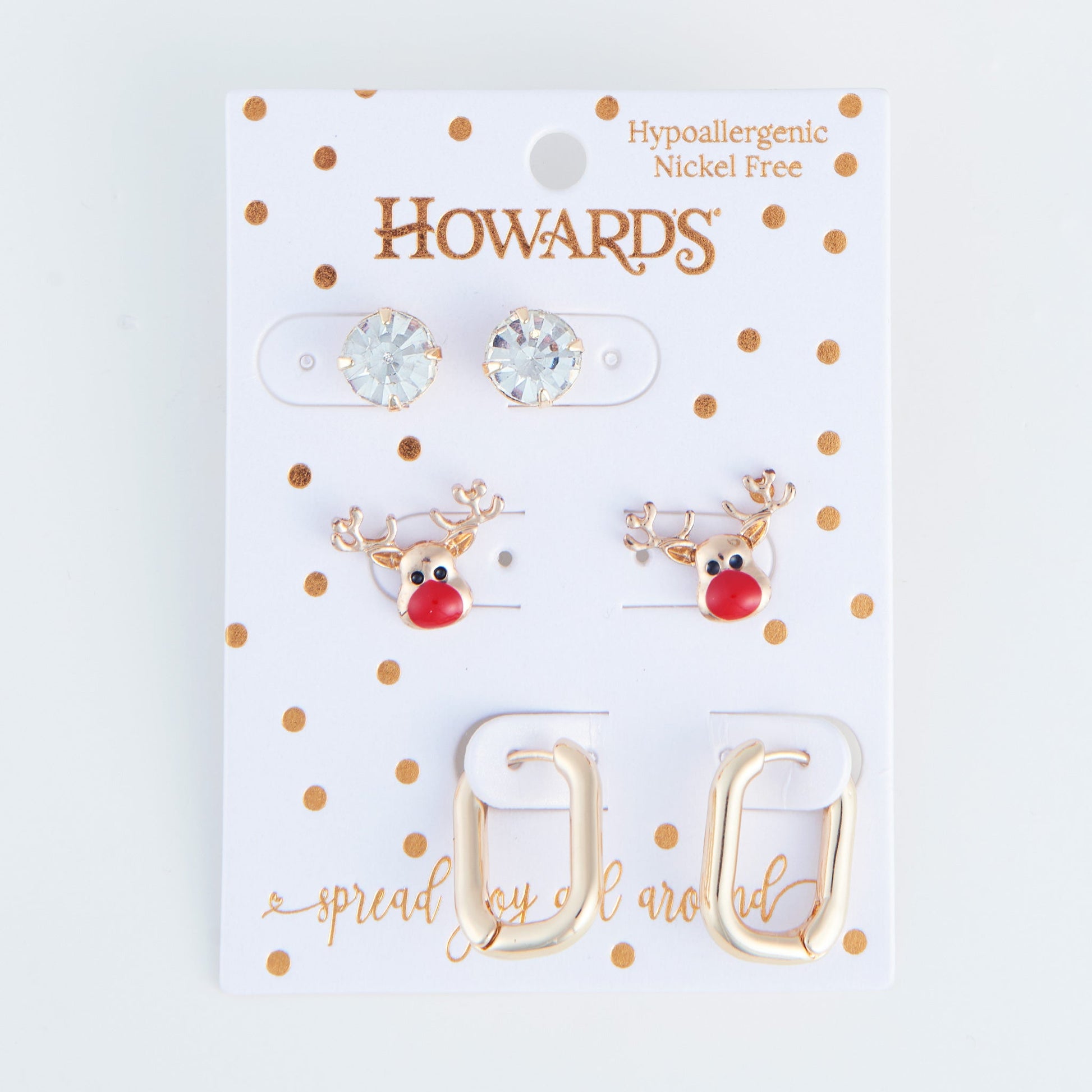 Stay festive and fun this holiday season with the Holiday Reindeer Earring Trio. Featuring three unique pairs of earrings, each with a little gold and a little bling, and one with adorable reindeer design, this set adds cheery flair to any look.