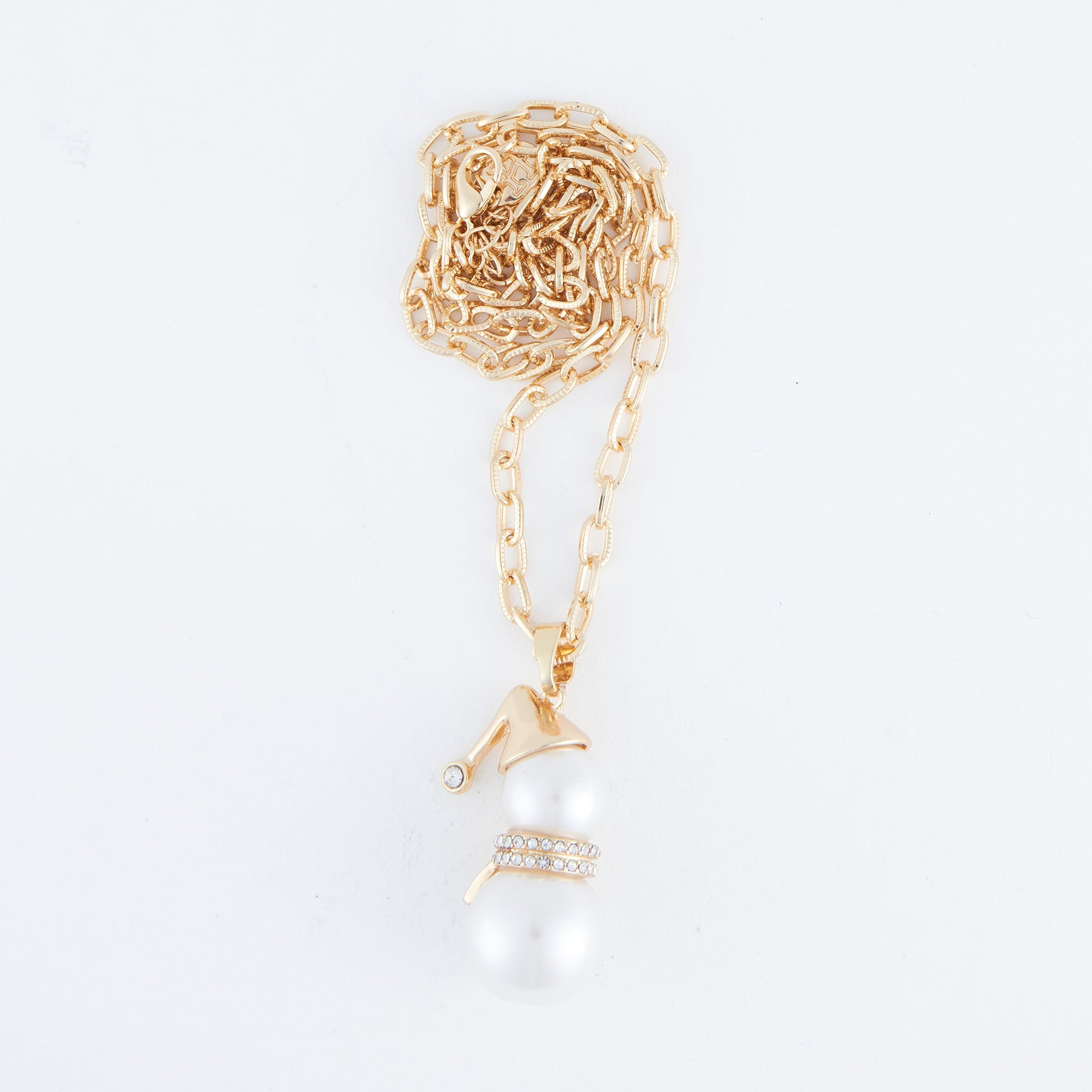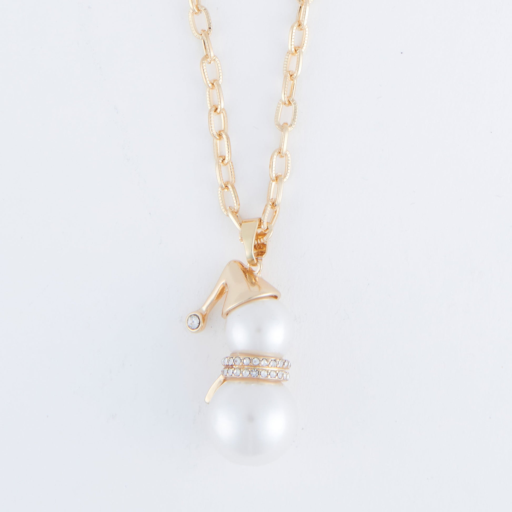 Stay festive and fun this holiday season with the Holiday Snowman Pearl Pendant Necklace. Featuring two pearls tied together with a golden scarf and adorned with a golden hat, these statement necklace brings cheery flair to any look.