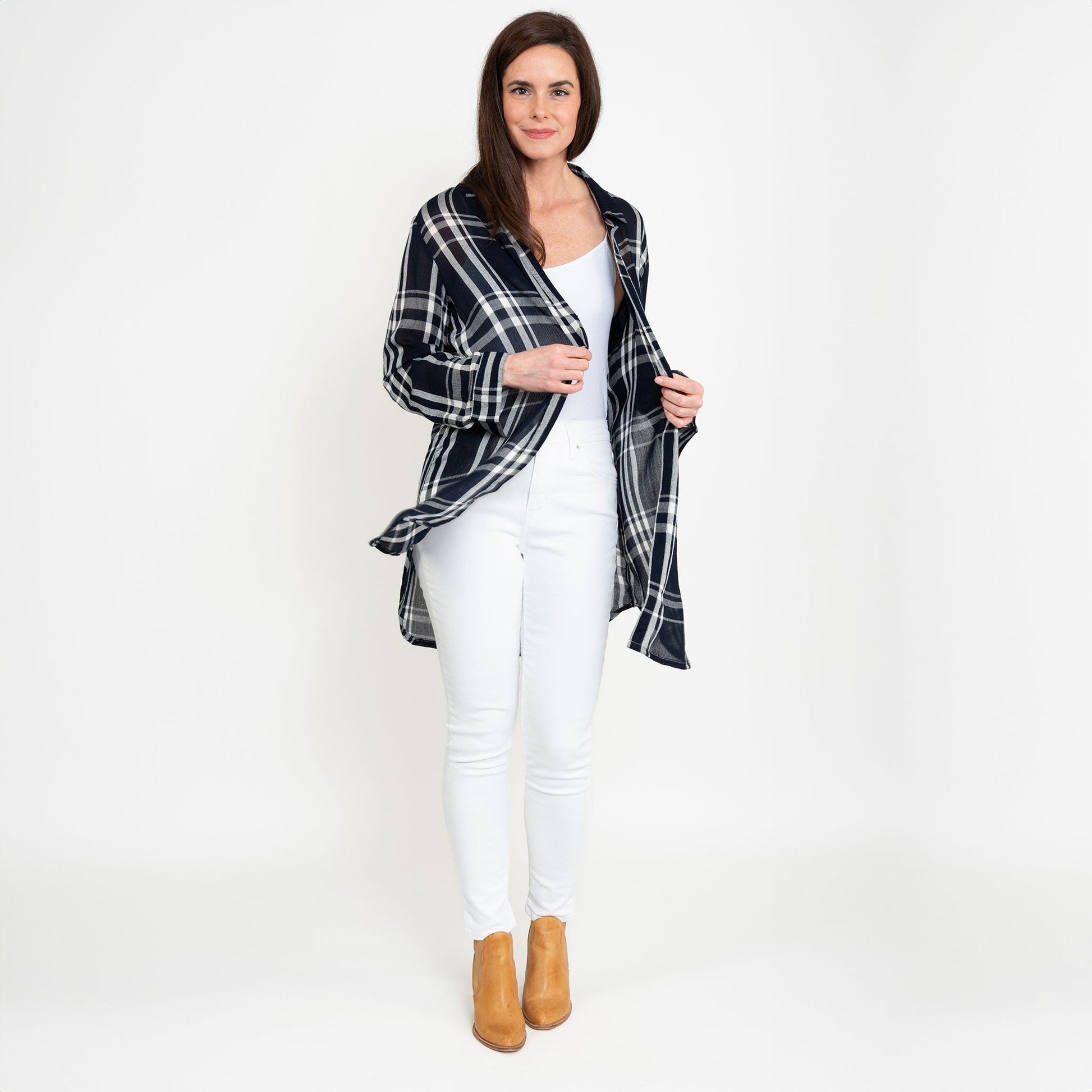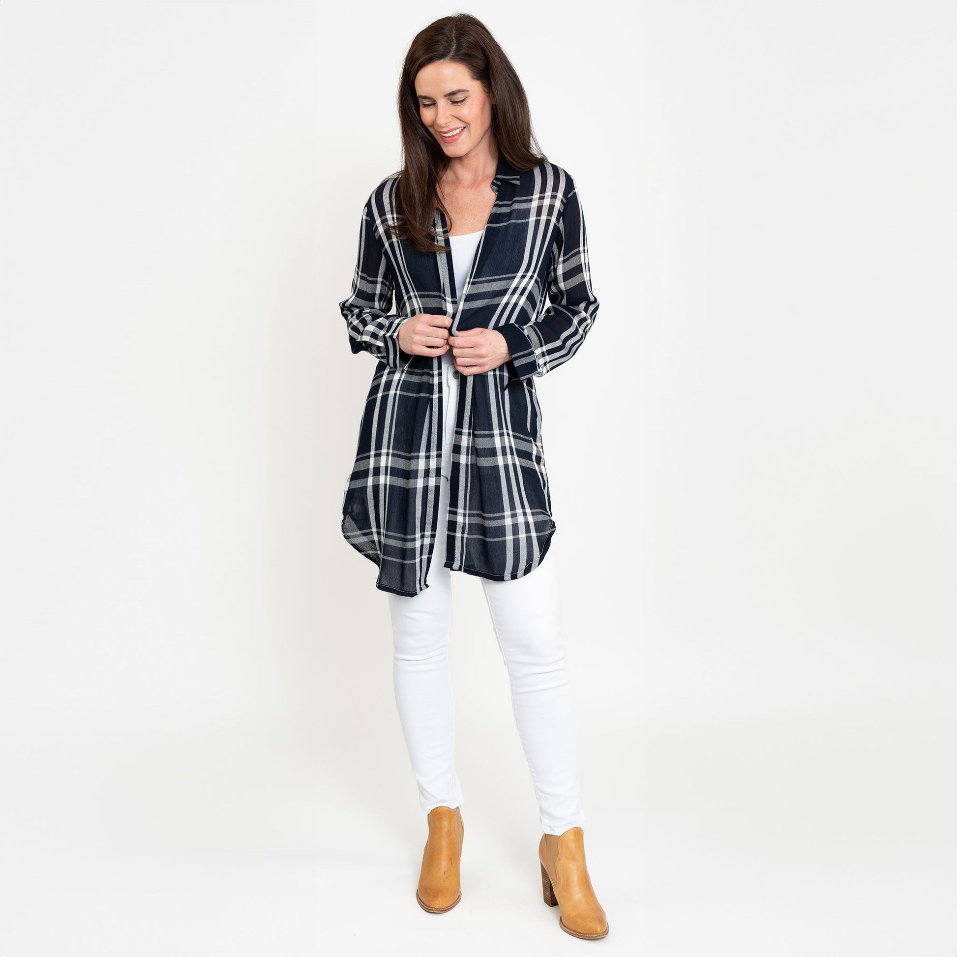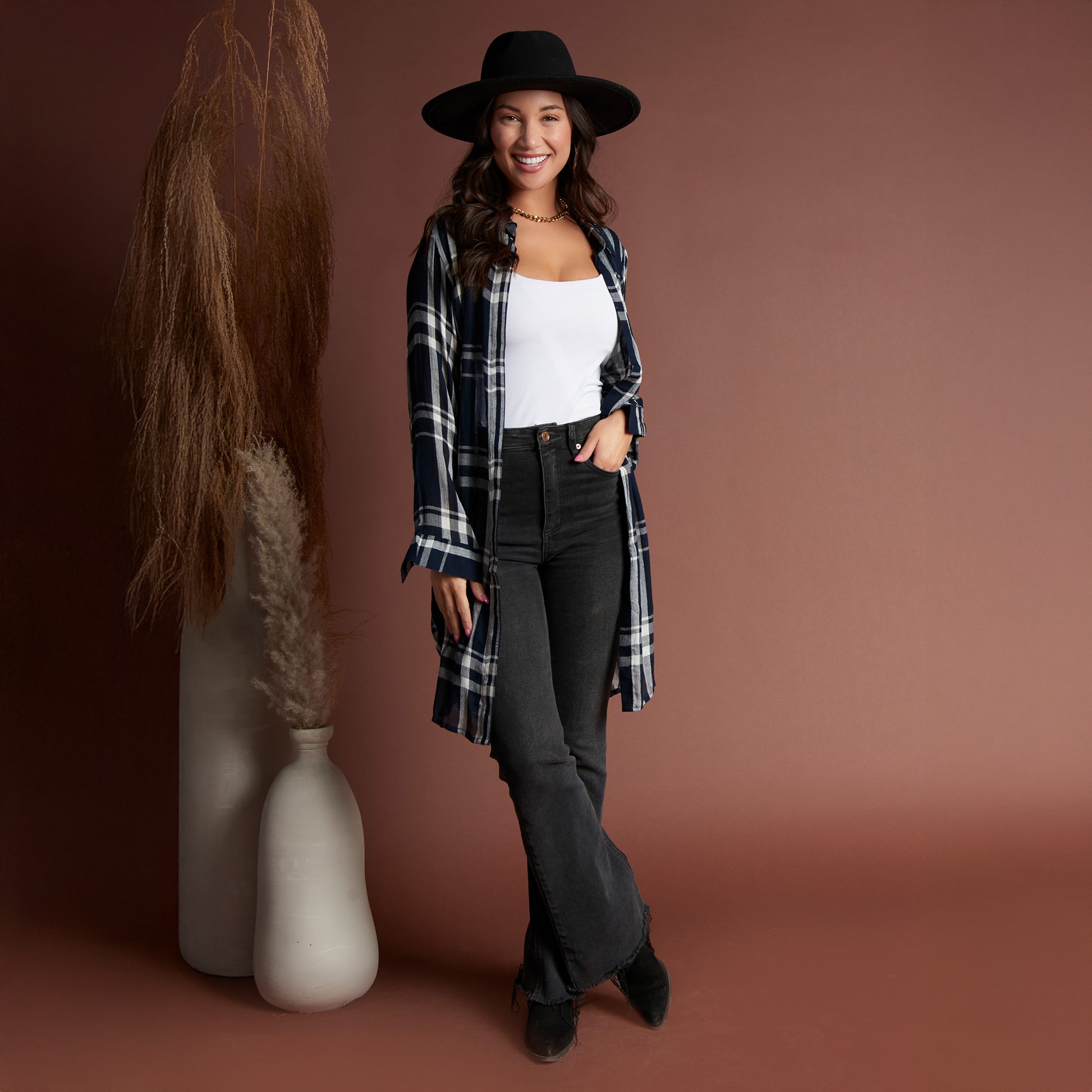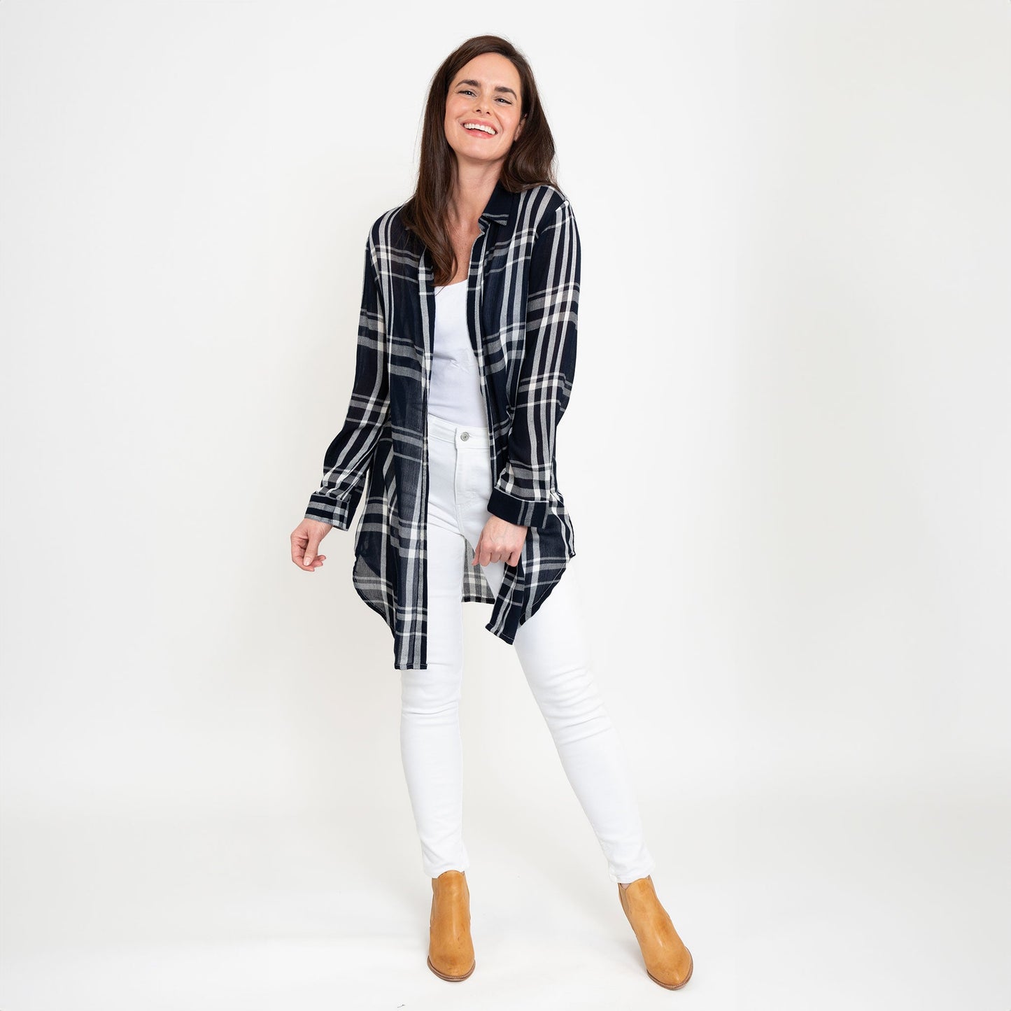 A wardrobe staple, the Hunter Plaid Duster features a classic navy plaid in an relaxed and lightweight design. Easy to style and easy to wear, you've just met your new go-to.