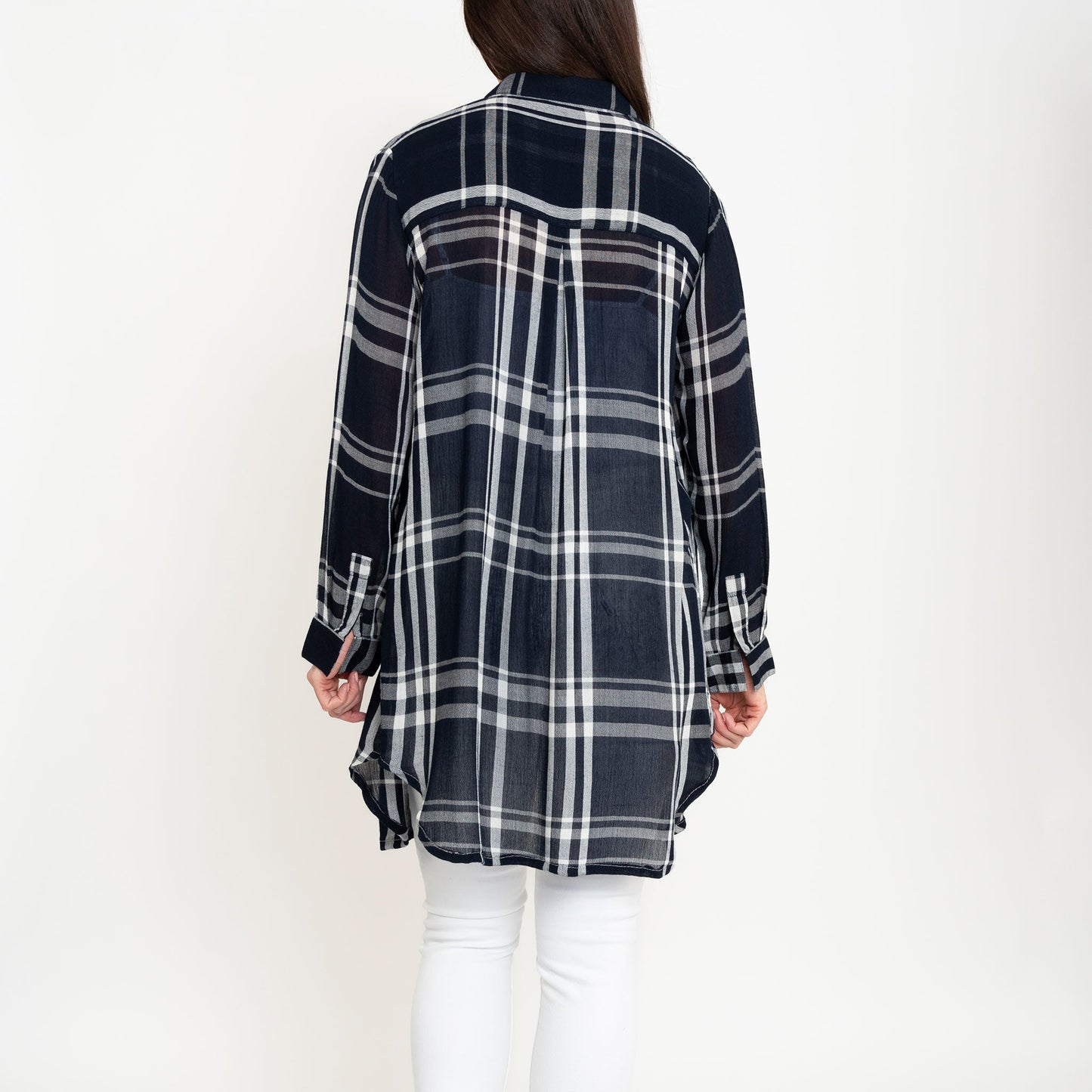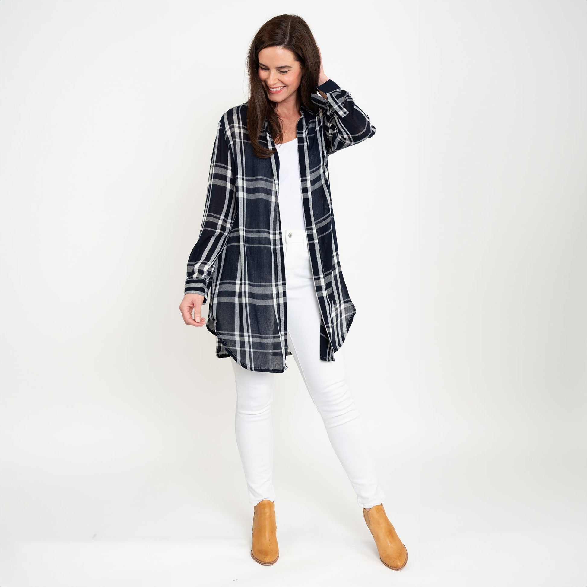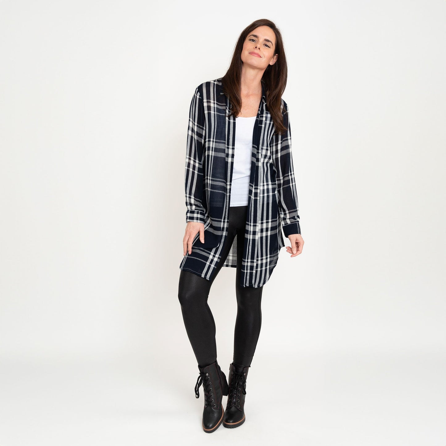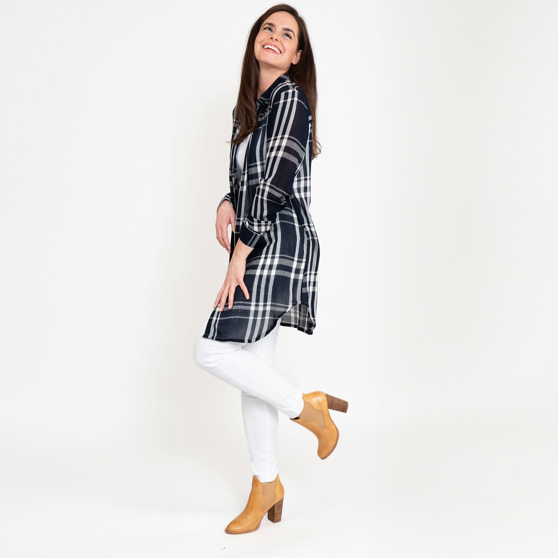 A wardrobe staple, the Hunter Plaid Duster features a classic navy plaid in an relaxed and lightweight design. Easy to style and easy to wear, you've just met your new go-to.