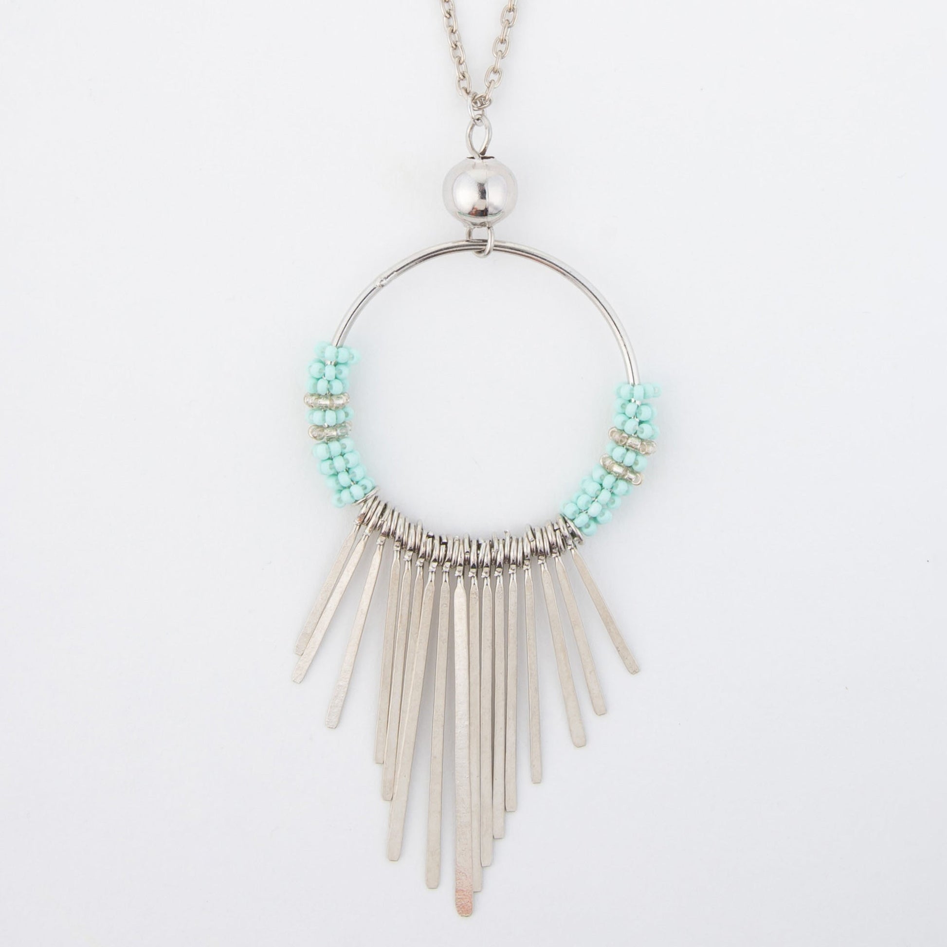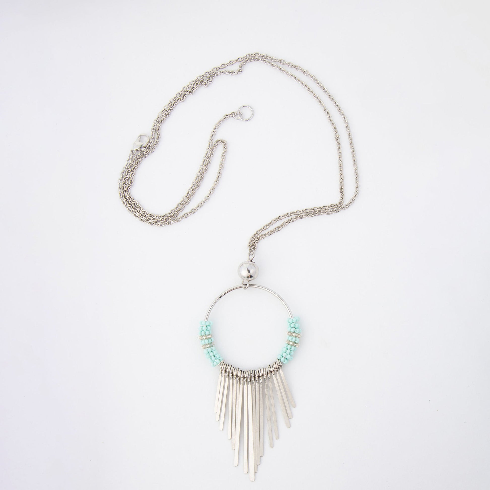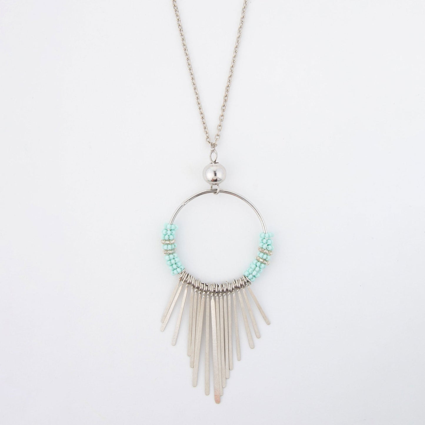Sophisticated and vibrant, the Jaliya Hoop Pendant Necklace features a gorgeous silver hoop pendant studded with aqua beads. The dangling silver accents adds interest to this stunner. Playful and feminine, this necklace is sure to turn heads.