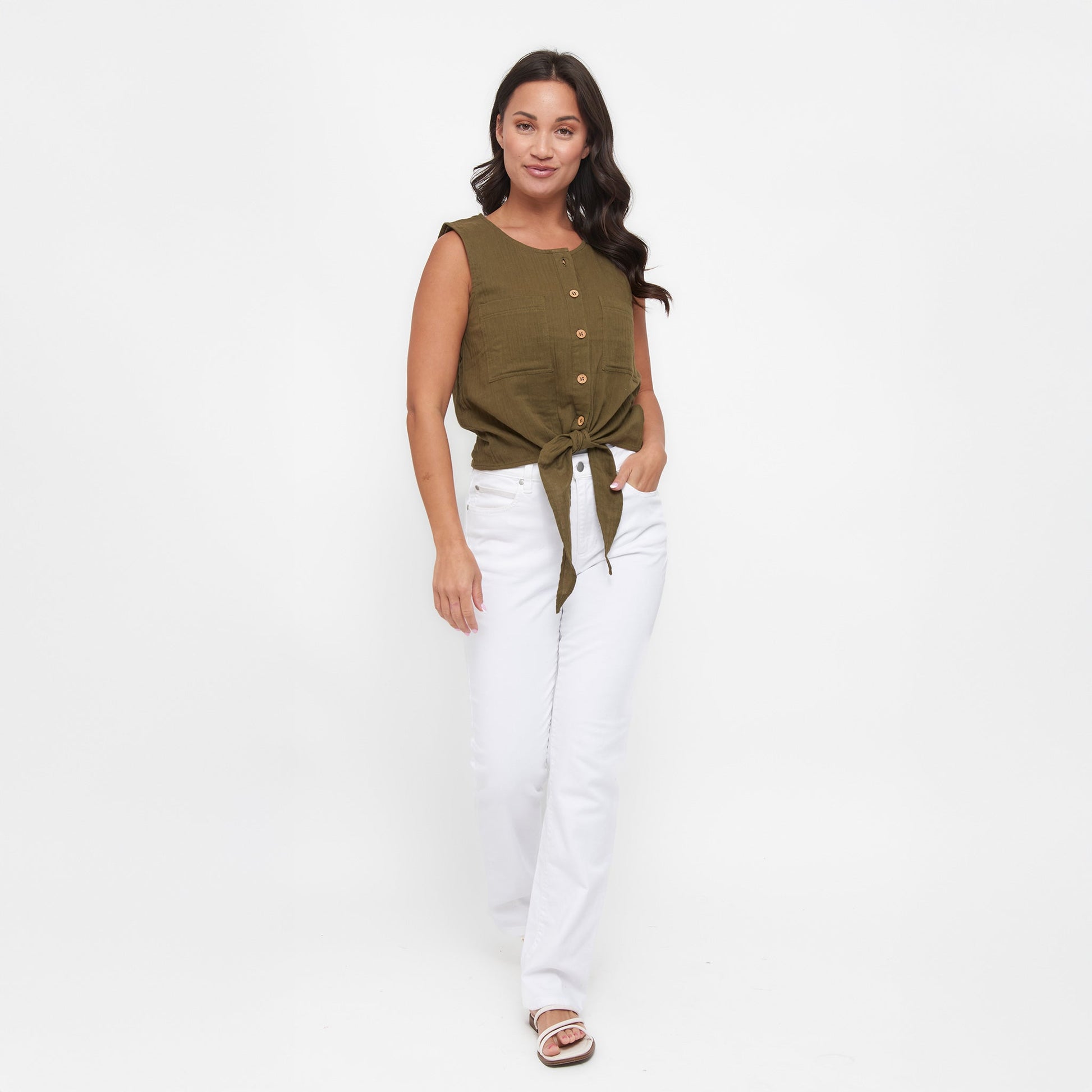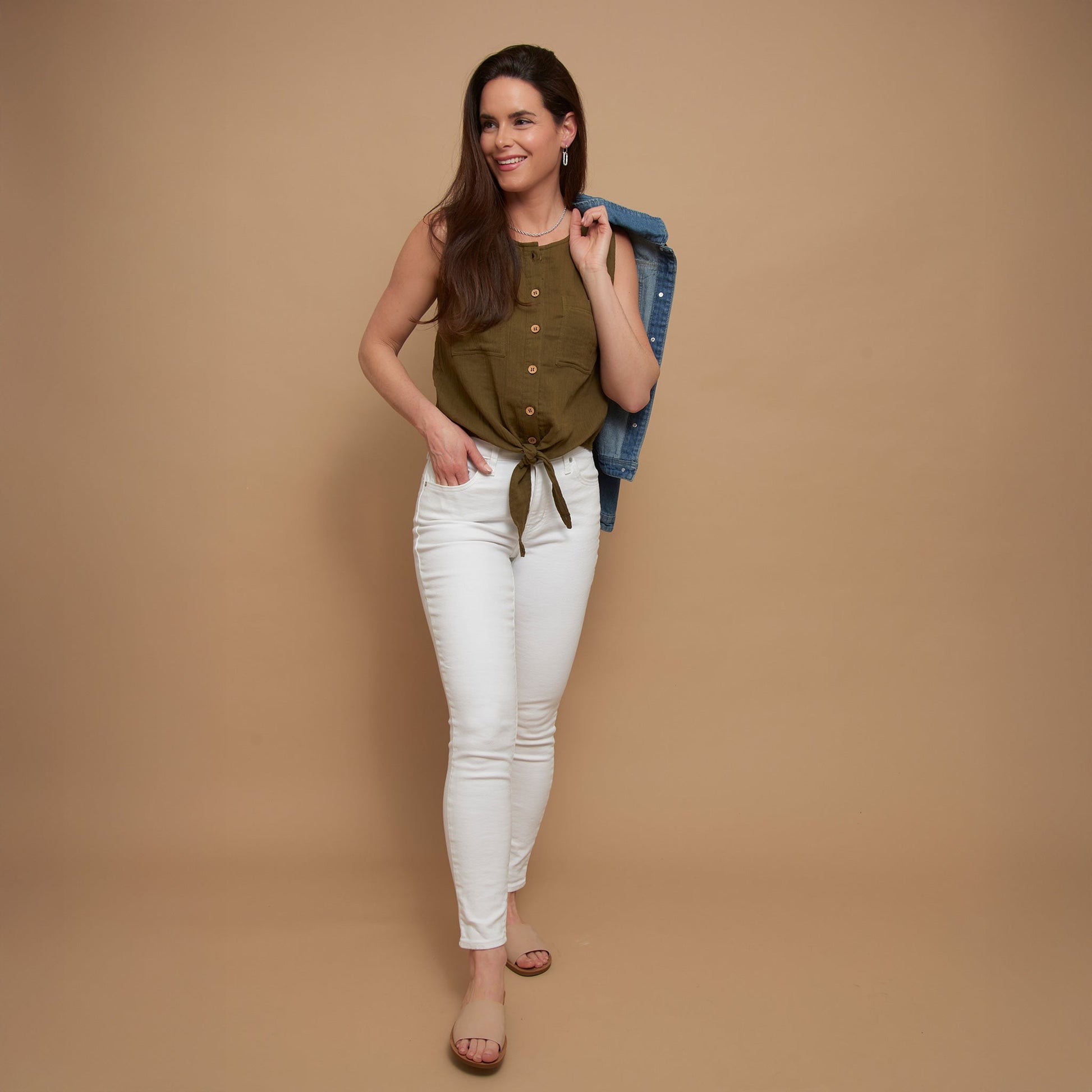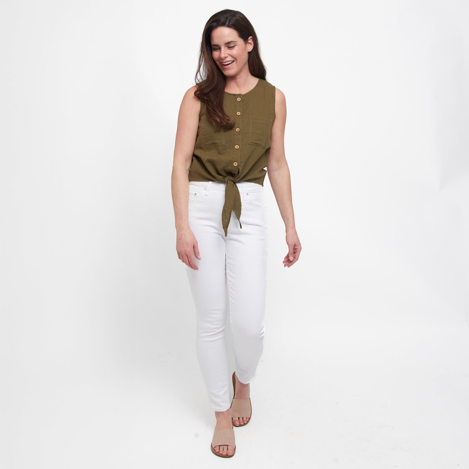 The perfect any season piece! Featuring soft, 100% cotton gauze with button up design and chic tie at the waist, the Jasmin Gauze Button Up Tank is an absolute closet staple.