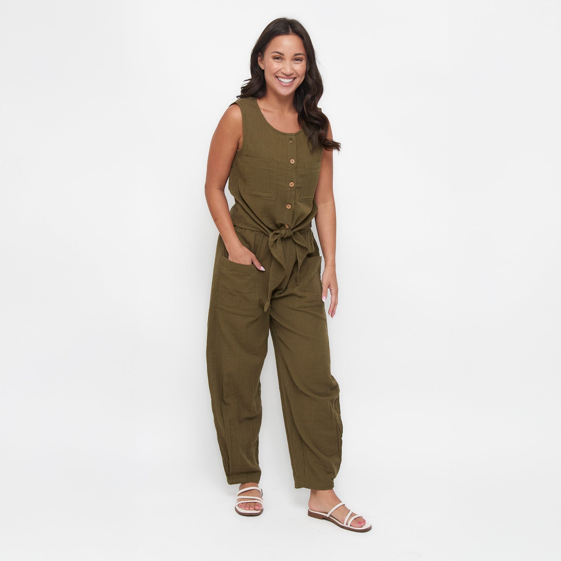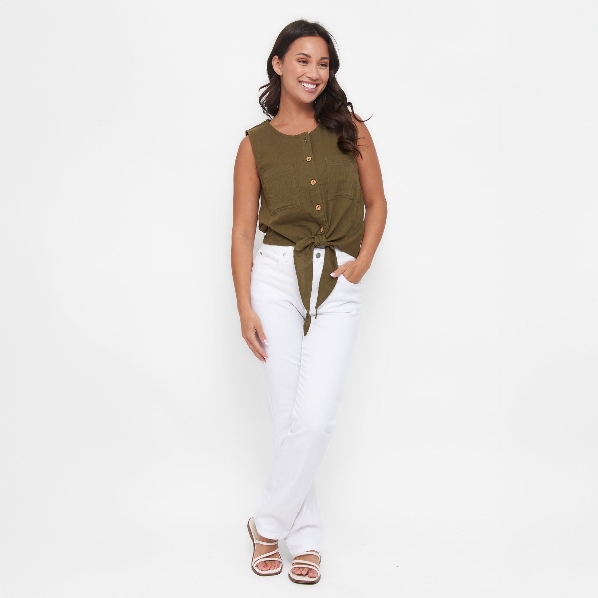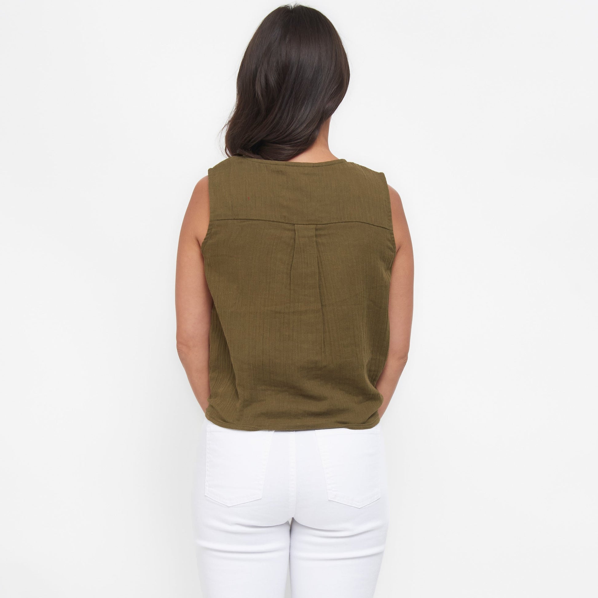 The perfect any season piece! Featuring soft, 100% cotton gauze with button up design and chic tie at the waist, the Jasmin Gauze Button Up Tank is an absolute closet staple.
