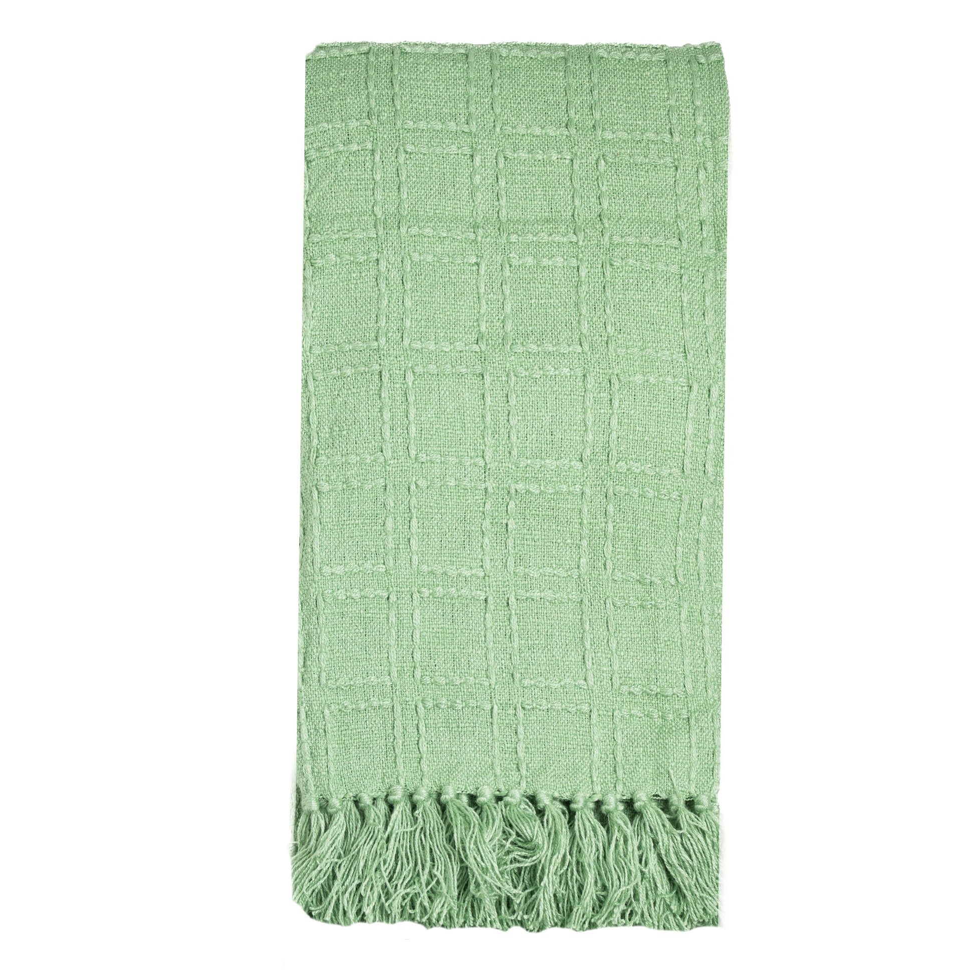 Add a bit of color to your home with the Jayde Handwoven Indoor/Outdoor 50x70 Throw. Beautiful in sage, with chic textured square pattern and adorable fringe detailing, this handwoven throw blanket is made from recycled plastic bottles and is UV protected, ensuring a longer outdoor life. Creating a comfortable and stylish atmosphere is easy with this throw. Comes with a removable carrying strap for on the go ease!