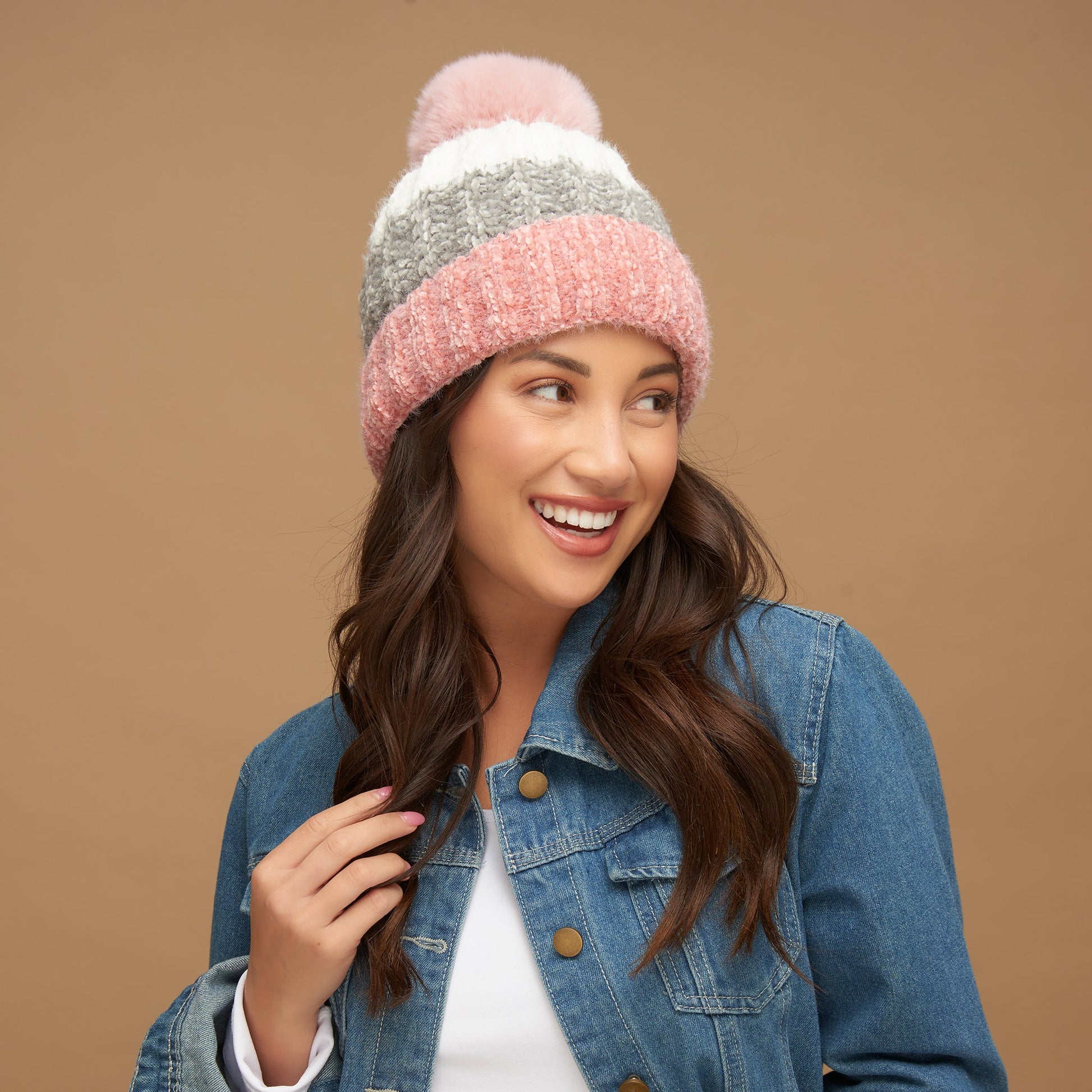 Stay warm in style with the Jemmi Chenille Striped Pom Beanie. With a chic color block, fun pom detailing and soft chenille material, this is the only hat you'll need this winter season.