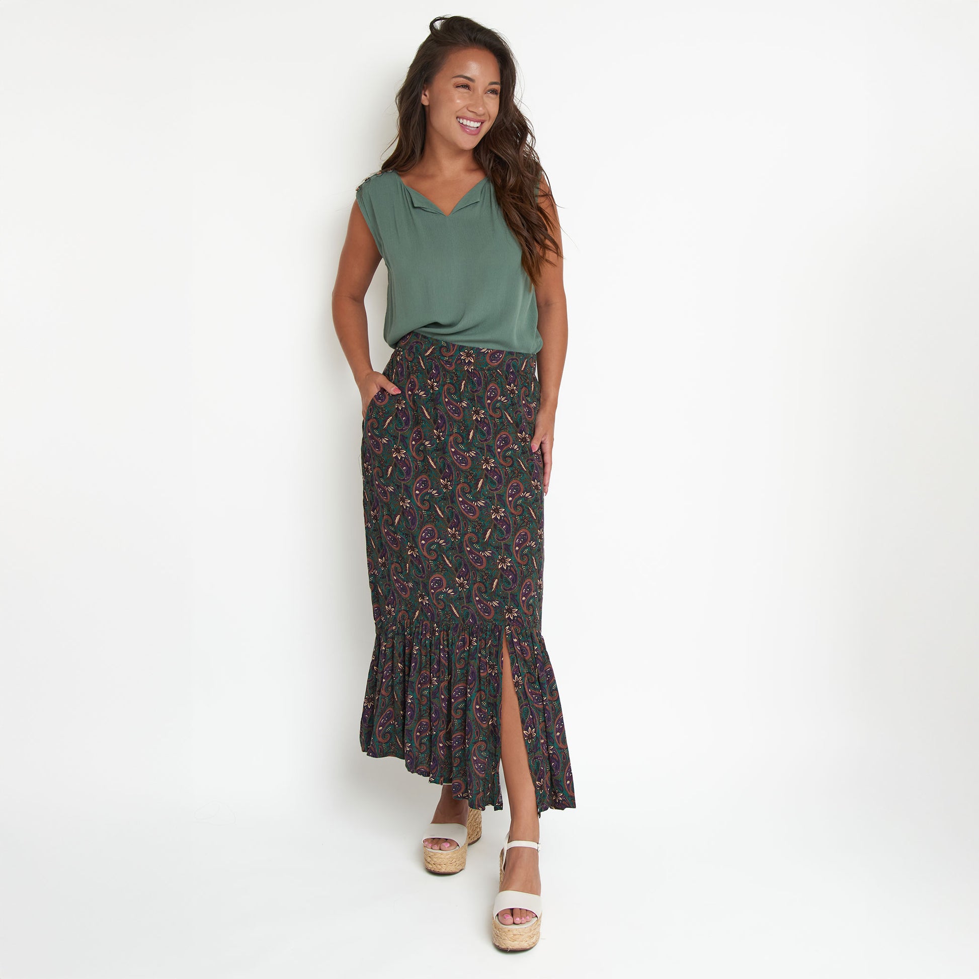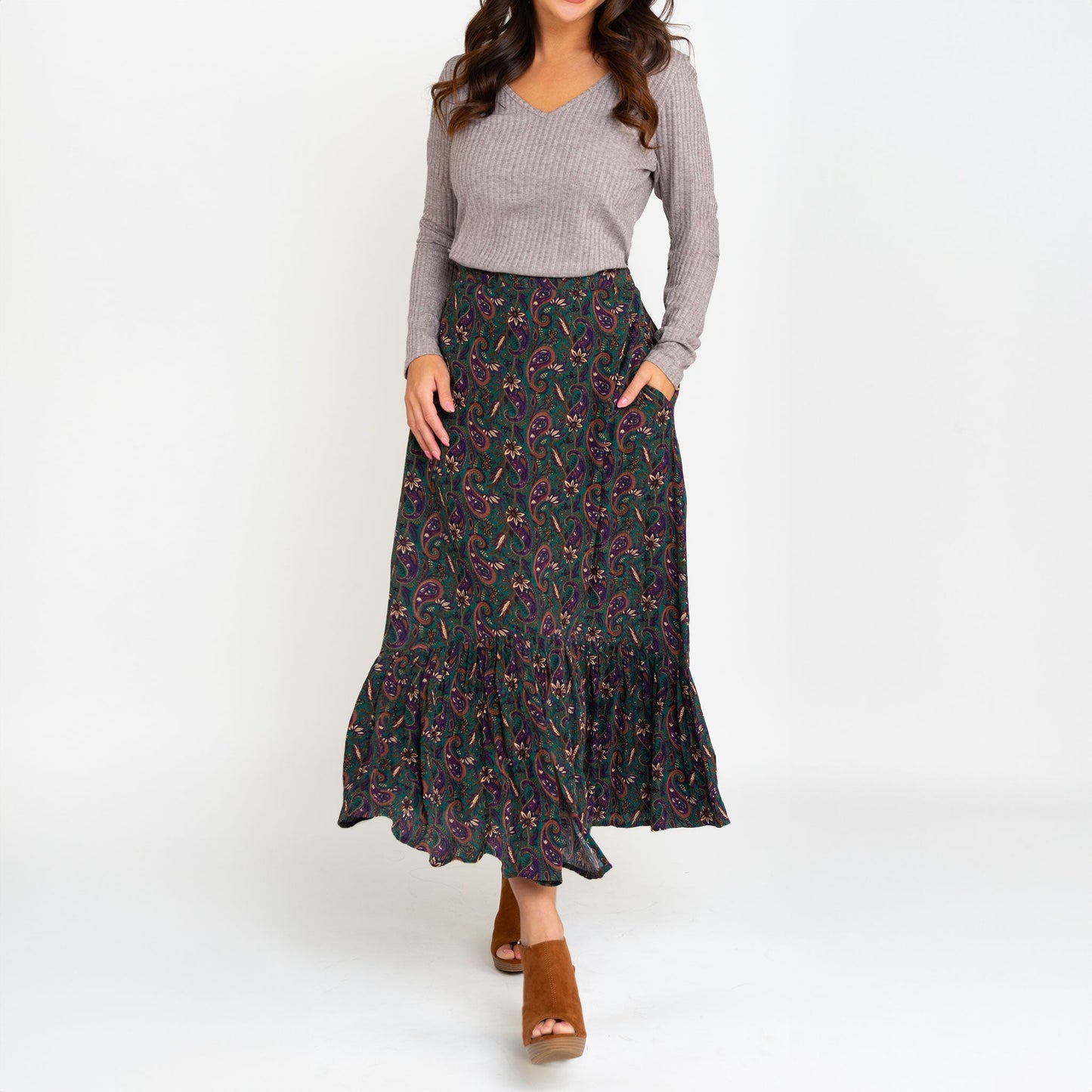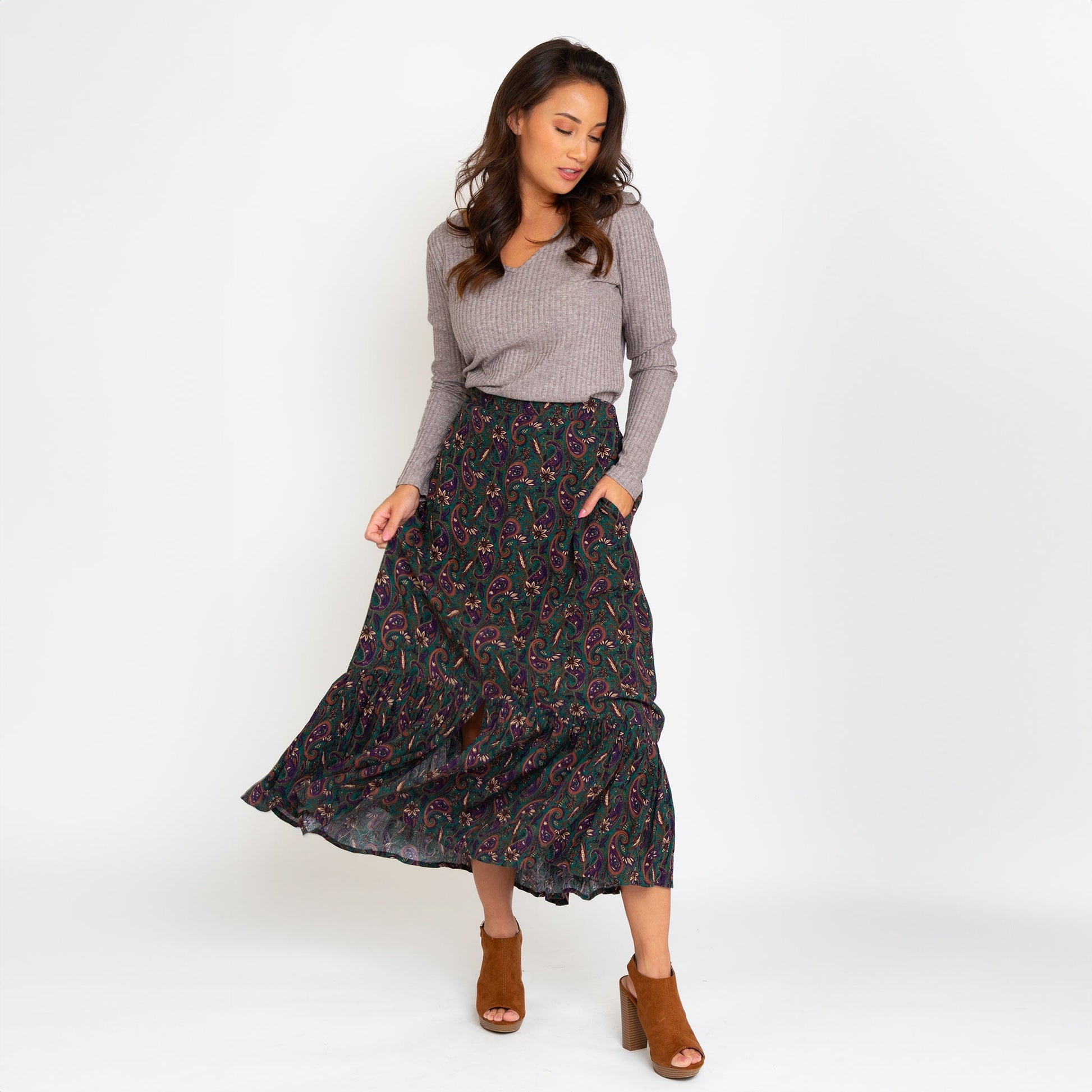 Pretty in Paisley! Featuring an attention-grabbing asymmetric design and flattering maxi length, the Joie Tiered Skirt is easy to style and easy to love.