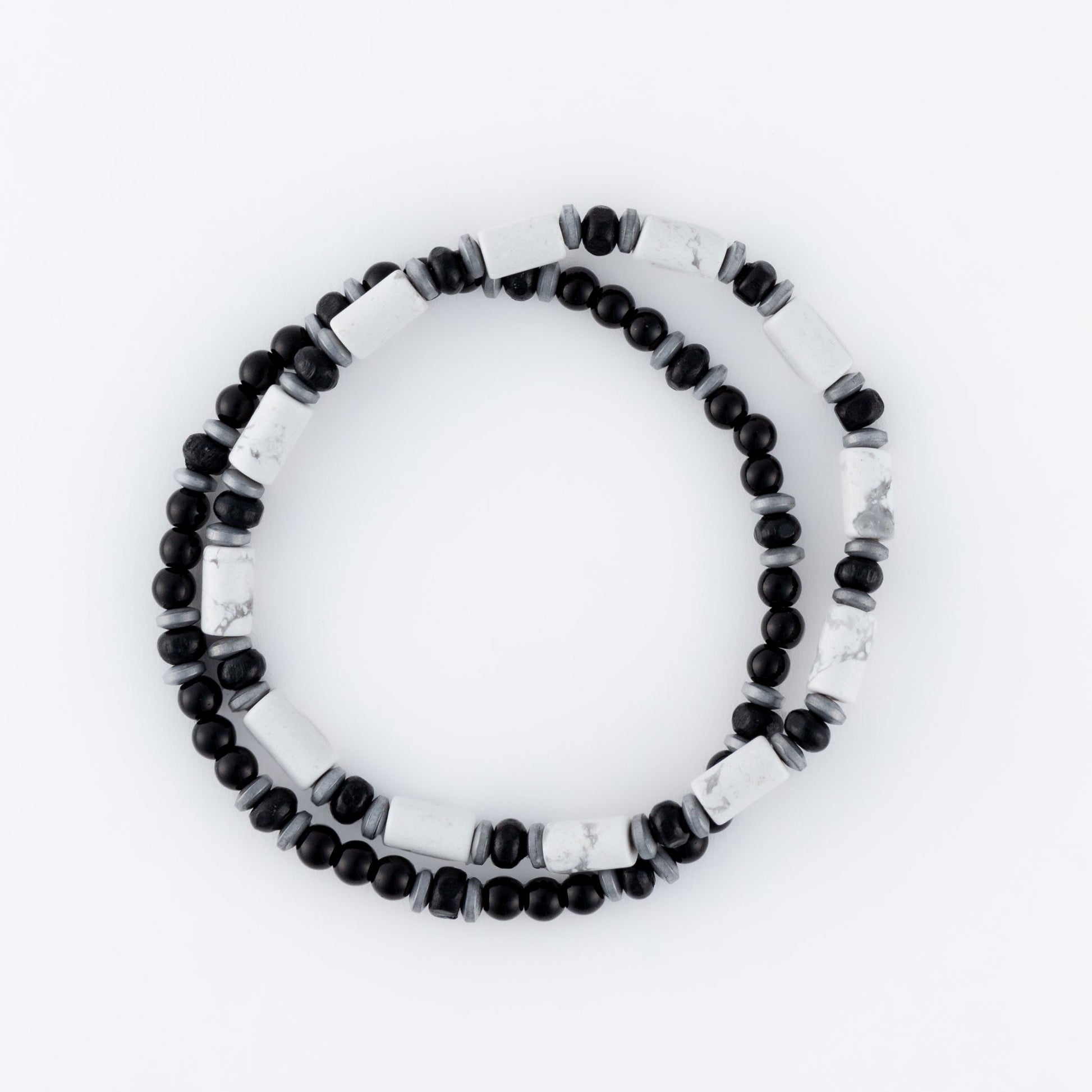 Featuring stone & wood beads in a chic black & white color scheme on a stretch band, the Jordan Multi Row Genuine Stone & Wood Bead Unisex Bracelet easily adds interest to any look.