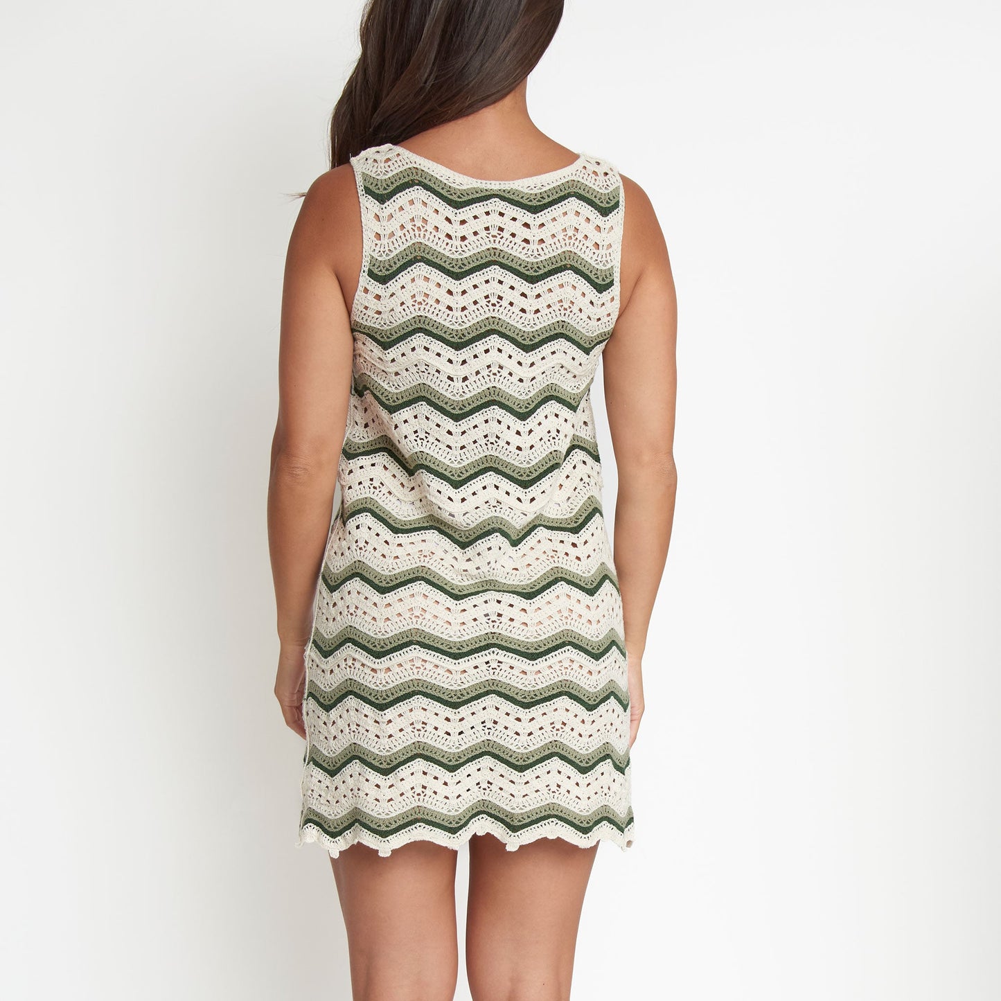 Chic and on trend! The Kala Striped Crochet Dress features a sleeveless, sage green & cream striped crochet knit, with flattering a-line design. Perfect for any season or occasion, this dress is a must-have for your closet!