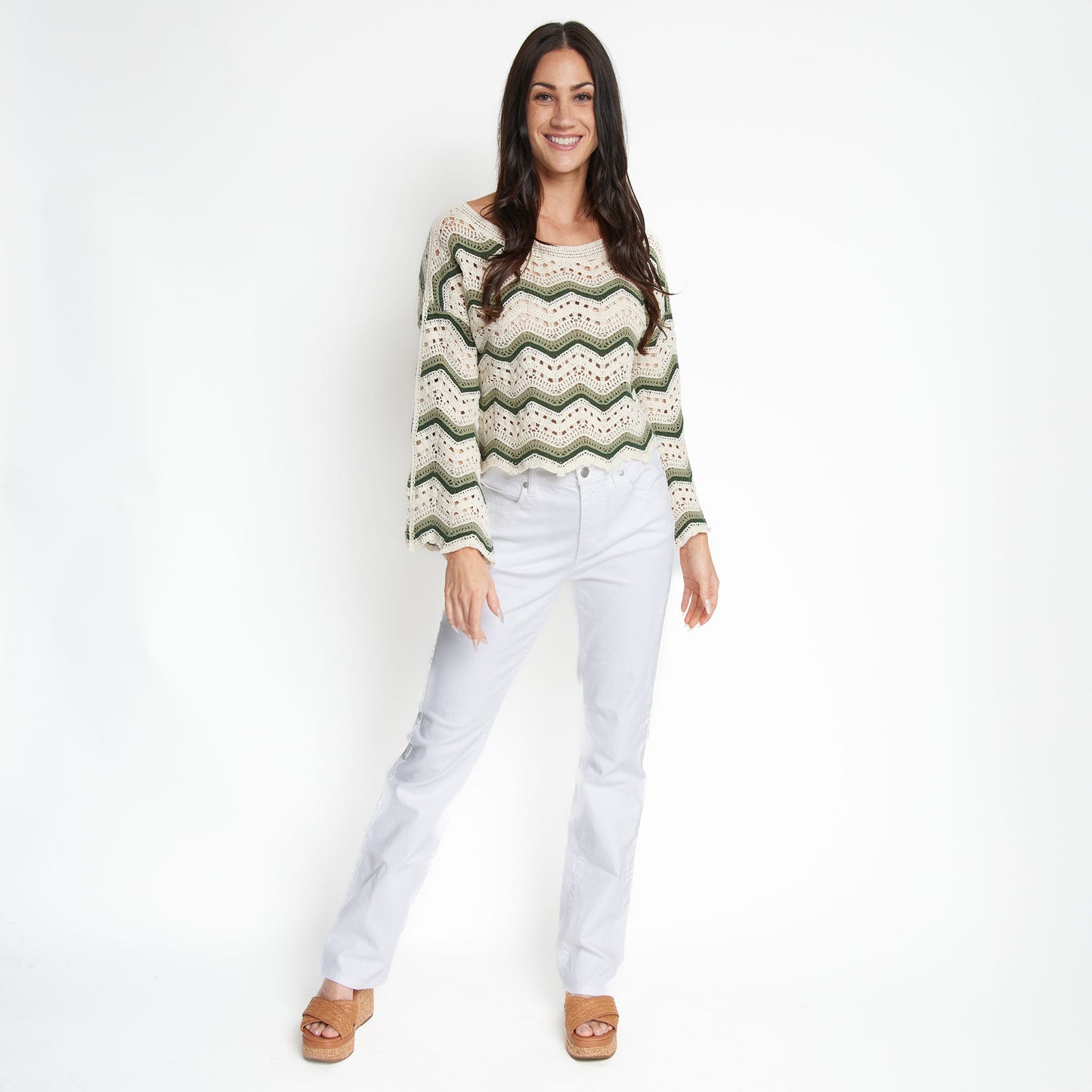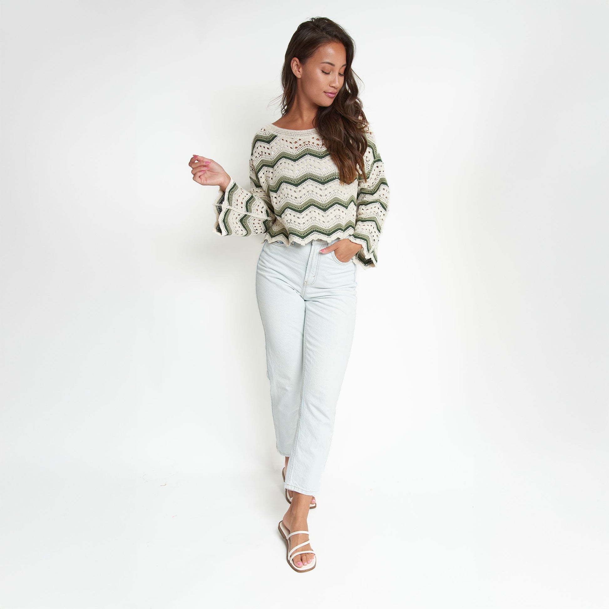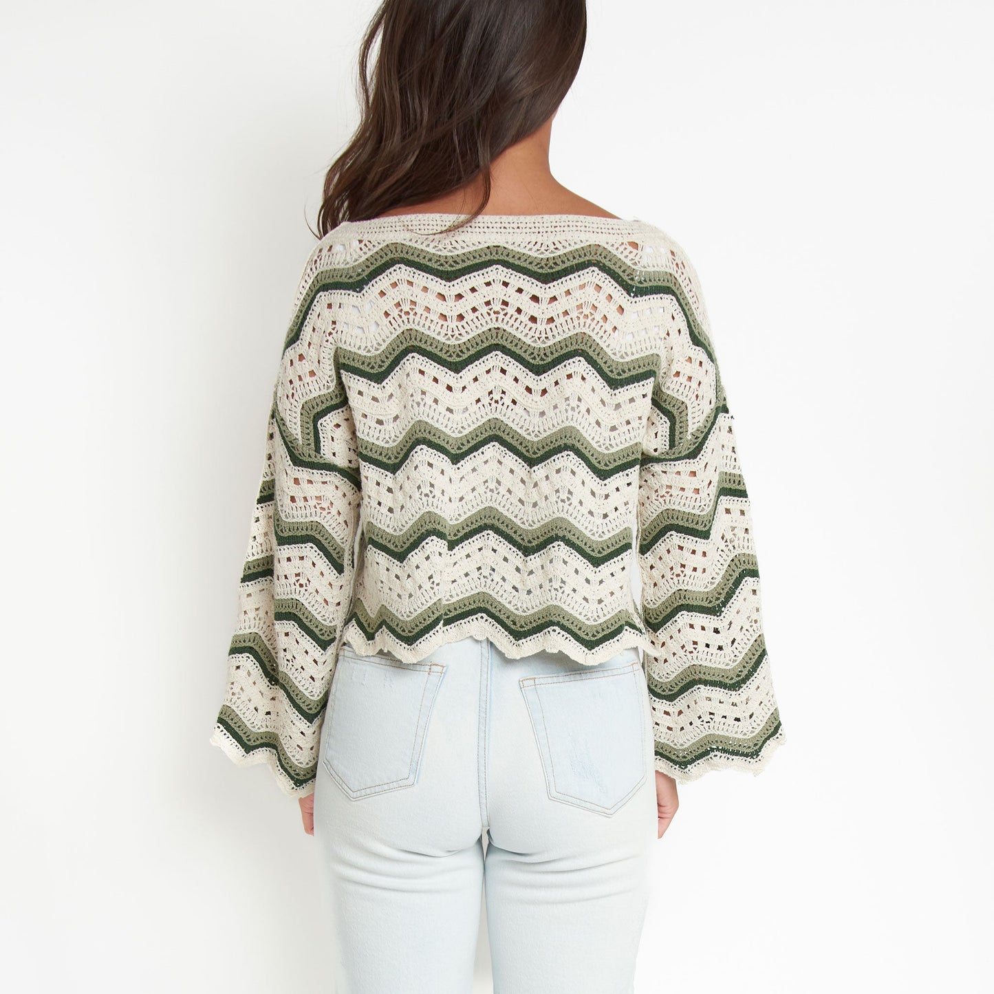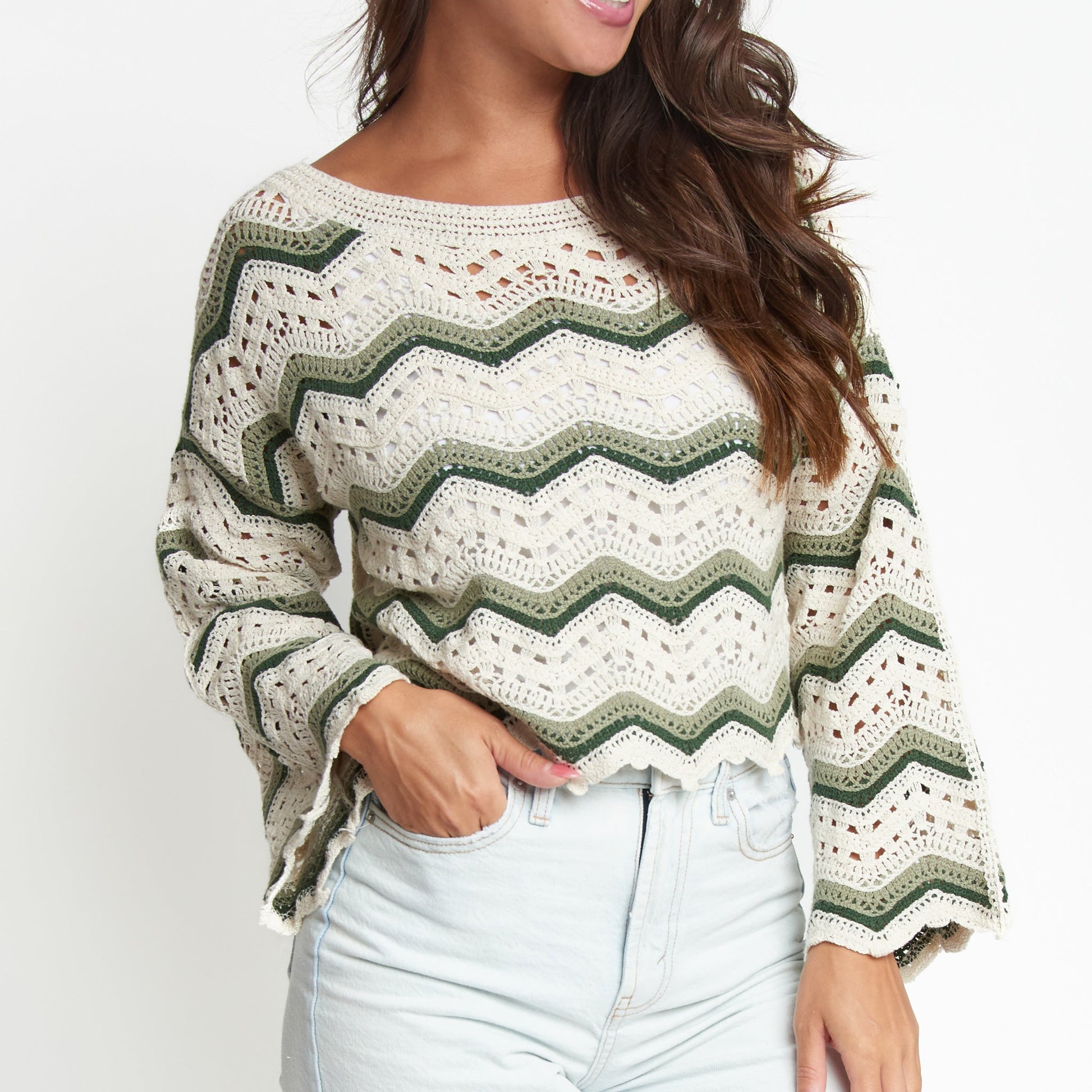Chic and on trend! The Kala Striped Crochet Sweater features fun bell sleeves, green & cream striped crochet knit, and adorable boat neckline. Wear on its own or over a swimsuit - it's a versatile essential!