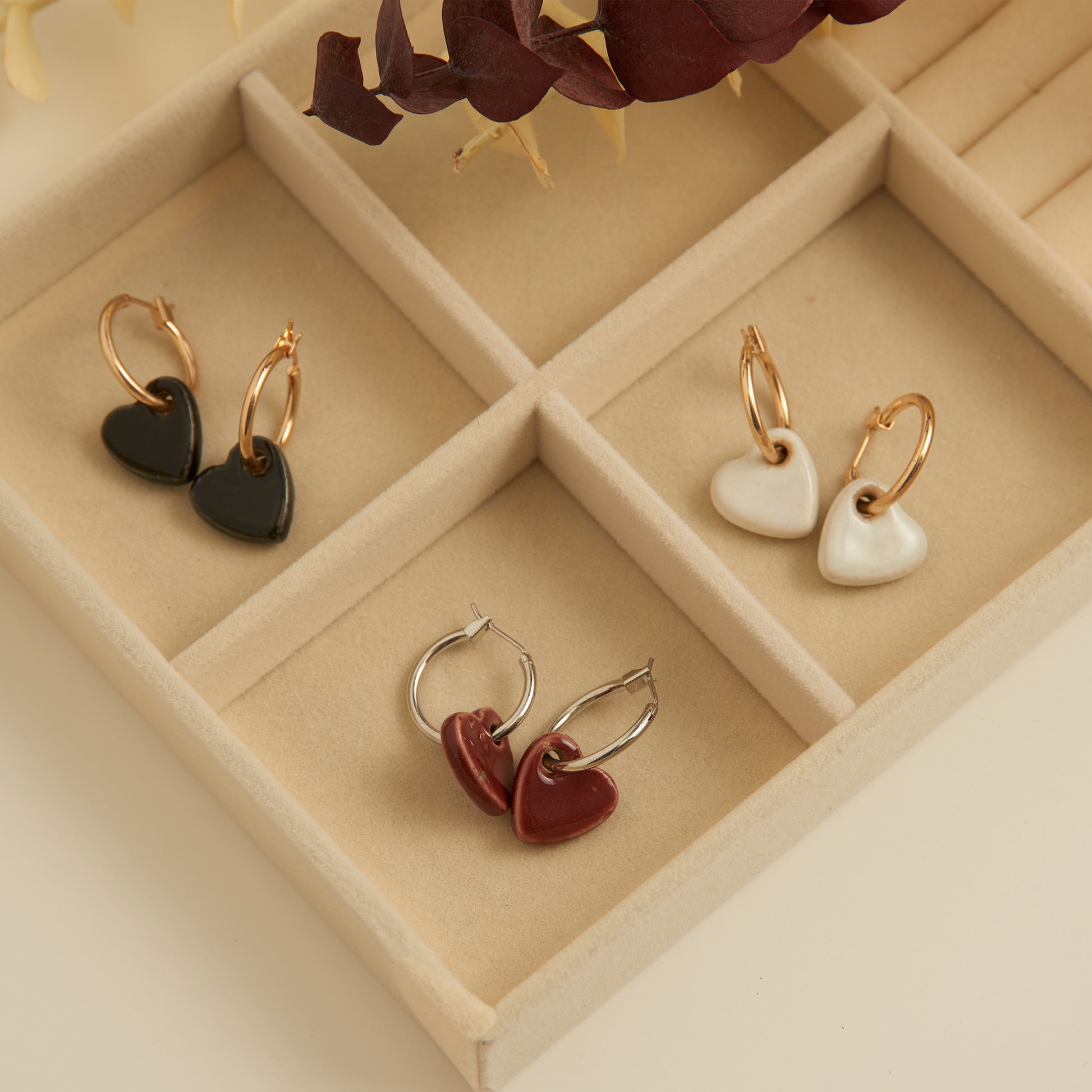 Cute and playful, the Kieryn Heart Charm Hoop Earrings feature lovely ceramic heart charms dangling off petite gold hoops. Small and lightweight, these earrings are easy to wear every day.