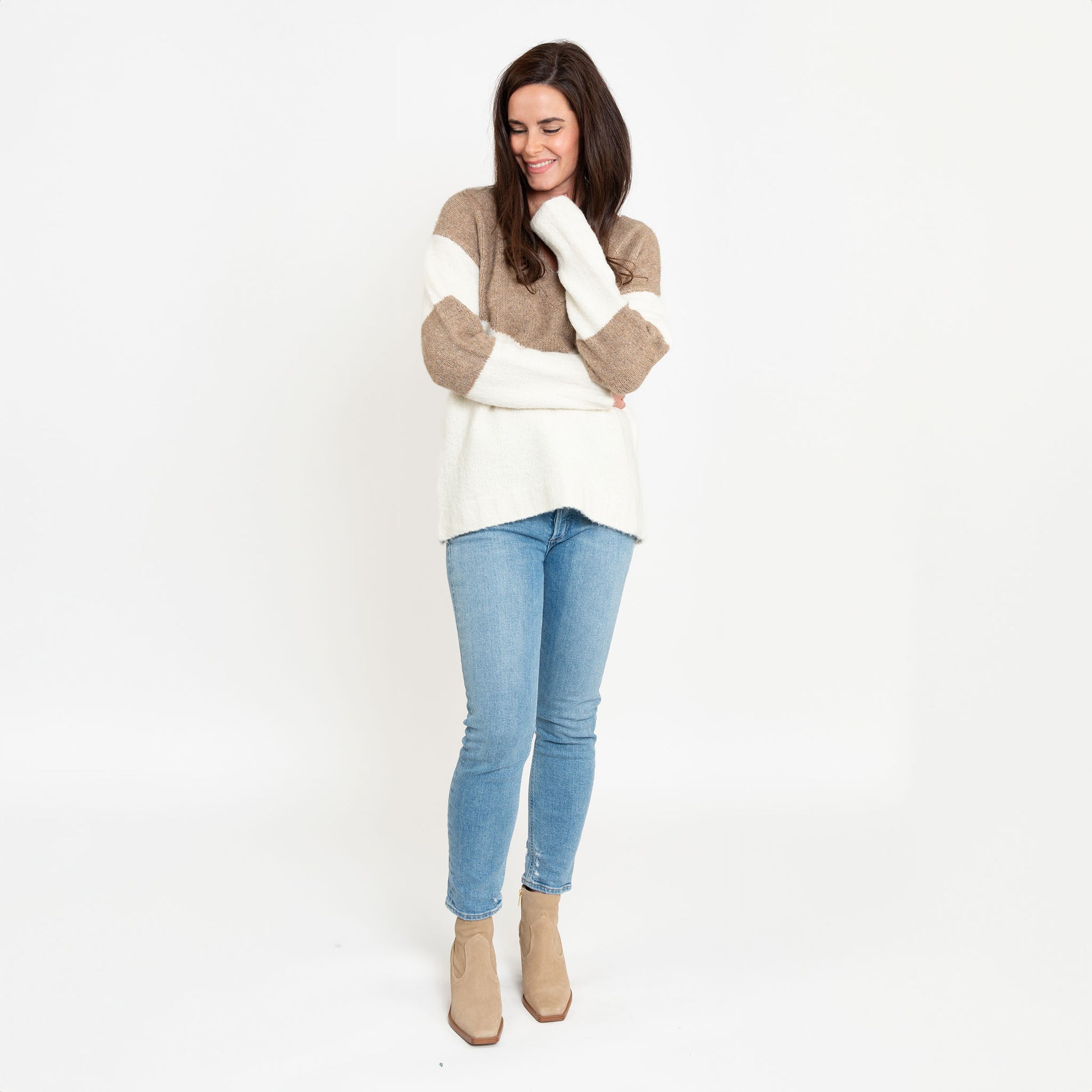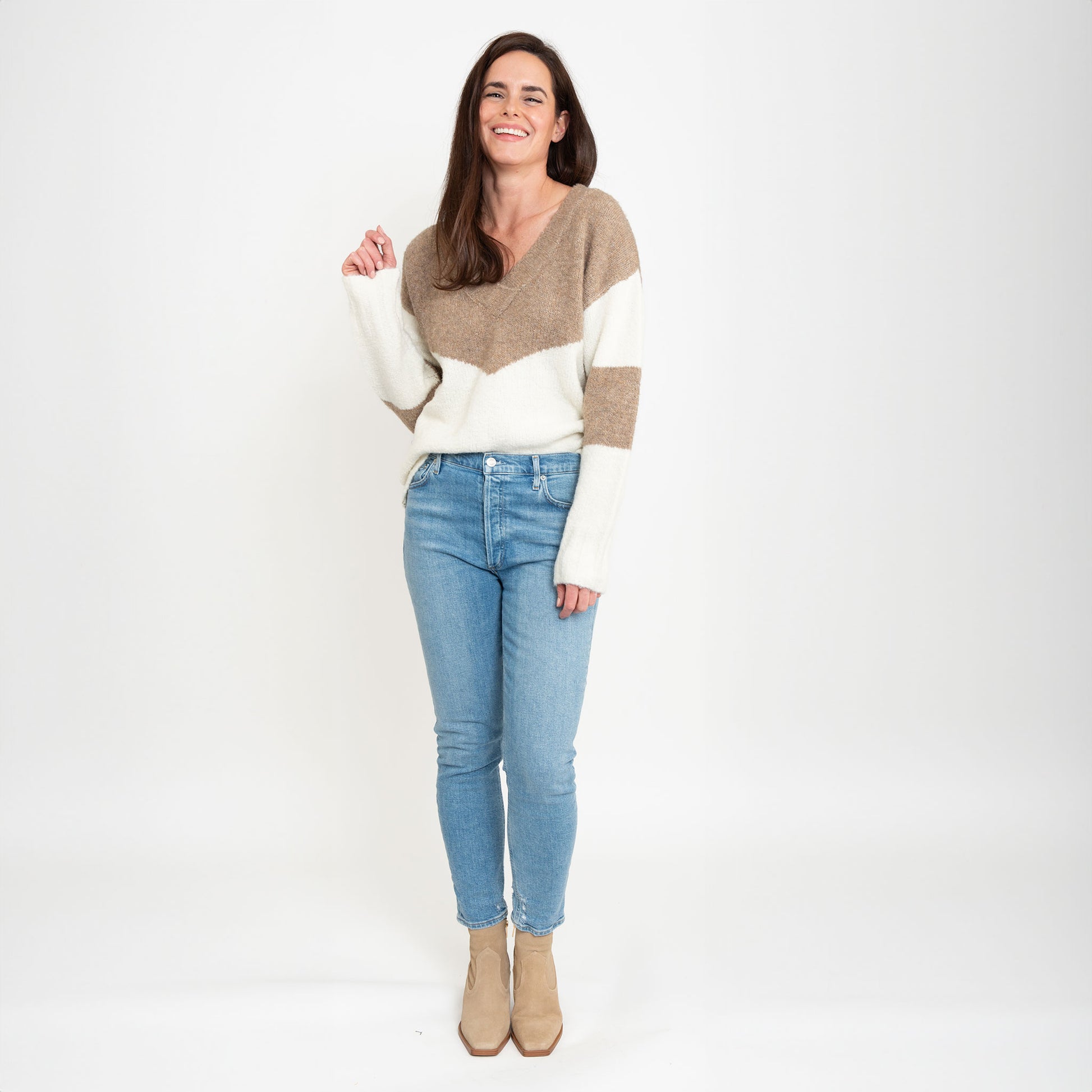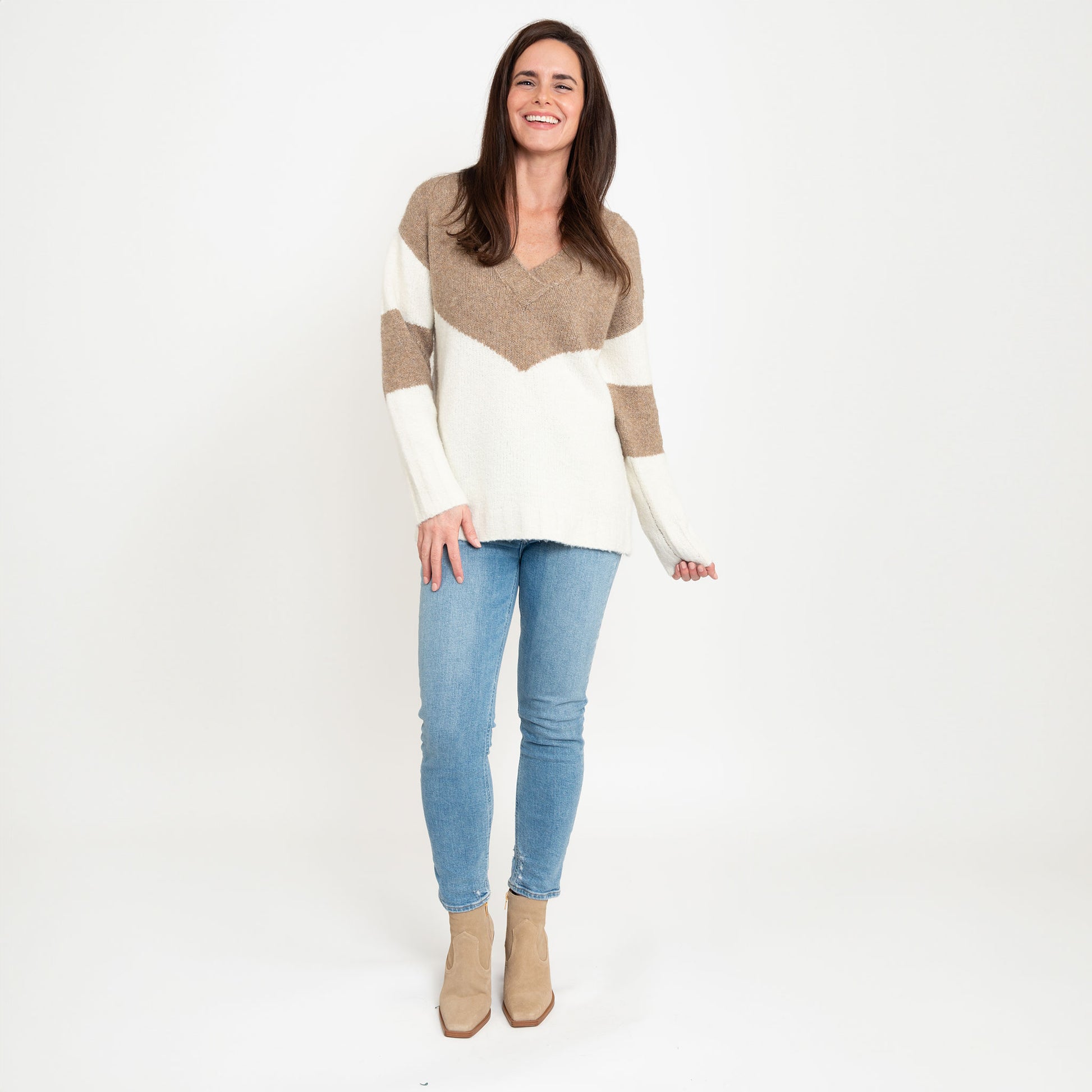 Cute in color block! The Lacen Color Block Sweater features a neutral taupe and white color block design with chic v-neck and trendy relaxed fit, all in a super soft and cozy knit. Stylish and comfy, this sweater is an absolute wardrobe essential.