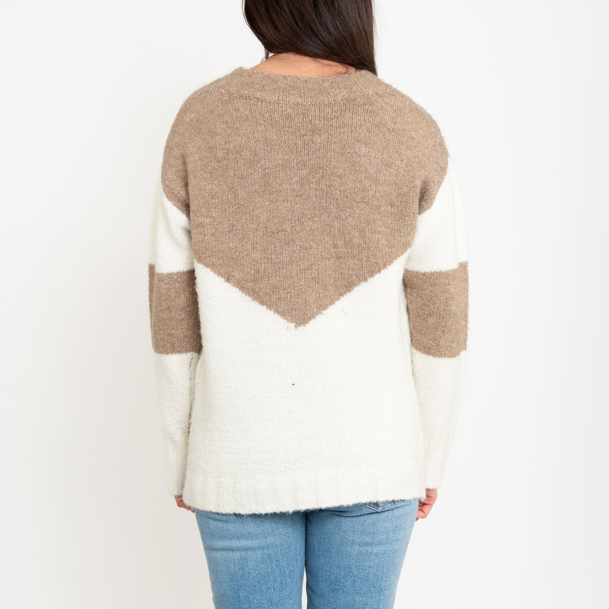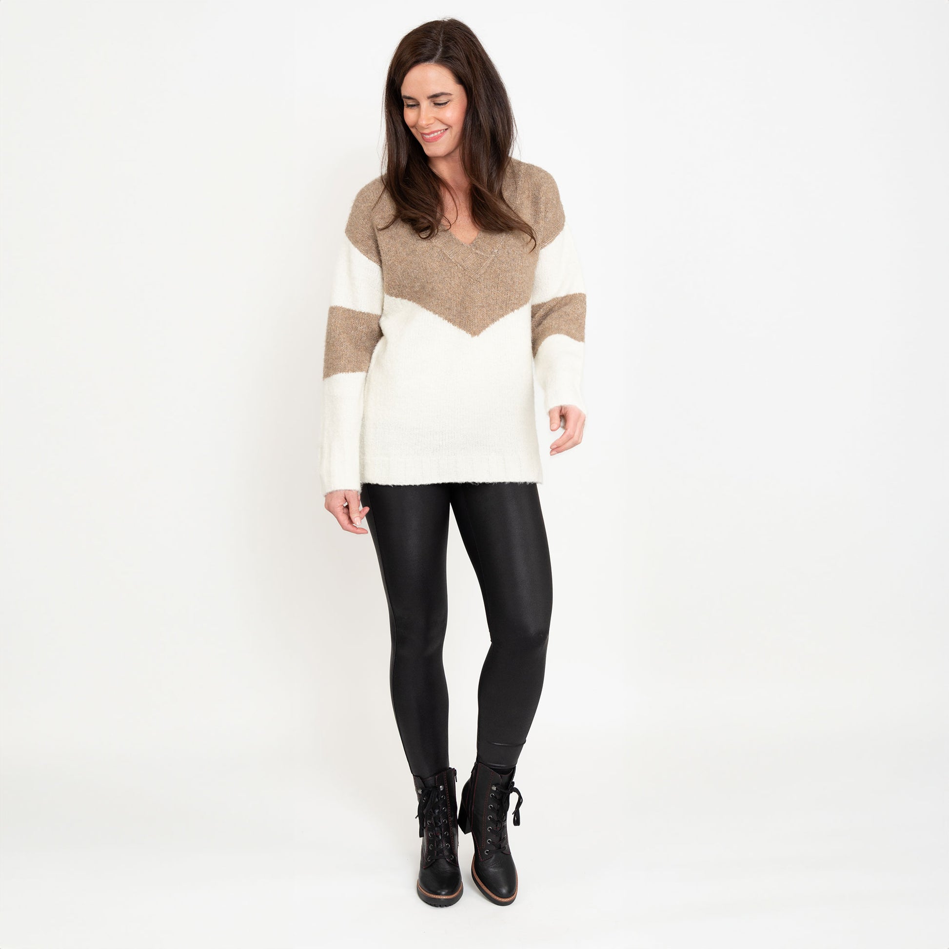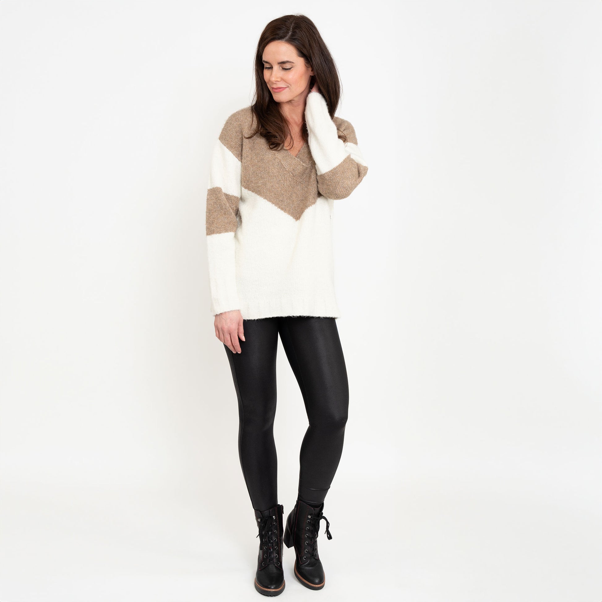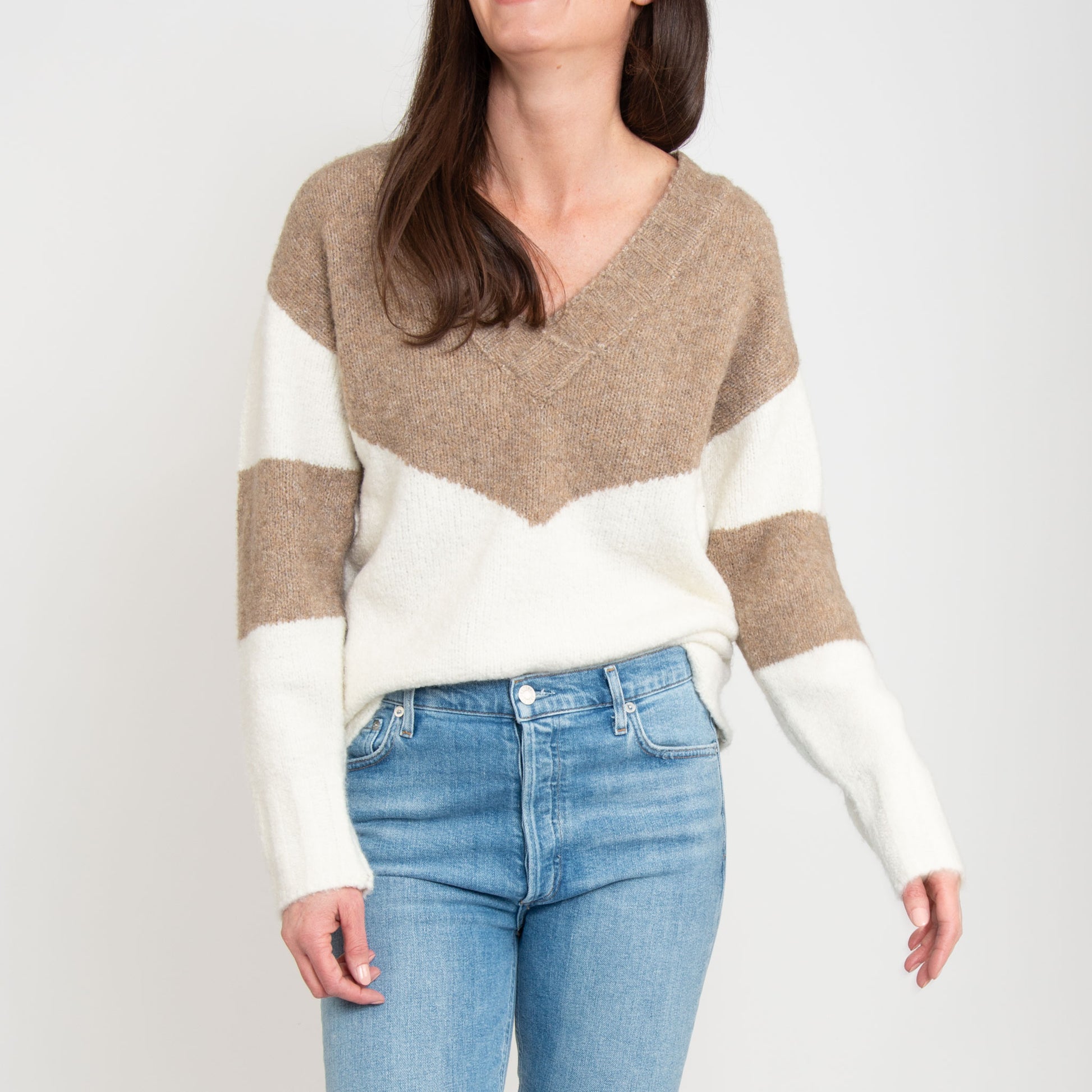 Cute in color block! The Lacen Color Block Sweater features a neutral taupe and white color block design with chic v-neck and trendy relaxed fit, all in a super soft and cozy knit. Stylish and comfy, this sweater is an absolute wardrobe essential.