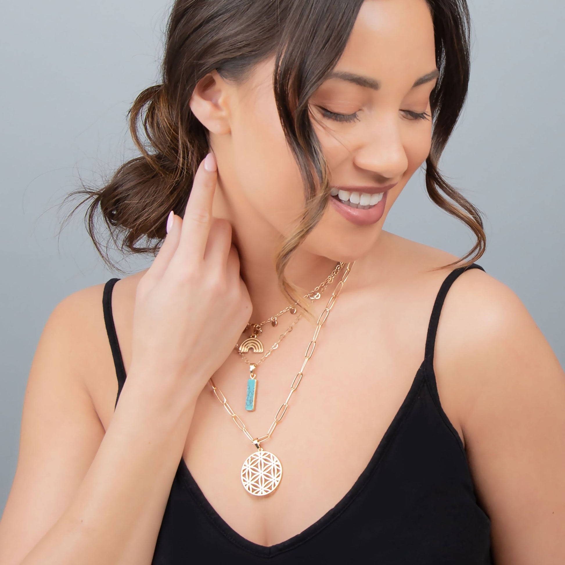 Create a look all your own with the Layer Me Rainbow Pendant Charm. Featuring a timeless gold charm with classic rainbow design, this pendant charm makes any Layer Me Chain Necklace uniquely you.