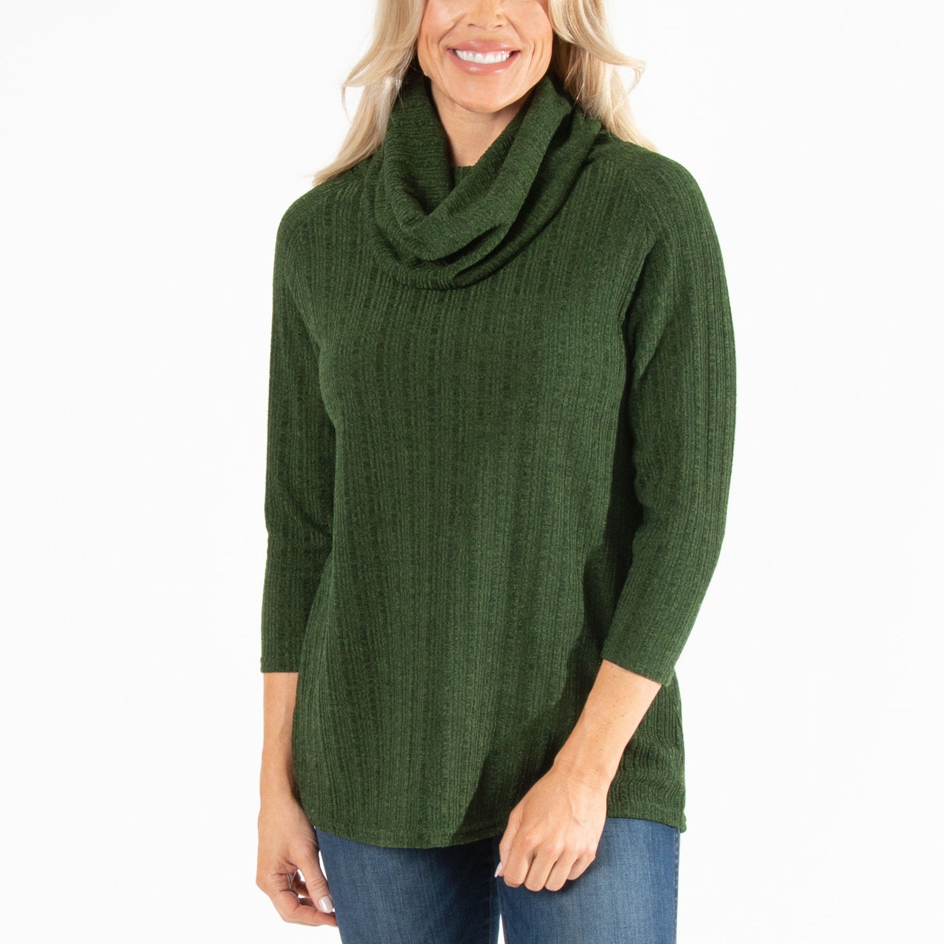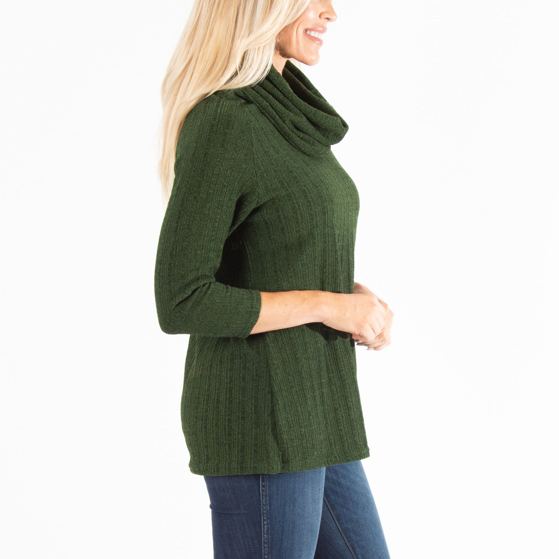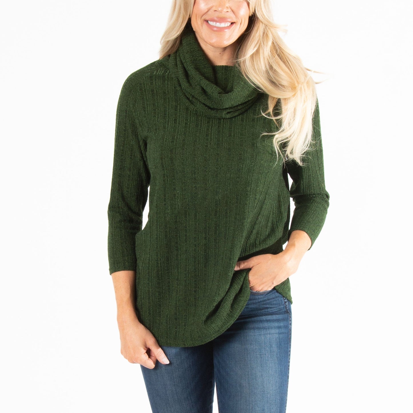 So comfy and cute in the cooler weather! The Lola Cowl Neck Swing Top features a ribbed jersey fabric with 3/4 length sleeves, cowl neckline, and flowy swing hemline. You'll never want to take it off!