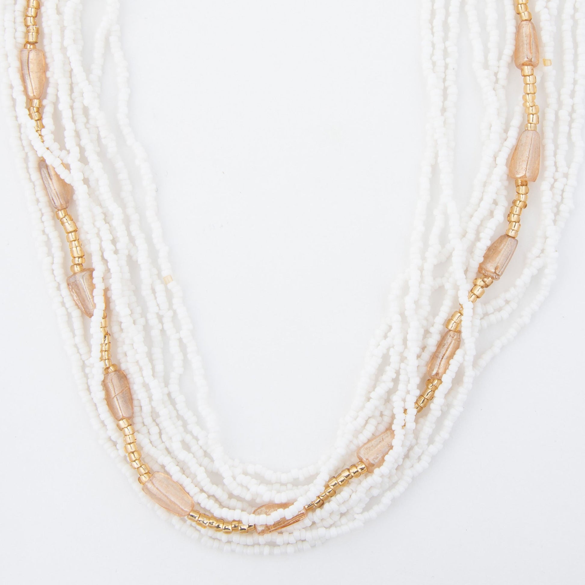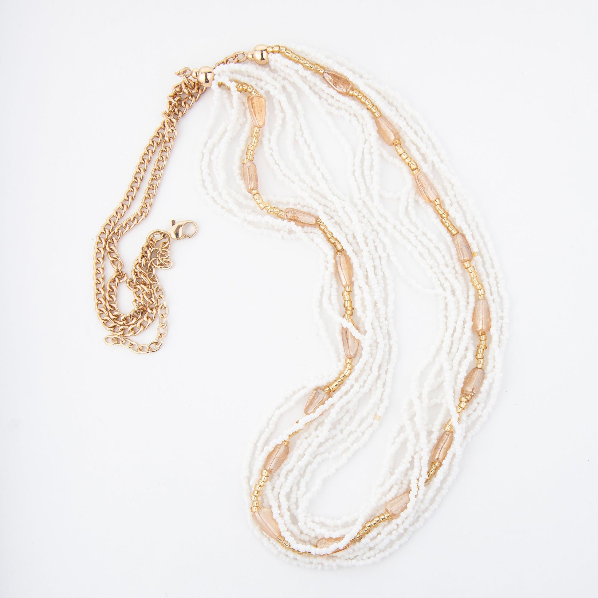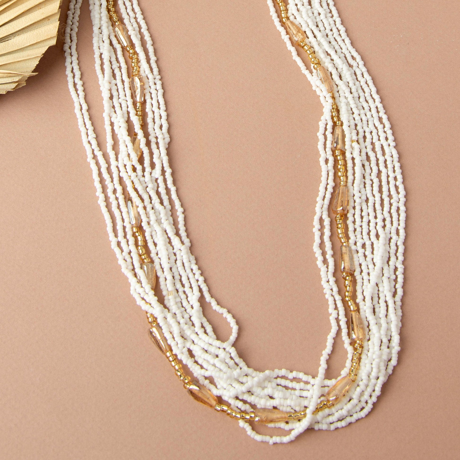 Sophisticated and vibrant, the Luz Multi Row Braided Seed Bead Necklace features multiple rows of white seed beaded chains. The gold accents only add to its charm. Playful and feminine, this statement necklace is sure to turn heads.