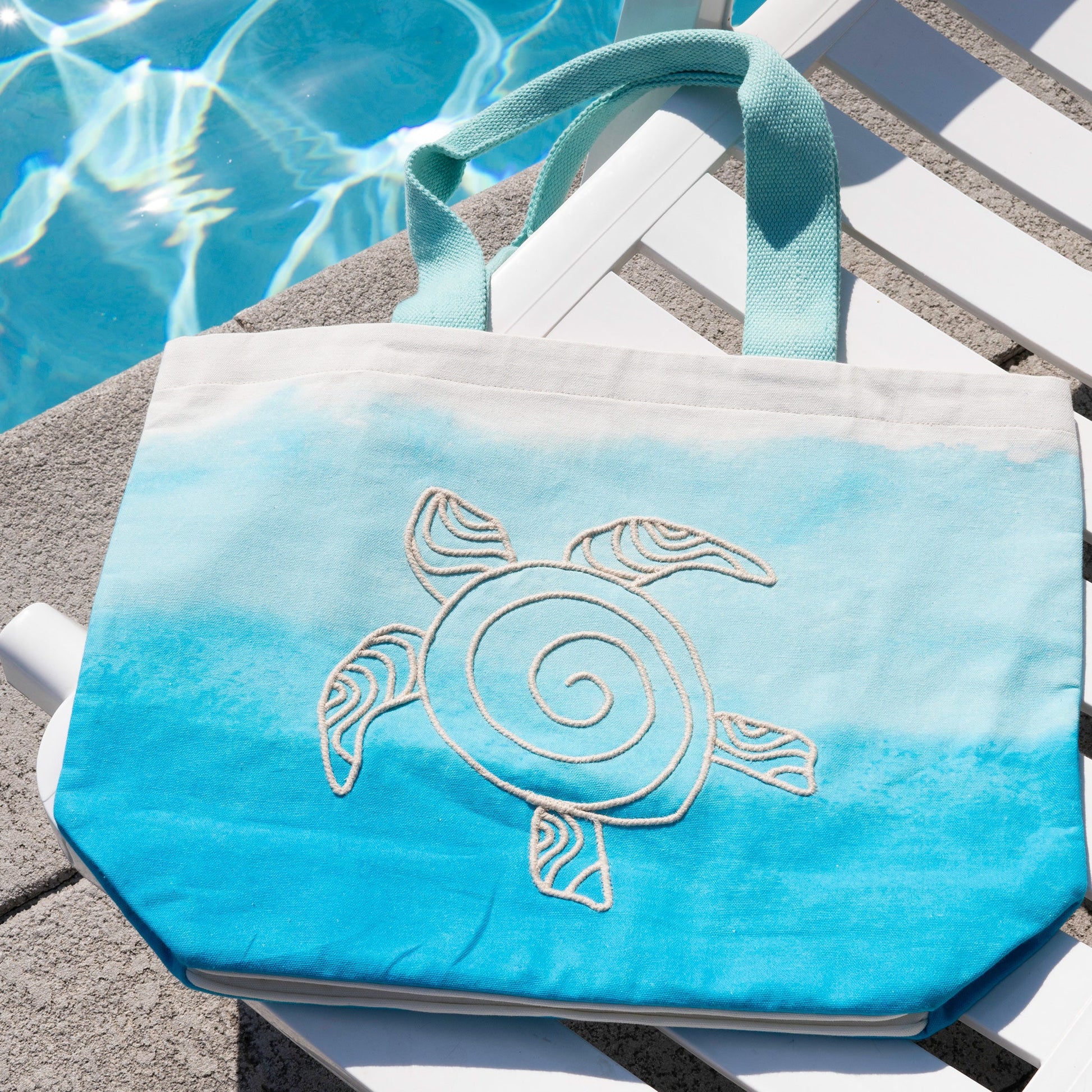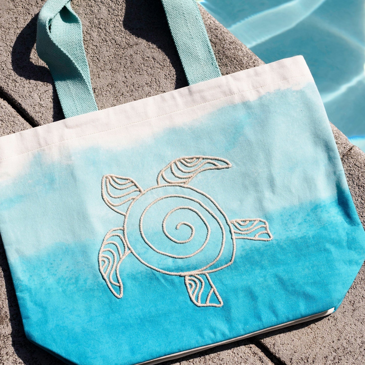 You'll be beach ready with the Maui Water Resistant Tote! Water resistant so your belongings won't get wet, this tote bag features a vibrant blue color with a gorgeous sea turtle hand embroidered across the front and inner pockets inside for extra organization, this water resistant bag will be your new summertime staple.