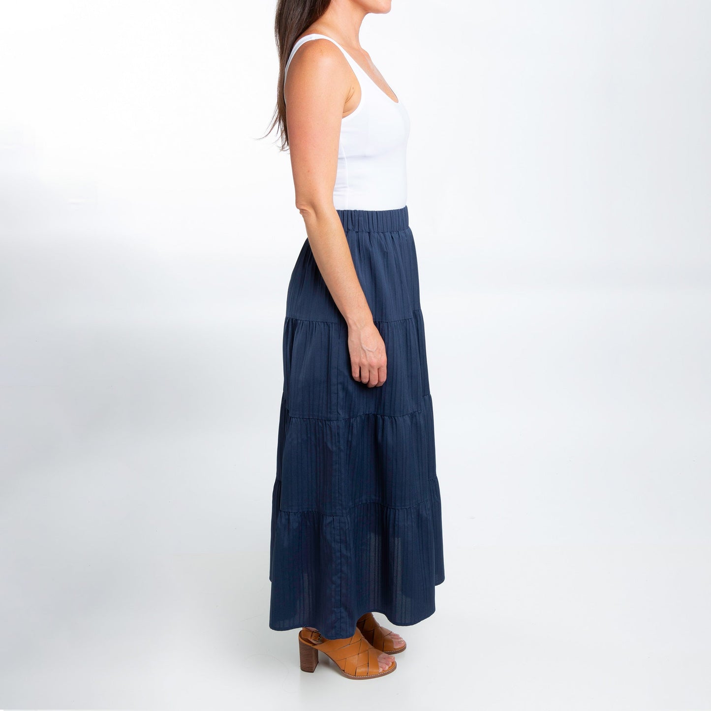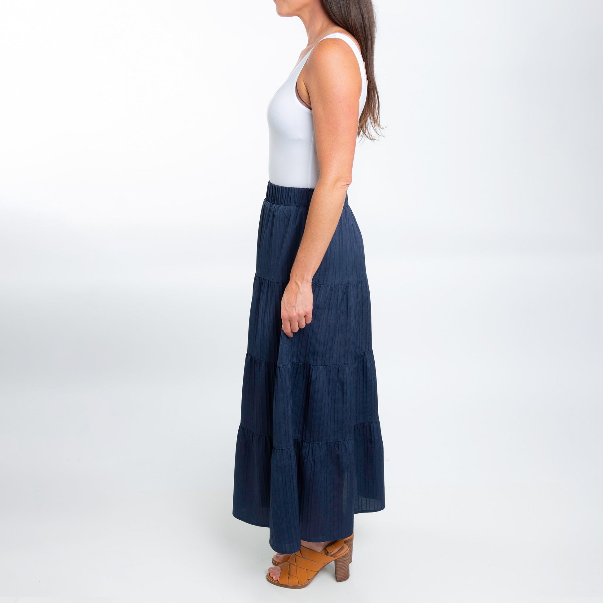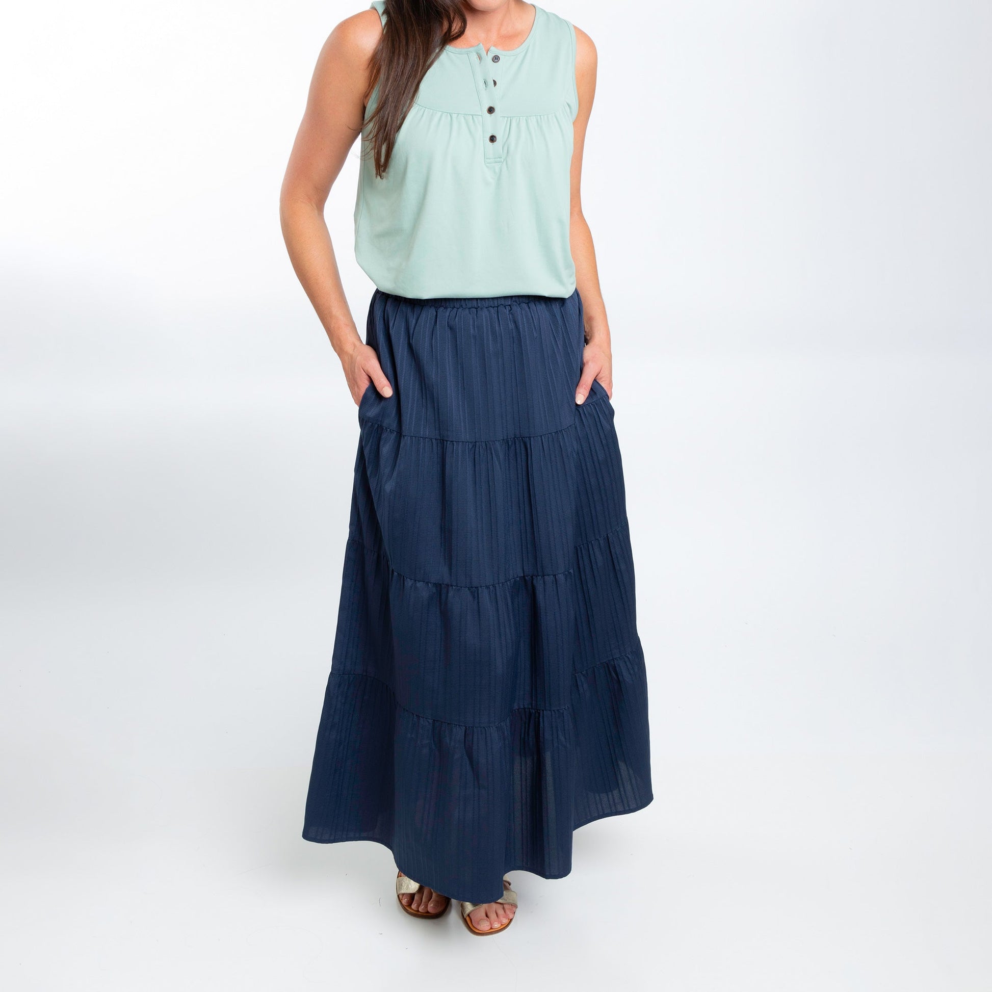A summer essential, the McKay Tiered Maxi Skirt features a beautiful midnight blue with trendy paneled detailing, side pockets, comfortable elastic waistband, and inner lining to the knees - all in a maxi length! This lightweight and easy to wear skirt will easily become your new favorite.