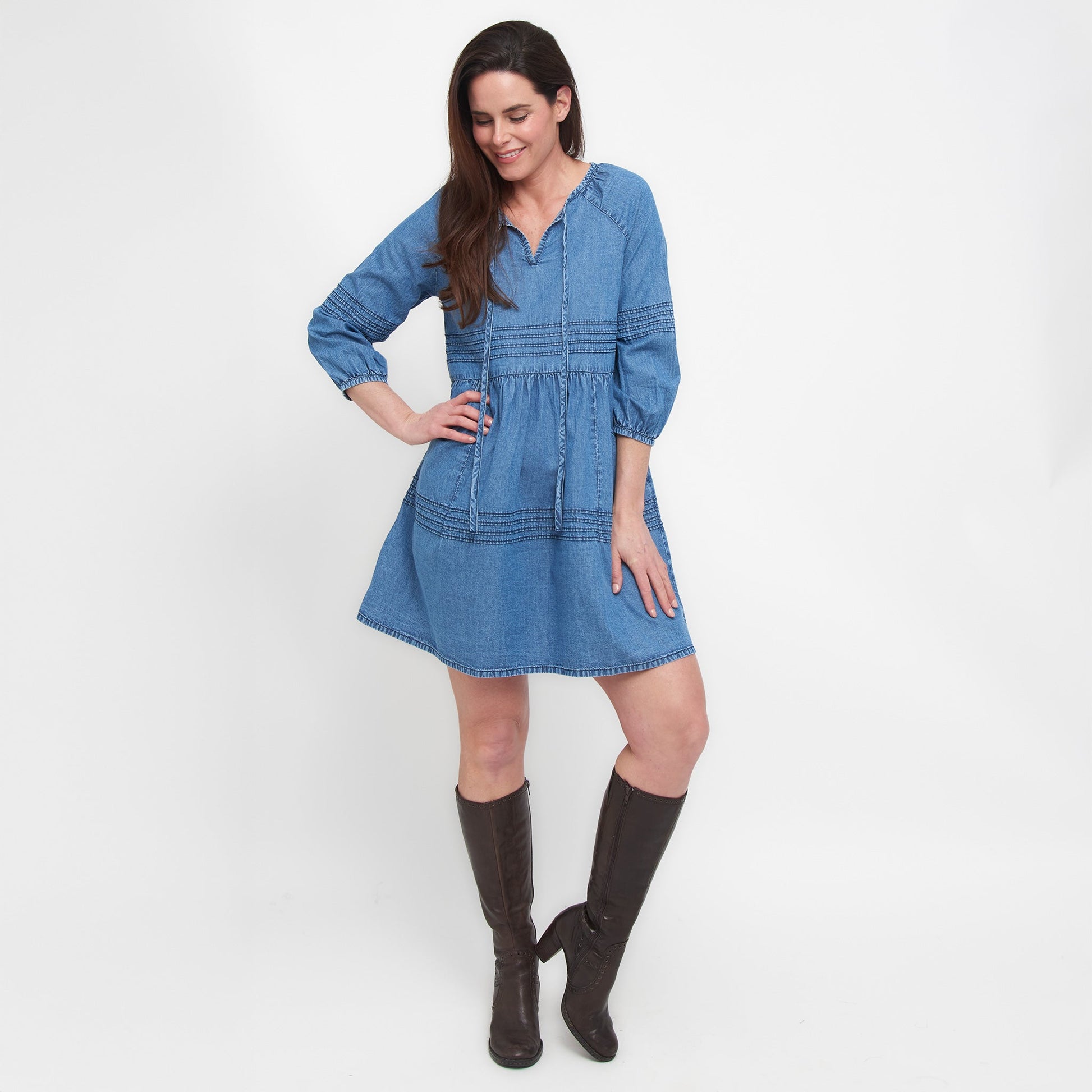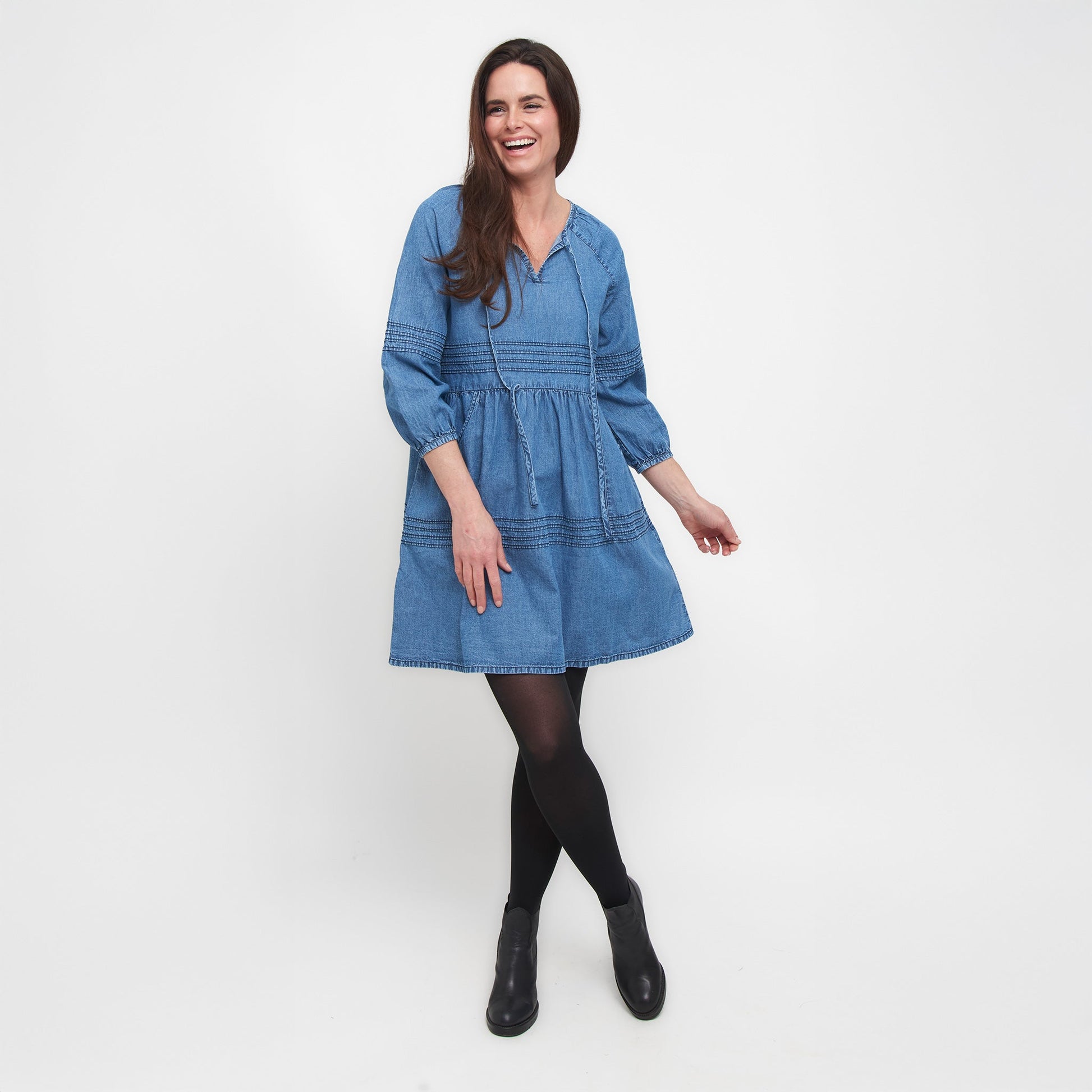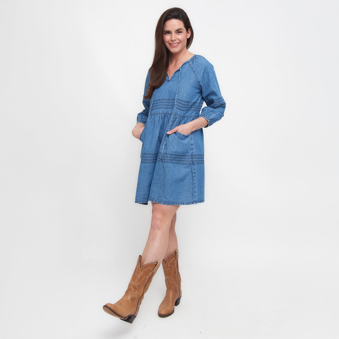 Update your wardrobe with the chic Micah Babydoll Dress. Made of 100% cotton denim, featuring long sleeves, cute tie at the neckline and classic babydoll design, this dress looks adorable on its own or paired with your favorite cardigan or blazer.