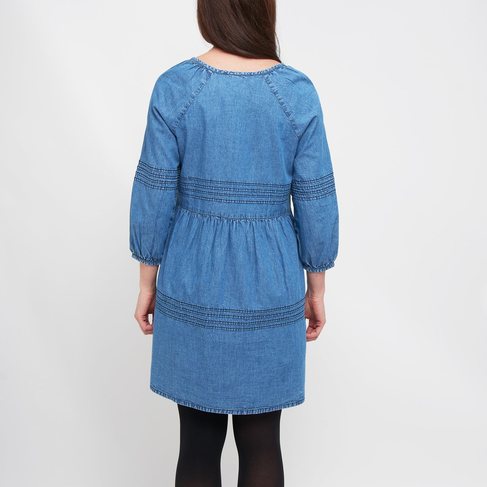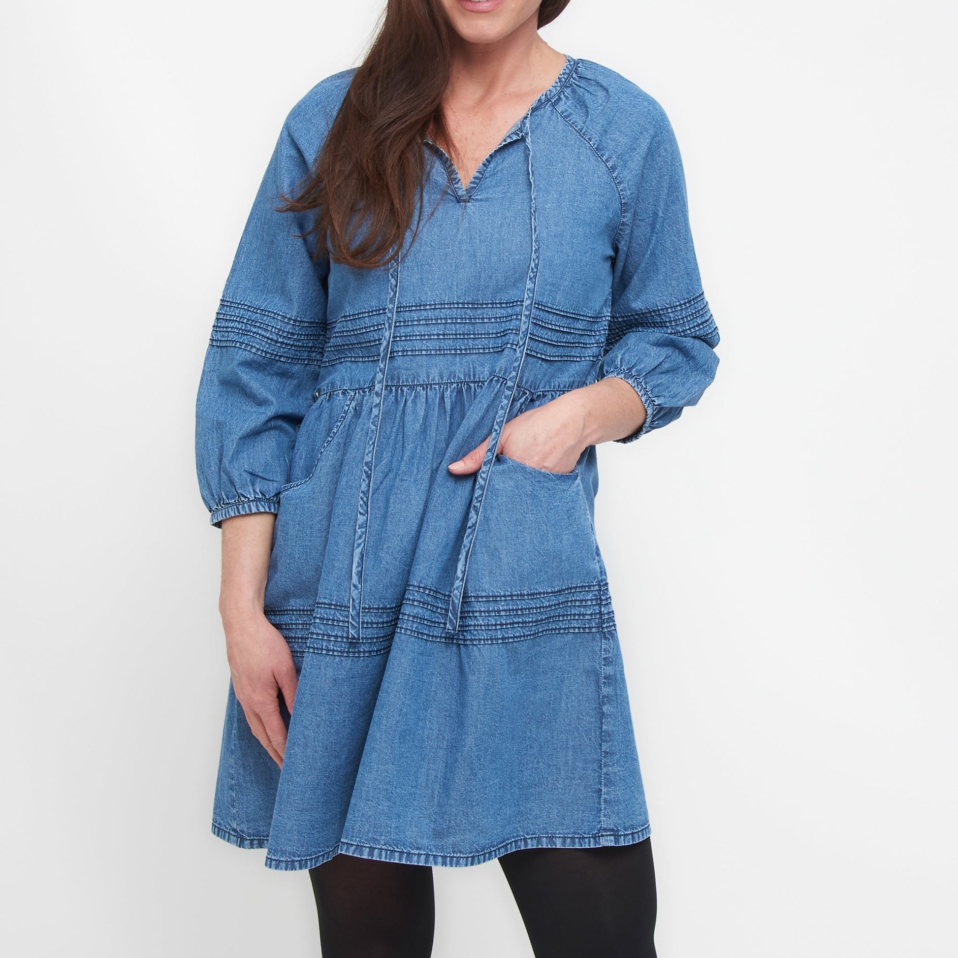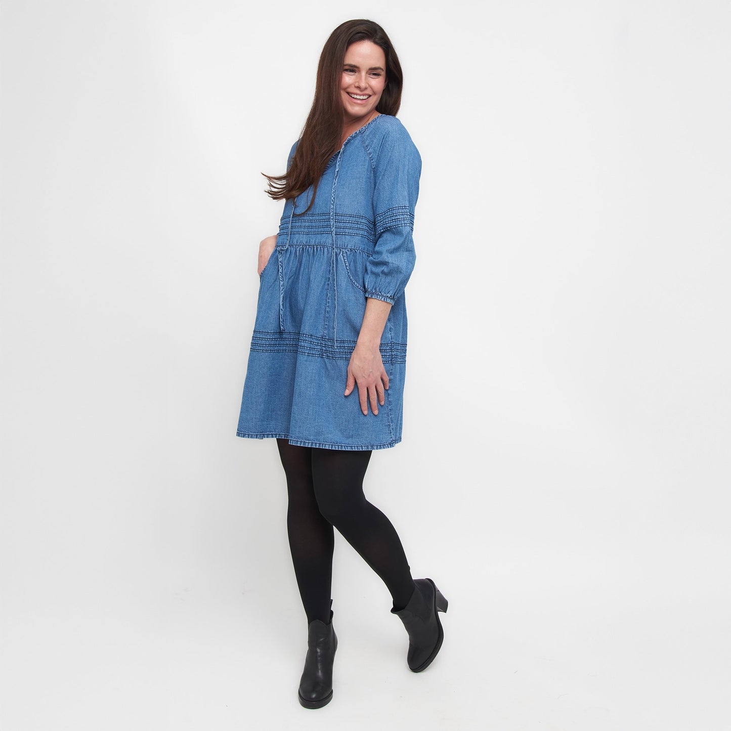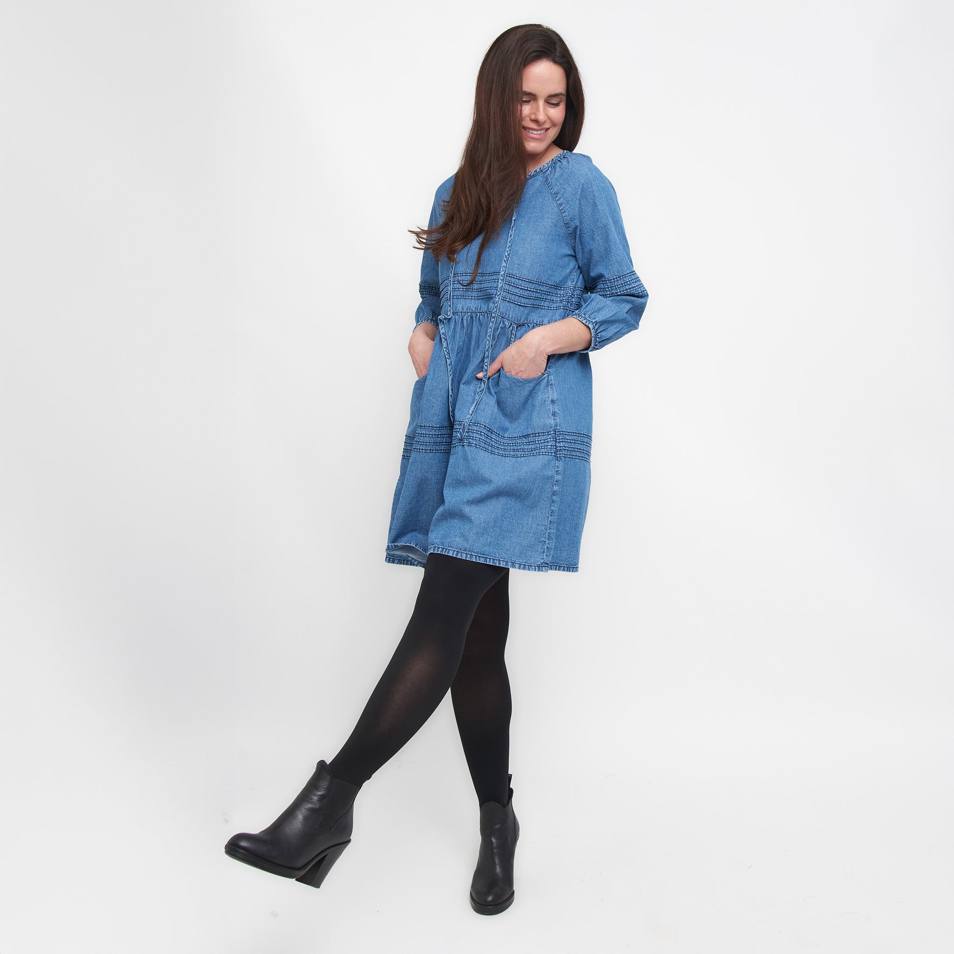 Update your wardrobe with the chic Micah Babydoll Dress. Made of 100% cotton denim, featuring long sleeves, cute tie at the neckline and classic babydoll design, this dress looks adorable on its own or paired with your favorite cardigan or blazer.