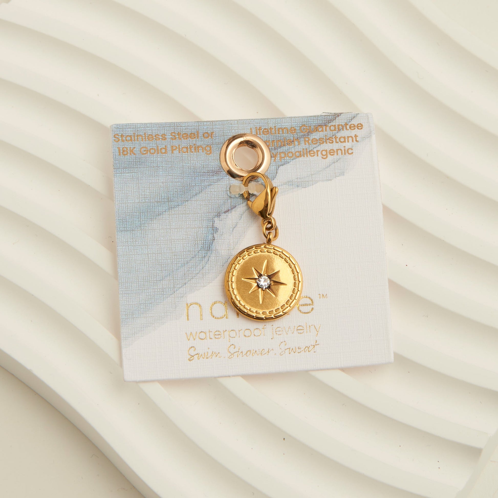 Adorable and durable, the Narelle Waterproof Compass Charm features an 18k gold plated compass charm with gemstone center and is perfect for those with wanderlust. Attach it to your favorite Narelle Waterproof bracelet or necklace to easily create a look as unique as you! Hypoallergenic, tarnish resistant with a lifetime color guarantee