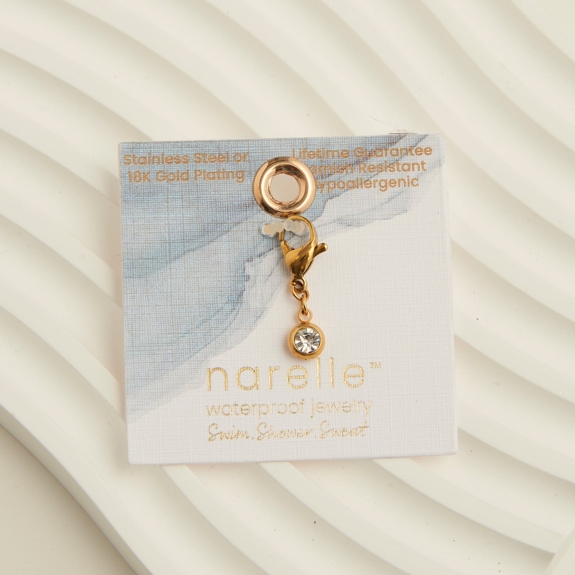 Adorable and durable, the Narelle Waterproof Cubic Zirconia Drop Charm features an 18k gold plated clasp with shimmery Cubic Zirconia drop charm. Attach it to your favorite Narelle Waterproof bracelet or necklace to easily create a look as unique as you! Hypoallergenic, tarnish resistant with a lifetime color guarantee.