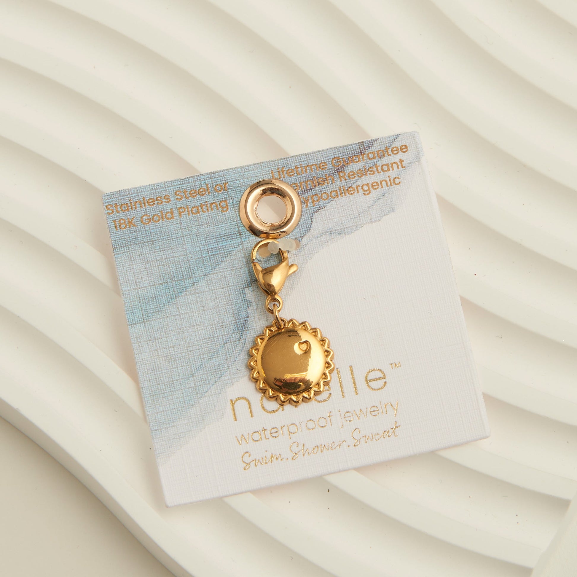 Adorable and durable, the Narelle Waterproof Disc Charm features an 18k gold plated dainty charm. Attach it to your favorite Narelle Waterproof bracelet or necklace to easily create a look as unique as you! Hypoallergenic, tarnish resistant with a lifetime color guarantee.