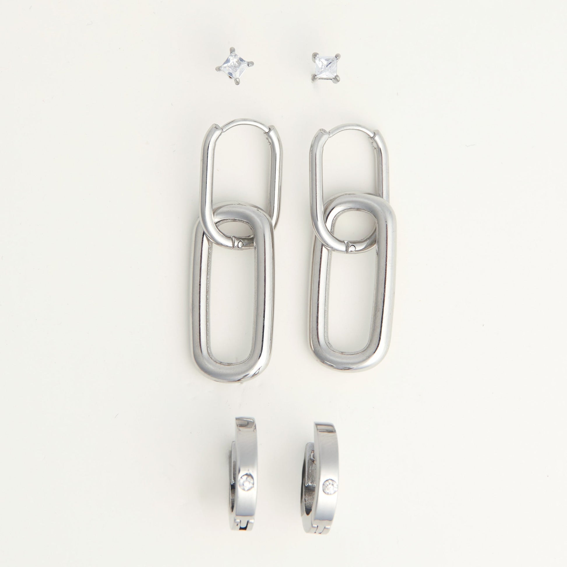Chic and understated, the Narelle Waterproof Double Linked Hoop Earring Trio offers three pairs of earrings in trendy hoop, link, and post designs, all in a classic silver. Make a statement with the double linked pair, or keep it simple with the post, the options are endless with this versatile set! Waterproof , stainless steel plated and made with a specialized PVD technique to withstand the rigors of life, from swimming and showering to sweating through your most intense workouts, all without ever losing its shine.