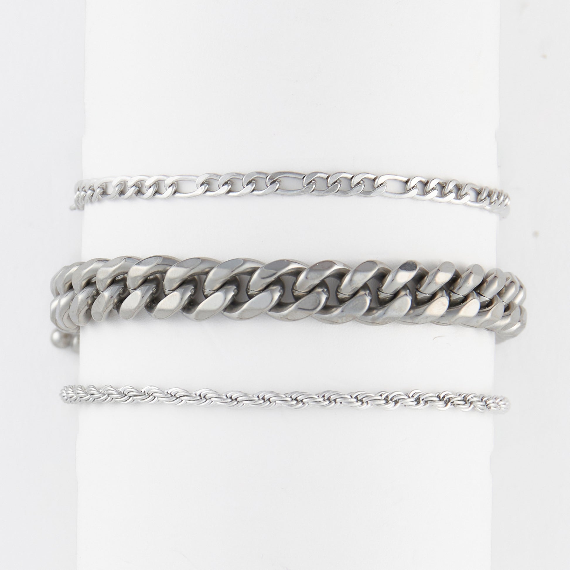 A modern take on classic designs! The Narelle Waterproof Figaro Chain Bracelet Set offers three pairs of silver bracelets in Chunky, Figaro, and Dainty Chain designs. Wear them together as part of a stack, or on their own for a delicate, minimalist look. The styling options are endless! Waterproof , stainless steel plated and made with a specialized PVD technique to withstand the rigors of life, from swimming and showering to sweating through your most intense workouts, all without ever losing its shine.
