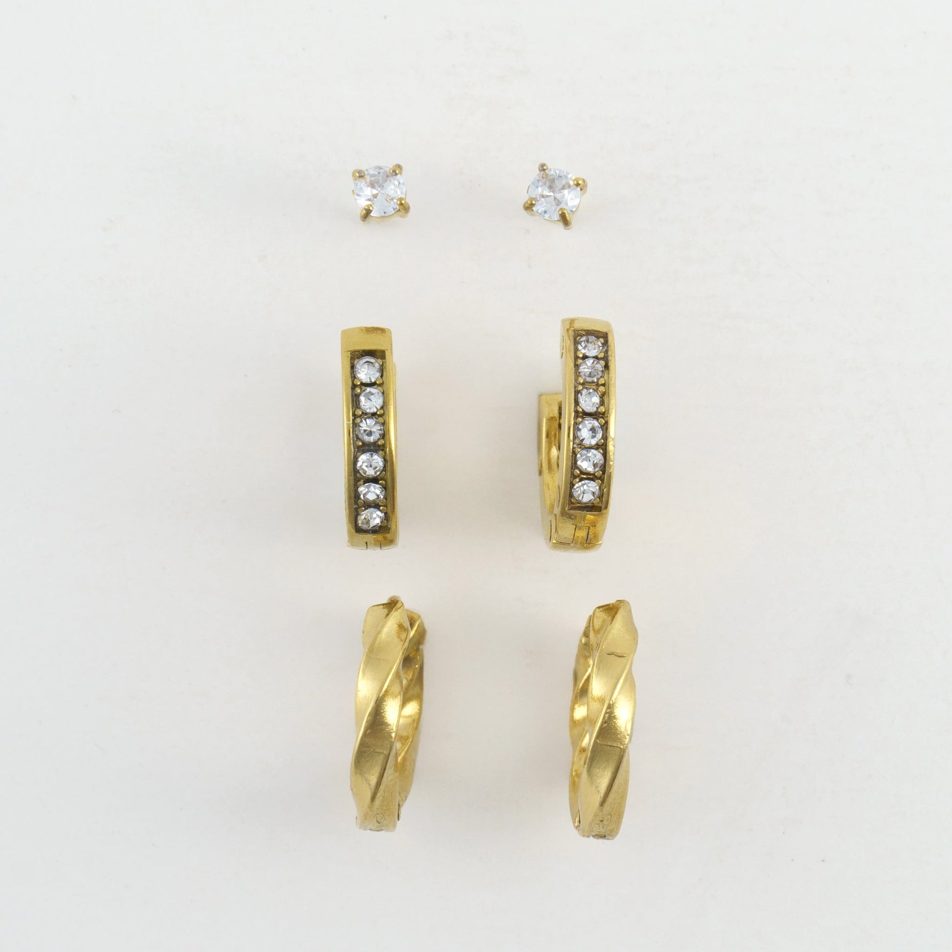Chic and understated, the Narelle Waterproof Pave Hoop Earring Trio offers three pairs of earrings in trendy hoop and post designs, all in a classic gold and featuring a little bit of sparkle. Go bold with the chunky, twisted hoop, or keep it simple with the post, the options are endless with this versatile set! Waterproof , 18K gold plated and made with a specialized PVD technique to withstand the rigors of life, from swimming and showering to sweating through your most intense workouts, all without ever losing its shine.