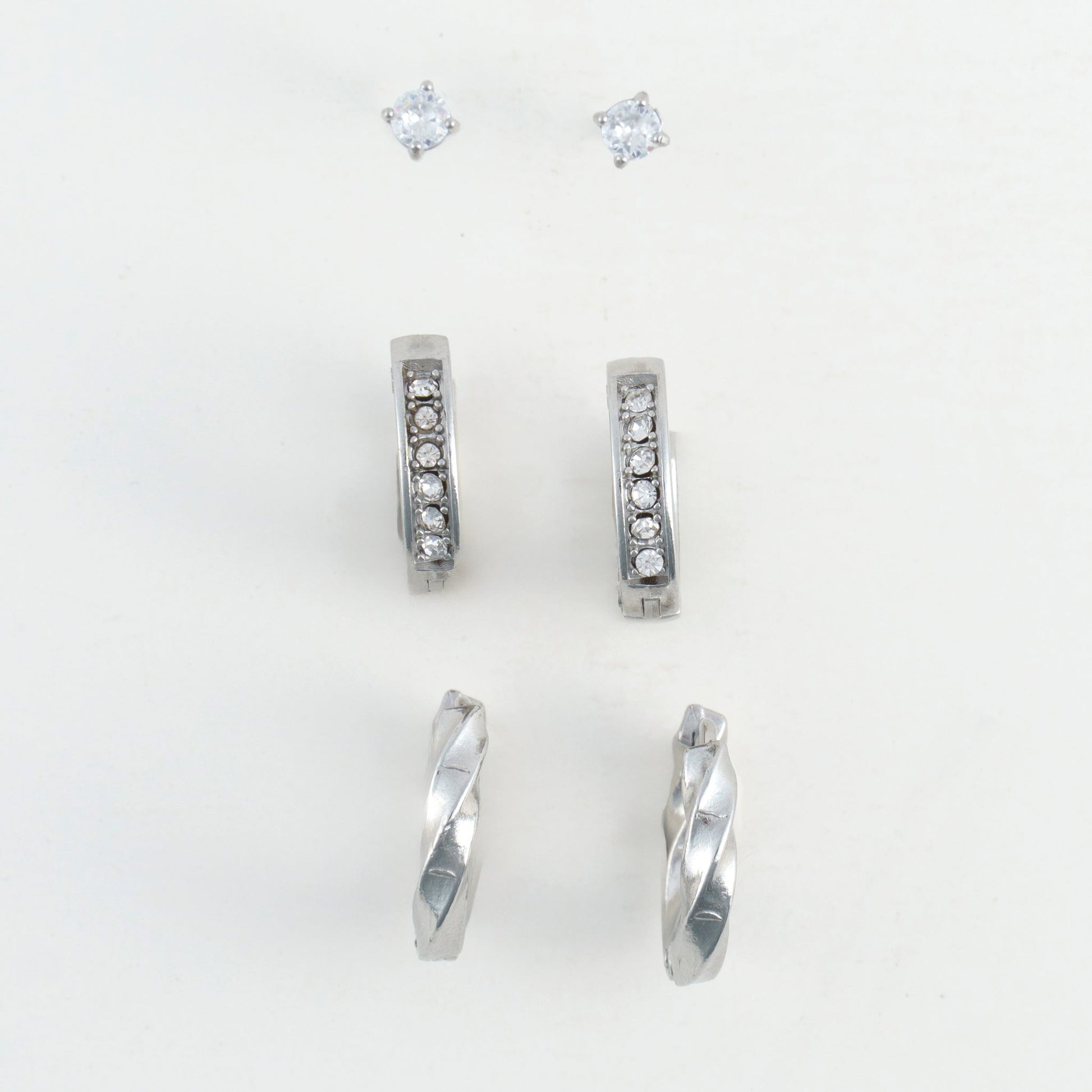 Chic and understated, the Narelle Waterproof Pave Hoop Earring Trio offers three pairs of earrings in trendy hoop and post designs, all in a classic silver and featuring a little bit of sparkle. Go bold with the chunky, twisted hoop, or keep it simple with the post, the options are endless with this versatile set! Waterproof , stainless steel plated and made with a specialized PVD technique to withstand the rigors of life, from swimming and showering to sweating through your most intense workouts, all without ever losing its shine.