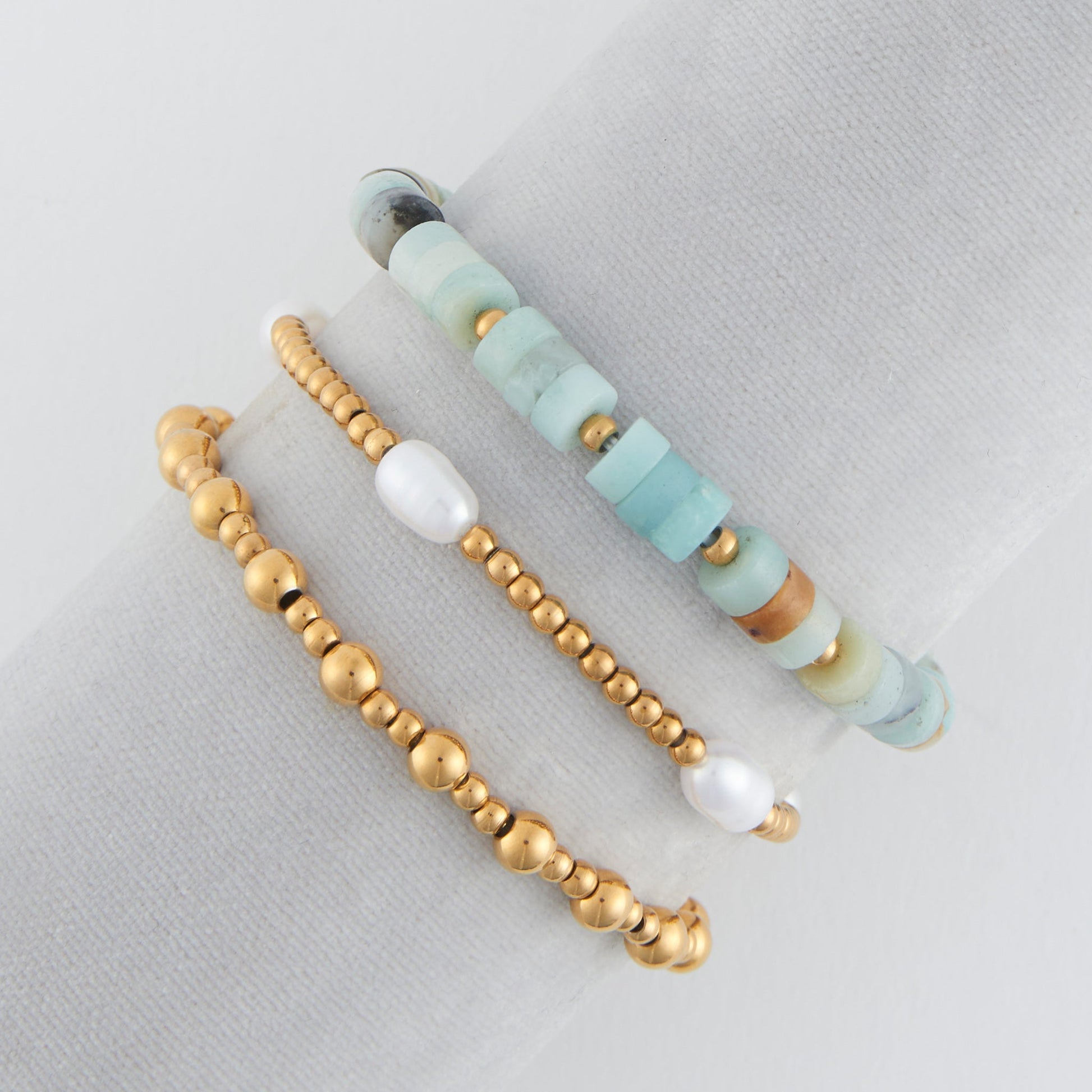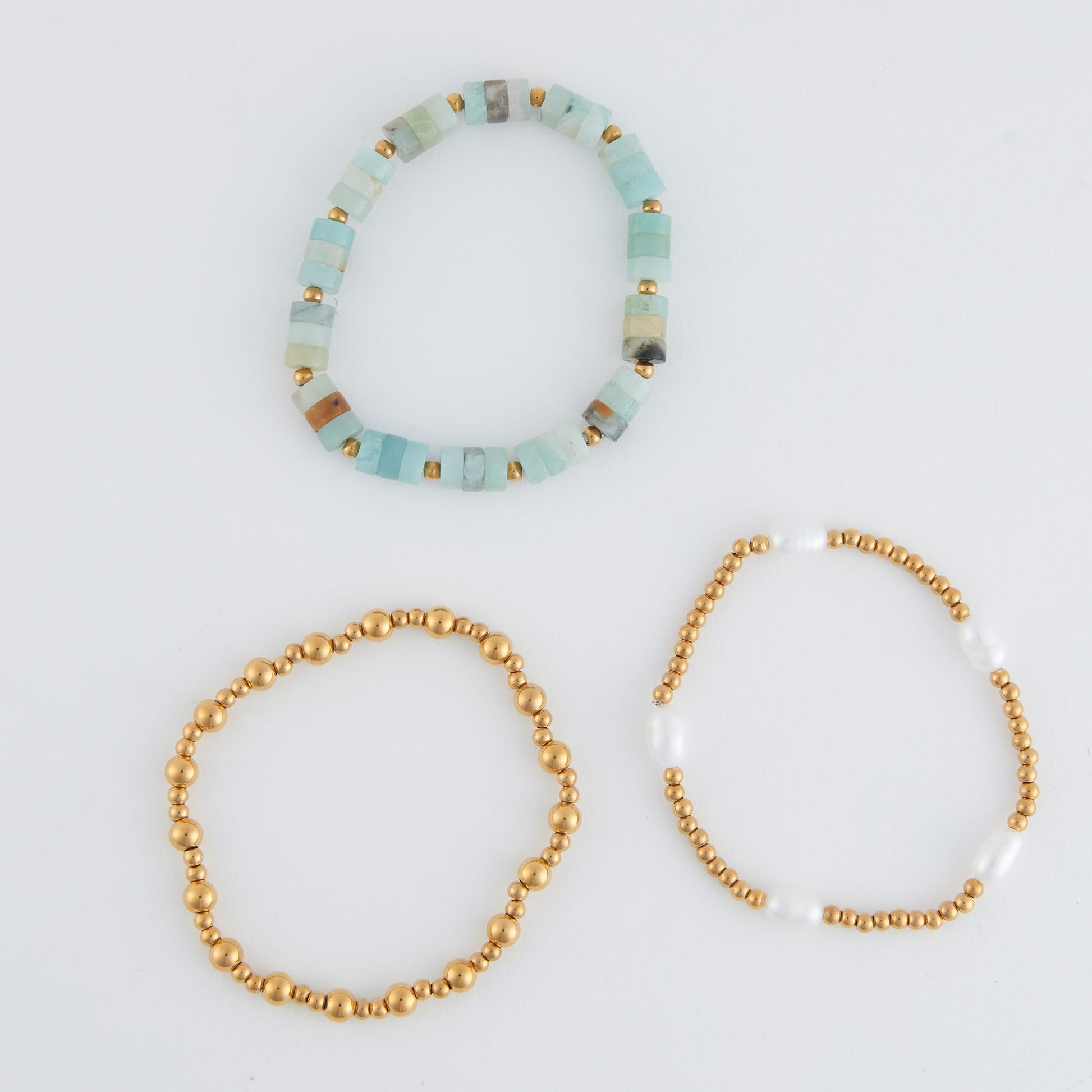 Love a layered look! Featuring two unique strands of 18k gold plated ball chains, one plain and one studded with pearls, and a third strand beaded with serene gray and blue stones, the Narelle Waterproof Pearl Bracelet Set is perfect for every day. Hypoallergenic, tarnish resistant with a lifetime color guarantee