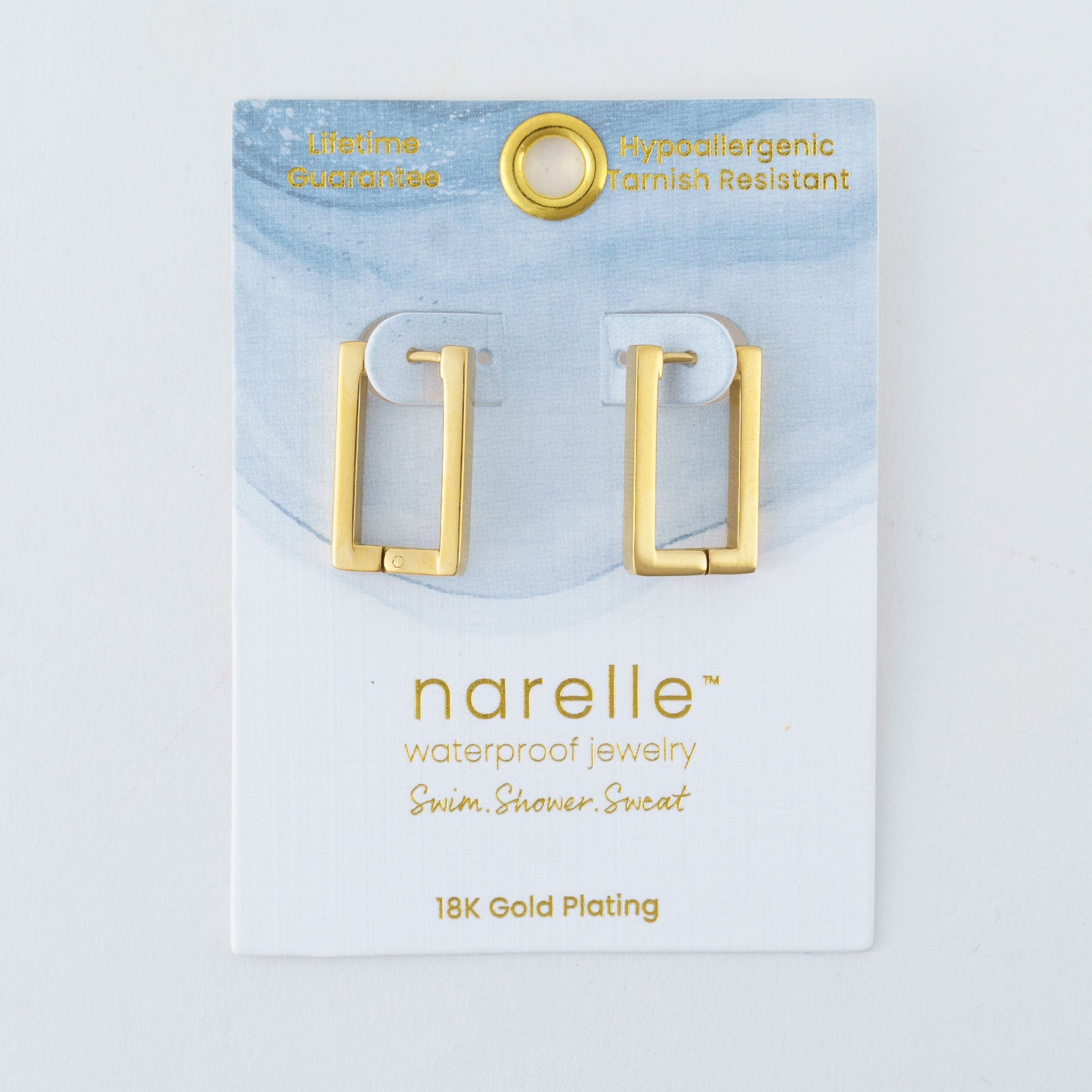 Chic and understated, the Narelle Waterproof Rectangle Hoop Earrings offer a trendy design in classic, goes-with-everything gold. With a familiar pin catch closure and effortless style, these earrings are an instant wardrobe staple. Waterproof , 18K gold plated and made with a specialized PVD technique to withstand the rigors of life, from swimming and showering to sweating through your most intense workouts, all without ever losing its shine.
