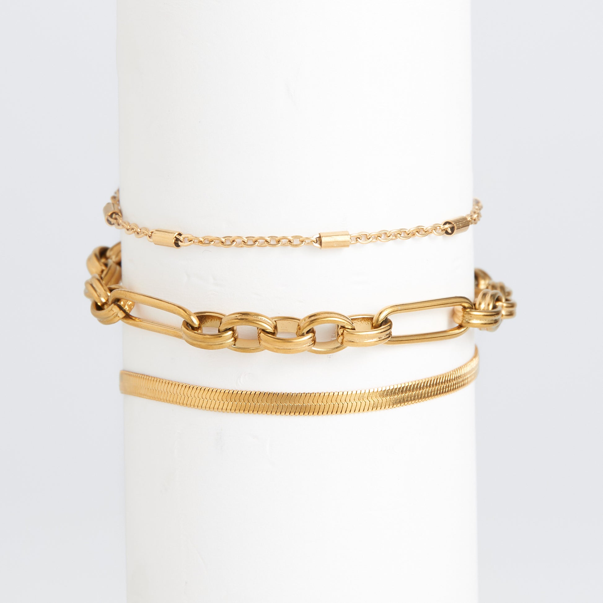 A modern take on classic designs! The Narelle Waterproof Snake Chain Bracelet Set offers three golden bracelets in trendy Paper Clip, Snake, and Dainty Chain designs. Wear them together as part of a stack, or on their own for a delicate, minimalist look. The styling options are endless! Waterproof , 18K gold plated and made with a specialized PVD technique to withstand the rigors of life, from swimming and showering to sweating through your most intense workouts, all without ever losing its shine.
