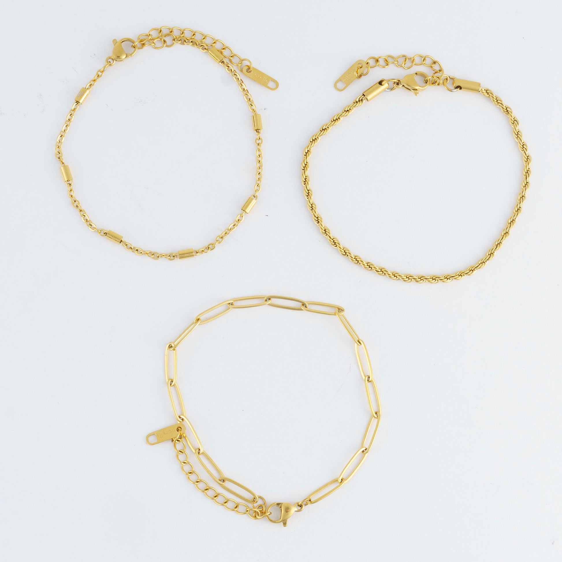 A modern take on classic designs! The Narelle Waterproof Twisted Chain Bracelet Set offers three golden bracelets in trendy Paper Clip, Twist, and Dainty Chain designs. Wear them together as part of a stack, or on their own for a delicate, minimalist look. They styling options are endless! Waterproof , 18K gold plated and made with a specialized PVD technique to withstand the rigors of life, from swimming and showering to sweating through your most intense workouts, all without ever losing its shine.