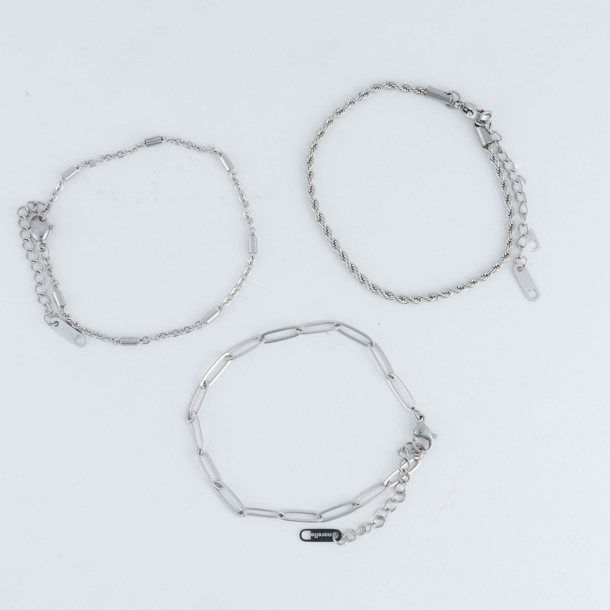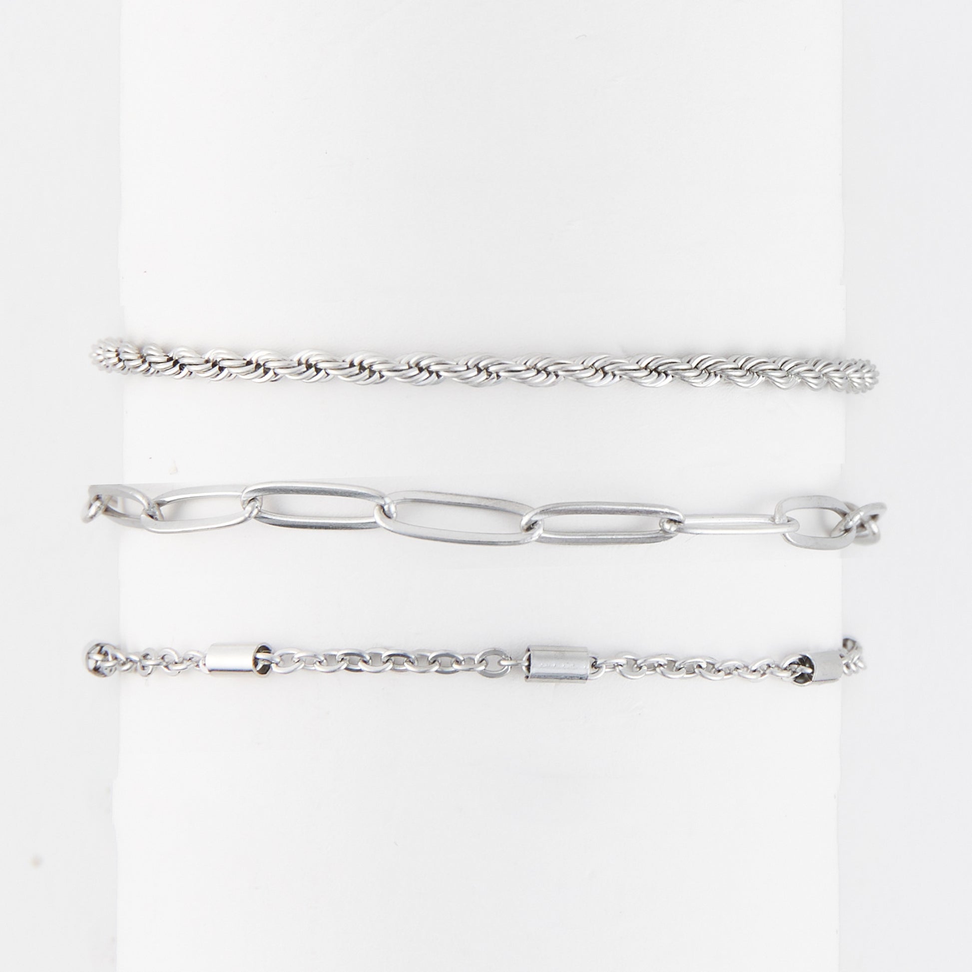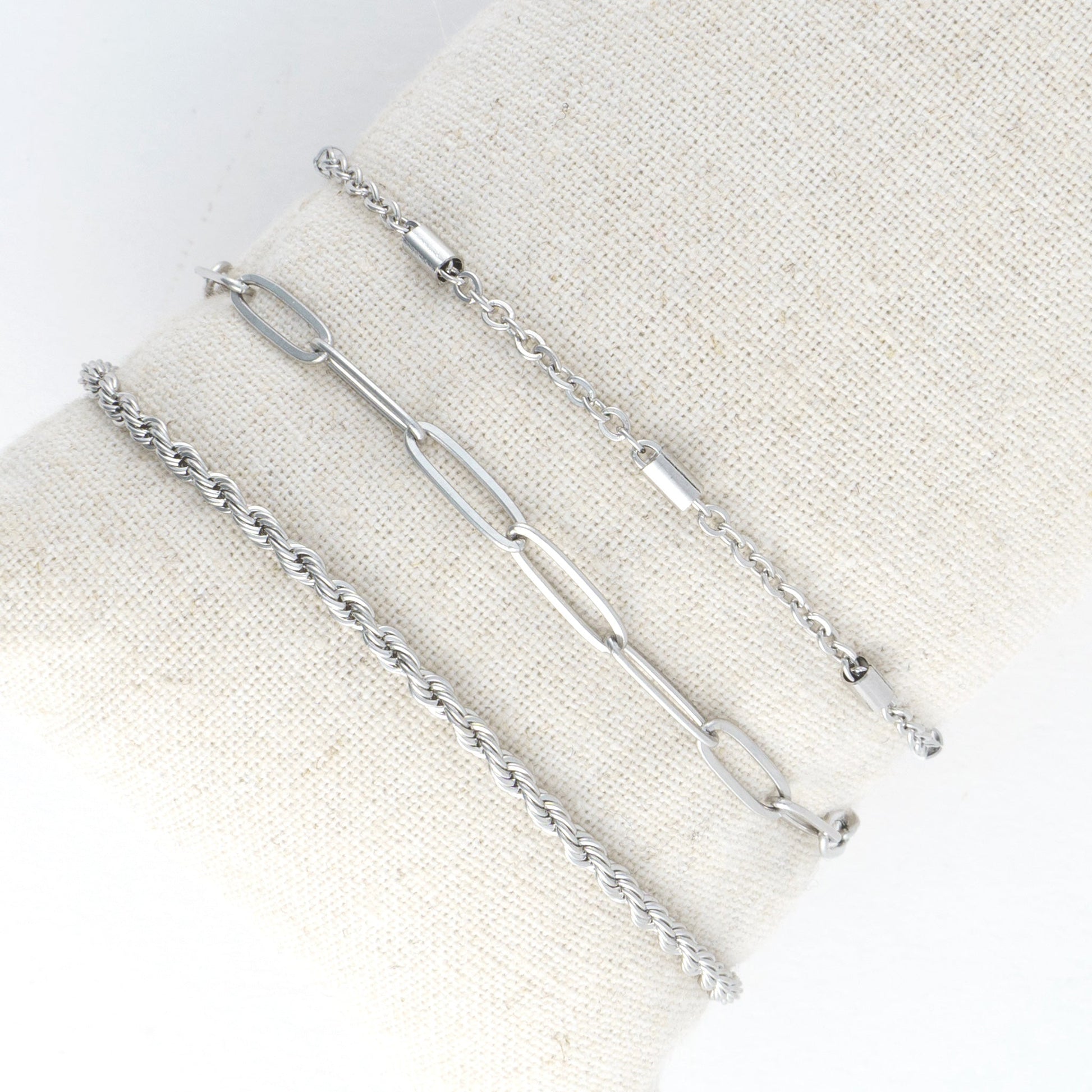 A modern take on classic designs! The Narelle Waterproof Twisted Chain Bracelet See offers three silver bracelets in trendy Paper Clip, Twist, and Dainty Chain designs. Wear them together as part of a stack, or on their own for a delicate, minimalist look. They styling options are endless! Waterproof , stainless steel plated and made with a specialized PVD technique to withstand the rigors of life, from swimming and showering to sweating through your most intense workouts, all without ever losing its shine.